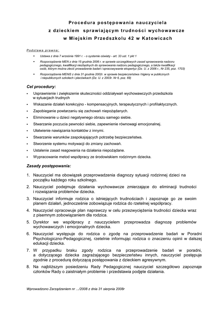 Procedura postępowania nauczyciela z dzieckiem sprawiającym trudności wychowawcze w Miejskim Przedszkolu 42 w Katowicach Podstawa prawna: Ustawa z dnia 7 września 1991 r. - o systemie oświaty - art. 33 ust. 1 pkt 1 Rozporządzenie MEN z dnia 15 grudnia 2006 r. w sprawie szczegółowych zasad sprawowania nadzoru pedagogicznego, kwalifikacji niezbędnych do sprawowania nadzoru pedagogicznego, a także kwalifikacji osób, którym można zlecić prowadzenie badań i opracowywanie ekspertyz (Dz. U. z 2006 r., Nr 235, poz. 1703) Rozporządzenia MENiS z dnia 31 grudnia 2002r. w sprawie bezpieczeństwa i higieny w publicznych i niepublicznych szkołach i placówkach (Dz. U. z 2003r. Nr 6, poz. 69) Cel procedury: Usprawnienie i zwiększenie skuteczności oddziaływań wychowawczych przedszkola w sytuacjach trudnych Wskazanie działań korekcyjno - kompensacyjnych, terapeutycznych i profilaktycznych. Zapobieganie powtarzaniu się zachowań niepożądanych. Eliminowanie u dzieci negatywnego obrazu samego siebie. Stwarzanie poczucia pewności siebie, zapewnienie równowagi emocjonalnej. Ułatwienie nawiązania kontaktów z innymi. Stwarzanie warunków zaspokajających potrzebę bezpieczeństwa. Stworzenie systemu motywacji do zmiany zachowań. Ustalenie zasad reagowania na działania niepożądane. Wypracowanie metod współpracy ze środowiskiem rodzinnym dziecka. Zasady postępowania: 1. Nauczyciel ma obowiązek przeprowadzenia diagnozy sytuacji rodzinnej dzieci na początku każdego roku szkolnego. 2. Nauczyciel podejmuje działania wychowawcze zmierzające do eliminacji trudności i rozwiązania problemów dziecka. 3. Nauczyciel informuje rodzica o istniejących trudnościach i zapoznaje go ze swoim planem działań, jednocześnie zobowiązuje rodzica do rzetelnej współpracy. 4. Nauczyciel opracowuje plan naprawczy w celu przezwyciężenia trudności dziecka wraz z pisemnym zobowiązaniem dla rodzica. 5. Dyrektor we współpracy z nauczycielem wychowawczych i emocjonalnych dziecka. przeprowadza diagnozę problemów 6. Nauczyciel występuje do rodzica o zgodę na przeprowadzenie badań w Poradni Psychologiczno-Pedagogicznej, rzetelnie informując rodzica o znaczeniu opinii w dalszej edukacji dziecka. 7. W przypadku braku zgody rodzica na przeprowadzenie badań w poradni, a dotyczącego dziecka zagrażającego bezpieczeństwu innych, nauczyciel postępuje zgodnie z procedurą dotyczącą postępowania z dzieckiem agresywnym. 8. Na najbliższym posiedzeniu Rady Pedagogicznej nauczyciel szczegółowo zapoznaje członków Rady o zaistniałym problemie i przedstawia podjęte działania. Wprowadzono Zarządzeniem nr .../2008 z dnia 31 sierpnia 2008r
