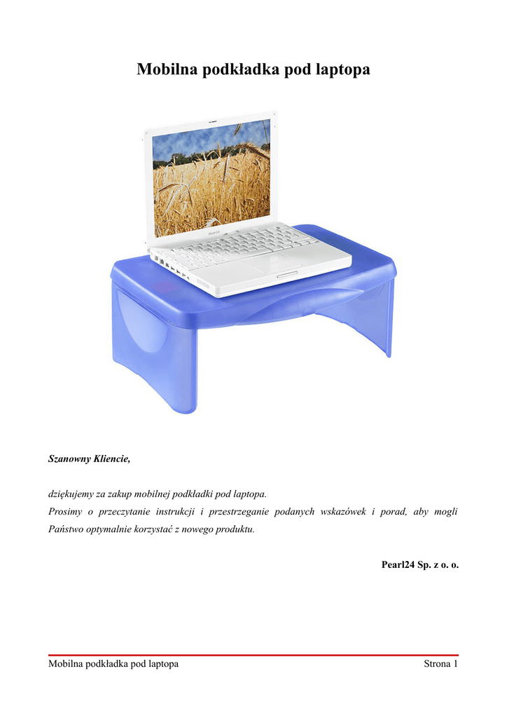 Mobilna podkładka pod laptopa Szanowny Kliencie, dziękujemy za zakup mobilnej podkładki pod laptopa. Prosimy o przeczytanie instrukcji i przestrzeganie podanych wskazówek i porad, aby mogli Państwo optymalnie korzystać z nowego produktu. Pearl24 Sp. z o. o. Mobilna podkładka pod laptopa Strona 1 • Praktyczna podstawka do netbooka lub notebooka • Wewnętrzne przedziałki: na długopisy, notatki, akcesoria • Składane nogi: mobilne biuro podczas podróży • Wykonana z wysokiej jakości tworzywa sztucznego • Wymiary: 45 x 33 x 19 cm, po złożeniu 5,5 cm wysokości. Wskazówki • Należy korzystać z produktu w sposób do tego przeznaczony. Każde inne użycie może spowodować uszkodzenie produktu lub jego otoczenia. • Wszelkie modyfikacje produktu obniżają poziom jego bezpieczeństwa. UWAGA! Istnieje ryzyko obrażeń! • Nie należy naprawiać produktu samodzielnie! • Zaleca się ostrożne obchodzenie się z produktem. Produkt może ulec uszkodzeniu w wyniku uderzenia, wstrząsów lub upadku nawet z niewielkiej wysokości. • Produkt należy trzymać z dala od wilgoci i wysokiej temperatury. • Wszelkie prawa do wprowadzania zmian technicznych oraz eliminacji błędów są zastrzeżone. Mobilna podkładka pod laptopa Strona 2
