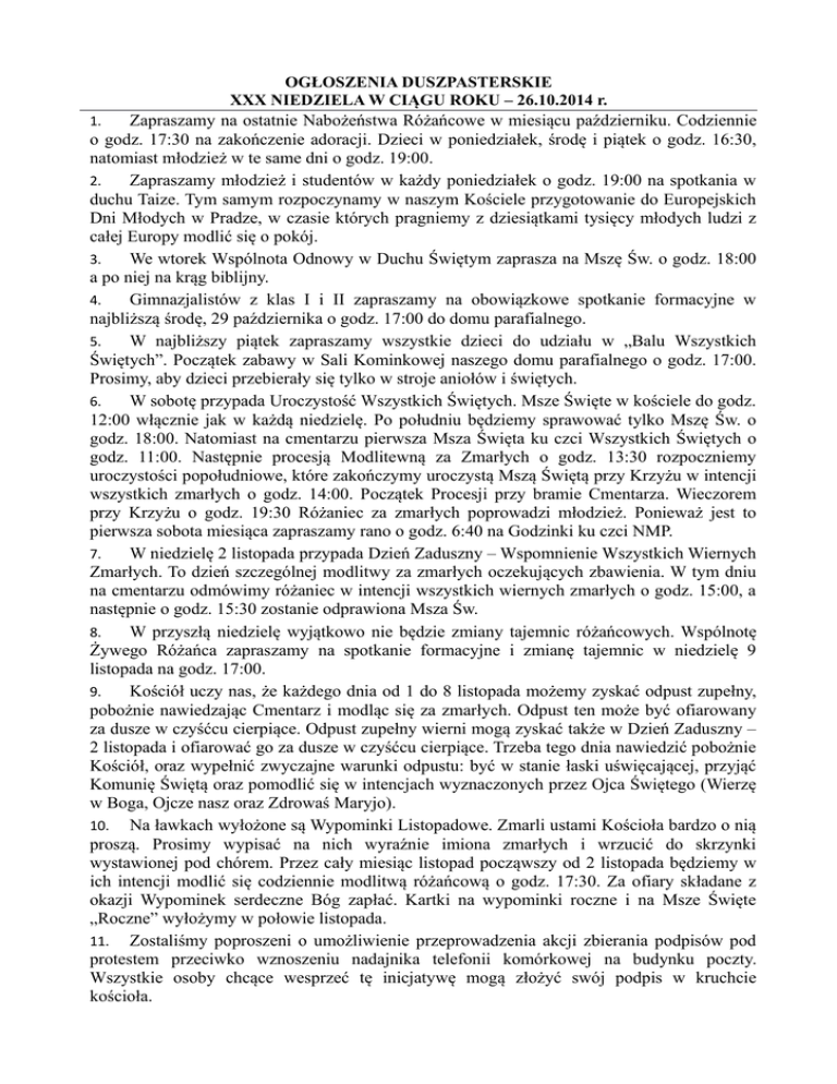 OGŁOSZENIA DUSZPASTERSKIE XXX NIEDZIELA W CIĄGU ROKU – 26.10.2014 r. 1. Zapraszamy na ostatnie Nabożeństwa Różańcowe w miesiącu październiku. Codziennie o godz. 17:30 na zakończenie adoracji. Dzieci w poniedziałek, środę i piątek o godz. 16:30, natomiast młodzież w te same dni o godz. 19:00. 2. Zapraszamy młodzież i studentów w każdy poniedziałek o godz. 19:00 na spotkania w duchu Taize. Tym samym rozpoczynamy w naszym Kościele przygotowanie do Europejskich Dni Młodych w Pradze, w czasie których pragniemy z dziesiątkami tysięcy młodych ludzi z całej Europy modlić się o pokój. 3. We wtorek Wspólnota Odnowy w Duchu Świętym zaprasza na Mszę Św. o godz. 18:00 a po niej na krąg biblijny. 4. Gimnazjalistów z klas I i II zapraszamy na obowiązkowe spotkanie formacyjne w najbliższą środę, 29 października o godz. 17:00 do domu parafialnego. 5. W najbliższy piątek zapraszamy wszystkie dzieci do udziału w „Balu Wszystkich Świętych”. Początek zabawy w Sali Kominkowej naszego domu parafialnego o godz. 17:00. Prosimy, aby dzieci przebierały się tylko w stroje aniołów i świętych. 6. W sobotę przypada Uroczystość Wszystkich Świętych. Msze Święte w kościele do godz. 12:00 włącznie jak w każdą niedzielę. Po południu będziemy sprawować tylko Mszę Św. o godz. 18:00. Natomiast na cmentarzu pierwsza Msza Święta ku czci Wszystkich Świętych o godz. 11:00. Następnie procesją Modlitewną za Zmarłych o godz. 13:30 rozpoczniemy uroczystości popołudniowe, które zakończymy uroczystą Mszą Świętą przy Krzyżu w intencji wszystkich zmarłych o godz. 14:00. Początek Procesji przy bramie Cmentarza. Wieczorem przy Krzyżu o godz. 19:30 Różaniec za zmarłych poprowadzi młodzież. Ponieważ jest to pierwsza sobota miesiąca zapraszamy rano o godz. 6:40 na Godzinki ku czci NMP. 7. W niedzielę 2 listopada przypada Dzień Zaduszny – Wspomnienie Wszystkich Wiernych Zmarłych. To dzień szczególnej modlitwy za zmarłych oczekujących zbawienia. W tym dniu na cmentarzu odmówimy różaniec w intencji wszystkich wiernych zmarłych o godz. 15:00, a następnie o godz. 15:30 zostanie odprawiona Msza Św. 8. W przyszłą niedzielę wyjątkowo nie będzie zmiany tajemnic różańcowych. Wspólnotę Żywego Różańca zapraszamy na spotkanie formacyjne i zmianę tajemnic w niedzielę 9 listopada na godz. 17:00. 9. Kościół uczy nas, że każdego dnia od 1 do 8 listopada możemy zyskać odpust zupełny, pobożnie nawiedzając Cmentarz i modląc się za zmarłych. Odpust ten może być ofiarowany za dusze w czyśćcu cierpiące. Odpust zupełny wierni mogą zyskać także w Dzień Zaduszny – 2 listopada i ofiarować go za dusze w czyśćcu cierpiące. Trzeba tego dnia nawiedzić pobożnie Kościół, oraz wypełnić zwyczajne warunki odpustu: być w stanie łaski uświęcającej, przyjąć Komunię Świętą oraz pomodlić się w intencjach wyznaczonych przez Ojca Świętego (Wierzę w Boga, Ojcze nasz oraz Zdrowaś Maryjo). 10. Na ławkach wyłożone są Wypominki Listopadowe. Zmarli ustami Kościoła bardzo o nią proszą. Prosimy wypisać na nich wyraźnie imiona zmarłych i wrzucić do skrzynki wystawionej pod chórem. Przez cały miesiąc listopad począwszy od 2 listopada będziemy w ich intencji modlić się codziennie modlitwą różańcową o godz. 17:30. Za ofiary składane z okazji Wypominek serdeczne Bóg zapłać. Kartki na wypominki roczne i na Msze Święte „Roczne” wyłożymy w połowie listopada. 11. Zostaliśmy poproszeni o umożliwienie przeprowadzenia akcji zbierania podpisów pod protestem przeciwko wznoszeniu nadajnika telefonii komórkowej na budynku poczty. Wszystkie osoby chcące wesprzeć tę inicjatywę mogą złożyć swój podpis w kruchcie kościoła. Jak co roku zapraszamy na jesienny kiermasz ogrodniczy do Centrum Edukacji Ogrodniczej dziś od godz. 10-14. 13. Taca z przyszłej niedzieli jest tacą budowlaną, za wszelkie ofiary składane na ten cel już teraz serdecznie dziękujemy. 14. Prasa katolicka jest do odebrania w zakrystii, a do nabycia jest nowy numer „Małego Gościa Niedzielnego”. Ryszard Szymanik – proboszcz. 12.
