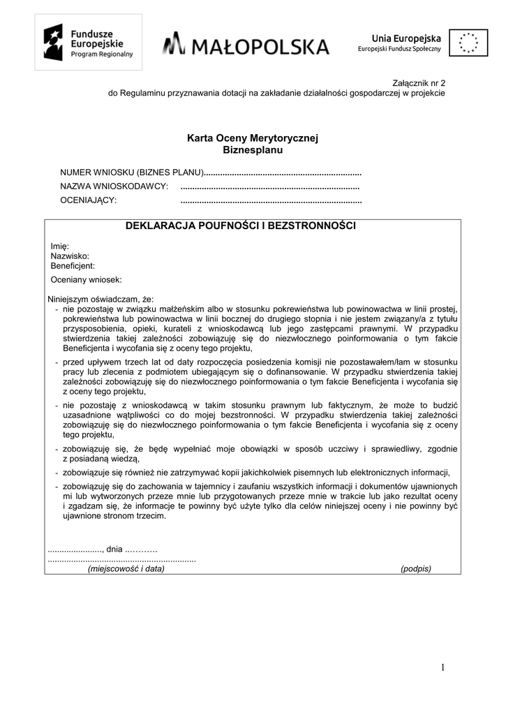 Załącznik nr 2 do Regulaminu przyznawania dotacji na zakładanie działalności gospodarczej w projekcie Karta Oceny Merytorycznej Biznesplanu NUMER WNIOSKU (BIZNES PLANU)................................................................... NAZWA WNIOSKODAWCY: ............................................................................ OCENIAJĄCY: ............................................................................. DEKLARACJA POUFNOŚCI I BEZSTRONNOŚCI Imię: Nazwisko: Beneficjent: Oceniany wniosek: Niniejszym oświadczam, że: - nie pozostaję w związku małżeńskim albo w stosunku pokrewieństwa lub powinowactwa w linii prostej, pokrewieństwa lub powinowactwa w linii bocznej do drugiego stopnia i nie jestem związany/a z tytułu przysposobienia, opieki, kurateli z wnioskodawcą lub jego zastępcami prawnymi. W przypadku stwierdzenia takiej zależności zobowiązuję się do niezwłocznego poinformowania o tym fakcie Beneficjenta i wycofania się z oceny tego projektu, - przed upływem trzech lat od daty rozpoczęcia posiedzenia komisji nie pozostawałem/łam w stosunku pracy lub zlecenia z podmiotem ubiegającym się o dofinansowanie. W przypadku stwierdzenia takiej zależności zobowiązuję się do niezwłocznego poinformowania o tym fakcie Beneficjenta i wycofania się z oceny tego projektu, - nie pozostaję z wnioskodawcą w takim stosunku prawnym lub faktycznym, że może to budzić uzasadnione wątpliwości co do mojej bezstronności. W przypadku stwierdzenia takiej zależności zobowiązuję się do niezwłocznego poinformowania o tym fakcie Beneficjenta i wycofania się z oceny tego projektu, - zobowiązuję się, że będę wypełniać moje obowiązki w sposób uczciwy i sprawiedliwy, zgodnie z posiadaną wiedzą, - zobowiązuje się również nie zatrzymywać kopii jakichkolwiek pisemnych lub elektronicznych informacji, - zobowiązuję się do zachowania w tajemnicy i zaufaniu wszystkich informacji i dokumentów ujawnionych mi lub wytworzonych przeze mnie lub przygotowanych przeze mnie w trakcie lub jako rezultat oceny i zgadzam się, że informacje te powinny być użyte tylko dla celów niniejszej oceny i nie powinny być ujawnione stronom trzecim. ......................., dnia ..………. ............................................................... (miejscowość i data)..................... (podpis) 1 A. 1. Czy Biznes Plan jest poprawny formalnie? Czy zostały wypełnione wszystkie pola w Biznes Planie? (każdorazowo zaznaczyć właściwe znakiem „X”) □ TAK □ NIE – wniosek jest odrzucony B. Kategoria Biznes Planu I Minimum: 25 pkt POMYSŁ NA BIZNES - ANALIZA MARKETINGOWA a Produkt Klienci i rynek b c d e II Minimum: 9 pkt III Minimum: 30 pkt IV Minimum: 6 pkt PYTANIE Promocja Główni konkurenci Analiza ograniczeń POTENCJAŁ WNIOSKODAWCY Beneficjent posiada wykształcenie, a wiedzę i doświadczenie do wdrożenia projektu Beneficjent dysponuje potencjałem b technicznym do wdrożenia projektu EFEKTYWNOŚĆ EKONOMICZNA PRZEDSIĘWZIĘCIA Przewidywane wydatki są uzasadnione a pod względem ekonomicznofinansowym b Wykonalność ekonomiczno-finansowa Prognoza finansowa c OPERACYJNOŚĆ I KOMPLETNOŚĆ Przejrzystość, prostota, zrozumiałość a założeń b Całościowość opisu przedsięwzięcia Przyznan a liczba punktów Maksymaln a liczba punktów (100) Uwagi/Komentarze 35 9 9 4 6 7 15 8 7 40 22 12 6 10 5 5 2 Suma uzyskanych punktów: Czy wniosek otrzymał wymagane minimum 70 punktów ogółem □ Czy wniosek uzyskał minimalną liczbę punktów w poszczególnych kategoriach oceny ŁĄCZNA LICZBA UZYSKANYCH /średnia arytmetyczna dwóch ocen/: □ TAK □ TAK NIE □ NIE PUNKTÓW Ile dodatkowych miejsc pracy uczestnik projektu deklaruje utworzyć? □ Utworzenie dodatkowego miejsca pracy oznacza zatrudnienie na podstawie umowy o pracę (w rozumieniu Kodeksu pracy) przynajmniej 1 pracownika. Stosunek pracy powinien być zawarty na co najmniej 3 miesiące i/lub wartość umowy powinna być równa lub wyższa trzykrotności minimalnego wynagrodzenia. Czy działalność zostanie założona w powiecie o niższym poziomie przedsiębiorczości (powiat limanowski, gorlicki, nowosądecki)? □ * 5 pkt = NIE = 0 pkt □ □ pkt TAK= 5 pkt OGÓŁEM LICZBA UZYSKANYCH PUNKTÓW C. CZY PROJEKT SPEŁNIA WYMAGANIA MINIMALNE, ABY UZYSKAĆ DOFINANSOWANIE? □ TAK □ NIE UZASADNIENIE OCENY PROJEKTU (MINIMUM 10 ZDAŃ) Kategoria I Kategoria II Kategoria III Kategoria IV Proponowana kwota dofinansowania: ............................................... (podpis) PLN ................................................ (data) 3