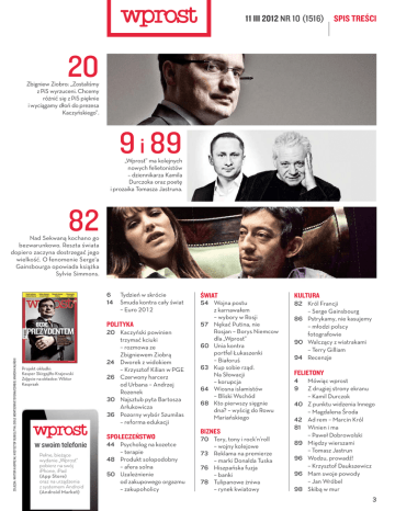 11 III 2012 NR 10 (1516) SPIS TREŚCI 20 Zbigniew Ziobro: „Zostaliśmy z PiS wyrzuceni. Chcemy różnić się z PiS pięknie i wyciągamy dłoń do prezesa Kaczyńskiego”. 9 i 89 „Wprost” ma kolejnych nowych felietonistów – dziennikarza Kamila Durczoka oraz poetę i prozaika Tomasza Jastruna. 82 Nad Sekwaną kochano go bezwarunkowo. Reszta świata dopiero zaczyna dostrzegać jego wielkość. O fenomenie Serge'a Gainsbourga opowiada książka Sylvie Simmons. 6 14 Tydzieńwskrócie Smudakontracałyświat –Euro ZDJĘCIA: WIKTOR KASPRZAK, KRZYSZTOF DUBIEL/TVN, ODILE MONTSERRAT/SYGMA/CORBIS, MARCIN KALIŃSKI POLITYKA Projekt okładki: Kasper Skirgajłło-Krajewski Zdjęcie na okładce: Wiktor Kasprzak 20 Kaczyńskipowinien trzymaćkciuki –rozmowaze ZbigniewemZiobrą 24 Dworekz widokiem –KrzysztofKilianw PGE 26 Czerwonyharcerz od Urbana–Andrzej Rozenek 30 NajsztubpytaBartosza Arłukowicza 36 PozornywybórSzumilas –reformaedukacji SPOŁECZEŃSTWO w swoim telefonie Pełne, bieżące wydanie „Wprost” pobierz na swój iPhone, iPad (App Store) oraz na urządzenia z systemem Android (Android Market) 44 Psychologna kozetce –terapie 48 Produktsolopodobny –aferasolna 50 Uzależnienie od zakupowegoorgazmu –zakupoholicy ŚWIAT KULTURA 54 Wojnapostu z karnawałem –wyboryw Rosji 57 NękaćPutinanie Rosjan–BorysNiemcow dla „Wprost” 60 Uniakontra portfelŁukaszenki –Białoruś 63 Kupsobierząd NaSłowacji –korupcja 64 Wiosnaislamistów –BliskiWschód 68 Ktopierwszysięgnie dna?–wyścigdo Rowu Mariańskiego 82 KrólFrancji –SergeGainsbourg 86 Pstrykamyniekasujemy –młodzipolscy fotografowie 90 Walczącyz wiatrakami –TerryGilliam 94 Recenzje BIZNES 70 Torytonyi rock’n’roll –wojnykolejowe 73 Reklamana premierze –markiDonaldaTuska 76 Hiszpańskafuzja –banki 78 Tulipanoweżniwa –rynekkwiatowy FELIETONY 4 9 40 42 81 89 96 96 98 Mówiącwprost Z drugiejstronyekranu –KamilDurczok Z punktuwidzeniaInnego –MagdalenaŚroda Adrem–MarcinKról Winieni ma –PawełDobrowolski Międzywierszami – TomaszJastrun Wodzuprowadź! –KrzysztofDaukszewicz Mamswojepowody –JanWróbel Skibąw mur 3