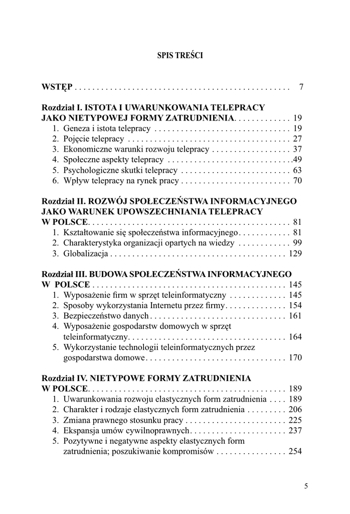 SPIS TREŚCI WSTĘP . . . . . . . . . . . . . . . . . . . . . . . . . . . . . . . . . . . . . . . . . . . . . . . . . 7 Rozdział I. ISTOTA I UWARUNKOWANIA TELEPRACY JAKO NIETYPOWEJ FORMY ZATRUDNIENIA. . . . . . . . . . . . . 19 1. Geneza i istota telepracy . . . . . . . . . . . . . . . . . . . . . . . . . . . . . . . 19 2. Pojęcie telepracy . . . . . . . . . . . . . . . . . . . . . . . . . . . . . . . . . . . . . 27 3. Ekonomiczne warunki rozwoju telepracy . . . . . . . . . . . . . . . . . . 37 4. Społeczne aspekty telepracy . . . . . . . . . . . . . . . . . . . . . . . . . . . . .49 5. Psychologiczne skutki telepracy . . . . . . . . . . . . . . . . . . . . . . . . . 63 6. Wpływ telepracy na rynek pracy . . . . . . . . . . . . . . . . . . . . . . . . . 70 Rozdział II. ROZWÓJ SPOŁECZEŃSTWA INFORMACYJNEGO JAKO WARUNEK UPOWSZECHNIANIA TELEPRACY W POLSCE. . . . . . . . . . . . . . . . . . . . . . . . . . . . . . . . . . . . . . . . . . . . . . 81 1. Kształtowanie się społeczeństwa informacyjnego. . . . . . . . . . . . 81 2. Charakterystyka organizacji opartych na wiedzy . . . . . . . . . . . . 99 3. Globalizacja . . . . . . . . . . . . . . . . . . . . . . . . . . . . . . . . . . . . . . . . 129 Rozdział III. BUDOWA SPOŁECZEŃSTWA INFORMACYJNEGO W POLSCE . . . . . . . . . . . . . . . . . . . . . . . . . . . . . . . . . . . . . . . . . . . . 145 1. Wyposażenie firm w sprzęt teleinformatyczny . . . . . . . . . . . . . 145 2. Sposoby wykorzystania Internetu przez firmy. . . . . . . . . . . . . . 154 3. Bezpieczeństwo danych . . . . . . . . . . . . . . . . . . . . . . . . . . . . . . . 161 4. Wyposażenie gospodarstw domowych w sprzęt teleinformatyczny. . . . . . . . . . . . . . . . . . . . . . . . . . . . . . . . . . . . 164 5. Wykorzystanie technologii teleinformatycznych przez gospodarstwa domowe. . . . . . . . . . . . . . . . . . . . . . . . . . . . . . . . 170 Rozdział IV. NIETYPOWE FORMY ZATRUDNIENIA W POLSCE. . . . . . . . . . . . . . . . . . . . . . . . . . . . . . . . . . . . . . . . . . . . . 1. Uwarunkowania rozwoju elastycznych form zatrudnienia . . . . 2. Charakter i rodzaje elastycznych form zatrudnienia . . . . . . . . . 3. Zmiana prawnego stosunku pracy . . . . . . . . . . . . . . . . . . . . . . . 4. Ekspansja umów cywilnoprawnych. . . . . . . . . . . . . . . . . . . . . . 5. Pozytywne i negatywne aspekty elastycznych form zatrudnienia; poszukiwanie kompromisów . . . . . . . . . . . . . . . . 189 189 206 225 237 254 5 Spis treści Rozdział V. ROZWÓJ TELEPRACY W UNII EUROPEJSKIEJ I POLSCE . . . . . . . . . . . . . . . . . . . . . . . . . . . . . . . . . . . . . . . . . . . . . . 1. Regulacje wspólnotowe telepracy . . . . . . . . . . . . . . . . . . . . . . . 2. Skala i struktura telepracy w Unii Europejskiej. . . . . . . . . . . . . 3. Zakres stosowania telepracy w Polsce . . . . . . . . . . . . . . . . . . . . 4. Telepraca szansą dla niepełnosprawnych i kobiet na polskim rynku pracy . . . . . . . . . . . . . . . . . . . . . . . . . . . . . . . . . . . . . . . . 271 271 287 303 328 Rozdział VI. REGULACJE TELEPRACY W POLSCE . . . . . . . . 1. Kształtowanie podstaw prawnych telepracy . . . . . . . . . . . . . . . 2. Telepraca na podstawie stosunku pracy . . . . . . . . . . . . . . . . . . . 3. Tryb wprowadzania i zaprzestania telepracy . . . . . . . . . . . . . . . 4. Obowiązki pracodawcy związane z telepracą . . . . . . . . . . . . . . 5. Bezpieczeństwo i higiena pracy. . . . . . . . . . . . . . . . . . . . . . . . . 6. Obowiązki i kontrola telepracownika . . . . . . . . . . . . . . . . . . . . 7. Kierunki zmiany prawa w zakresie telepracy . . . . . . . . . . . . . . 339 339 343 361 376 388 398 417 Rozdział VII. TELEPRACA JAKO SPOSÓB AKTYWIZACJI ZAWODOWEJ BEZROBOTNYCH . . . . . . . . . . . . . . . . . . . . . . . . 1. Czynniki wpływające na sytuację rynku pracy w Polsce . . . . . 2. Zatrudnienie i bezrobocie w 2013 r.. . . . . . . . . . . . . . . . . . . . . . 3. Strategie przeciwdziałania bezrobociu. . . . . . . . . . . . . . . . . . . . 4. Ogólna charakterystyka szczególnych kategorii bezrobotnych . 5. Ludzie młodzi . . . . . . . . . . . . . . . . . . . . . . . . . . . . . . . . . . . . . . 6. Kobiety. . . . . . . . . . . . . . . . . . . . . . . . . . . . . . . . . . . . . . . . . . . . 7. Osoby w starszym wieku . . . . . . . . . . . . . . . . . . . . . . . . . . . . . . 8. Niepełnosprawni . . . . . . . . . . . . . . . . . . . . . . . . . . . . . . . . . . . . 427 427 437 445 454 458 465 475 485 Rozdział VIII. BADANIA EMPIRYCZNE TELEPRACY . . . . . . 1. Cel i metoda badań. . . . . . . . . . . . . . . . . . . . . . . . . . . . . . . . . . . 2. Charakterystyka respondentów . . . . . . . . . . . . . . . . . . . . . . . . . 3. Warunki zatrudnienia w formule telepracy . . . . . . . . . . . . . . . . 4. Zalety telepracy . . . . . . . . . . . . . . . . . . . . . . . . . . . . . . . . . . . . . 5. Wady telepracy. . . . . . . . . . . . . . . . . . . . . . . . . . . . . . . . . . . . . . 6. Regulacje prawne telepracy . . . . . . . . . . . . . . . . . . . . . . . . . . . . 7. Perspektywy rozwoju telepracy . . . . . . . . . . . . . . . . . . . . . . . . . 495 495 499 505 512 523 530 537 ZAKOŃCZENIE . . . . . . . . . . . . . . . . . . . . . . . . . . . . . . . . . . . . . . . . 555 BIBLIOGRAFIA . . . . . . . . . . . . . . . . . . . . . . . . . . . . . . . . . . . . . . . . 565 INDEKS OSÓB . . . . . . . . . . . . . . . . . . . . . . . . . . . . . . . . . . . . . . . . . . . .
