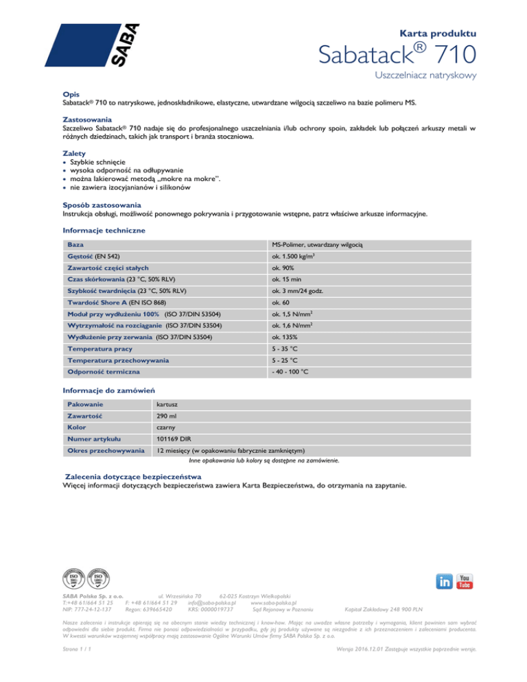 Karta produktu Sabatack® 710 Uszczelniacz natryskowy Opis Sabatack® 710 to natryskowe, jednoskładnikowe, elastyczne, utwardzane wilgocią szczeliwo na bazie polimeru MS. Zastosowania Szczeliwo Sabatack® 710 nadaje się do profesjonalnego uszczelniania i/lub ochrony spoin, zakładek lub połączeń arkuszy metali w różnych dziedzinach, takich jak transport i branża stoczniowa. Zalety Szybkie schnięcie wysoka odporność na odłupywanie można lakierować metodą „mokre na mokre”. nie zawiera izocyjanianów i silikonów Sposób zastosowania Instrukcja obsługi, możliwość ponownego pokrywania i przygotowanie wstępne, patrz właściwe arkusze informacyjne. Informacje techniczne Baza MS-Polimer, utwardzany wilgocią Gęstość (EN 542) ok. 1.500 kg/m3 Zawartość części stałych ok. 90% Czas skórkowania (23 °C, 50% RLV) ok. 15 min Szybkość twardnięcia (23 °C, 50% RLV) ok. 3 mm/24 godz. Twardość Shore A (EN ISO 868) ok. 60 Moduł przy wydłużeniu 100% (ISO 37/DIN 53504) ok. 1,5 N/mm2 Wytrzymałość na rozciąganie (ISO 37/DIN 53504) ok. 1,6 N/mm2 Wydłużenie przy zerwania (ISO 37/DIN 53504) ok. 135% Temperatura pracy 5 - 35 °C Temperatura przechowywania 5 - 25 °C Odporność termiczna - 40 - 100 °C Informacje do zamówień Pakowanie kartusz Zawartość 290 ml Kolor czarny Numer artykułu 101169 DIR Okres przechowywania 12 miesięcy (w opakowaniu fabrycznie zamkniętym) Inne opakowania lub kolory są dostępne na zamówienie. Zalecenia dotyczące bezpieczeństwa Więcej informacji dotyczących bezpieczeństwa zawiera Karta Bezpieczeństwa, do otrzymania na zapytanie. SABA Polska Sp. z o.o. ul. Wrzesińska 70 62-025 Kostrzyn Wielkopolski T:+48 61/664 51 25 F: +48 61/664 51 29 [email protected] www.saba-polska.pl NIP: 777-24-12-137 Regon: 639665420 KRS: 0000019737 Sąd Rejonowy w Poznaniu Kapitał Zakładowy 248 900 PLN Nasze zalecenia i instrukcje opierają się na obecnym stanie wiedzy technicznej i know-how. Mając na uwadze własne potrzeby i wymagania, klient powinien sam wybrać odpowiedni dla siebie produkt. Firma nie ponosi odpowiedzialności w przypadku, gdy jej produkty używane są niezgodnie z ich przeznaczeniem i zaleceniami producenta. W kwestii warunków wzajemnej współpracy mają zastosowanie Ogólne Warunki Umów firmy SABA Polska Sp. z o.o. Strona 1 / 1 Wersja 2016.12.01 Zastępuje wszystkie poprzednie wersje.