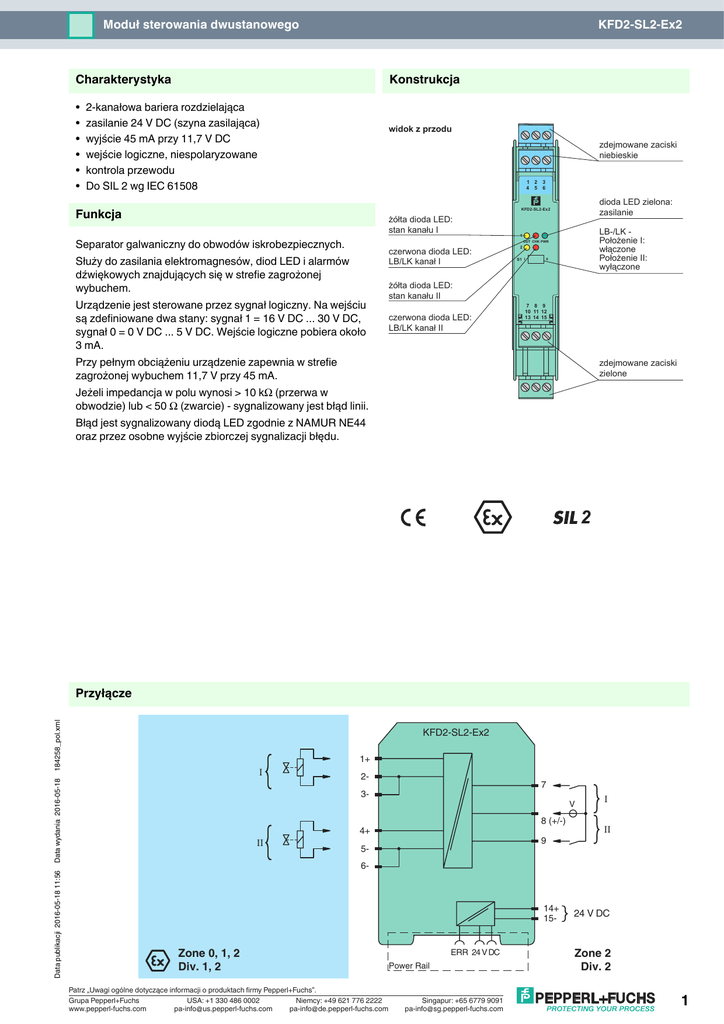 Moduł sterowania dwustanowego KFD2-SL2-Ex2 Konstrukcja Charakterystyka • • • • • • 2-kanałowa bariera rozdzielająca zasilanie 24 V DC (szyna zasilająca) wyjście 45 mA przy 11,7 V DC wejście logiczne, niespolaryzowane kontrola przewodu Do SIL 2 wg IEC 61508 widok z przodu zdejmowane zaciski niebieskie 1 2 4 5 Funkcja 3 6 dioda LED zielona: zasilanie KFD2-SL2-Ex2 żółta dioda LED: stan kanału I Separator galwaniczny do obwodów iskrobezpiecznych. LB-/LK Położenie I: włączone Położenie II: wyłączone 1 OUT CHK PWR czerwona dioda LED: LB/LK kanał I Służy do zasilania elektromagnesów, diod LED i alarmów dźwiękowych znajdujących się w strefie zagrożonej wybuchem. Urządzenie jest sterowane przez sygnał logiczny. Na wejściu są zdefiniowane dwa stany: sygnał 1 = 16 V DC ... 30 V DC, sygnał 0 = 0 V DC ... 5 V DC. Wejście logiczne pobiera około 3 mA. 2 S1 I II żółta dioda LED: stan kanału II czerwona dioda LED: LB/LK kanał II 7 8 9 10 11 12 13 14 15 Przy pełnym obciążeniu urządzenie zapewnia w strefie zagrożonej wybuchem 11,7 V przy 45 mA. zdejmowane zaciski zielone Jeżeli impedancja w polu wynosi > 10 kΩ (przerwa w obwodzie) lub < 50 Ω (zwarcie) - sygnalizowany jest błąd linii. Błąd jest sygnalizowany diodą LED zgodnie z NAMUR NE44 oraz przez osobne wyjście zbiorczej sygnalizacji błędu. 2 Data publikacji 2016-05-18 11:56 Data wydania 2016-05-18 184258_pol.xml Przyłącze KFD2-SL2-Ex2 1+ I 2- 7 3- II V 8 (+/-) 4+ 9 5- I II 6- 14+ 15- Zone 0, 1, 2 Div. 1, 2 Patrz „Uwagi ogólne dotyczące informacji o produktach firmy Pepperl+Fuchs”. Grupa Pepperl+Fuchs USA: +1 330 486 0002 Niemcy: +49 621 776 2222 www.pepperl-fuchs.com [email protected] [email protected] ERR 24 V DC Power Rail Singapur: +65 6779 9091 [email protected] 24 V DC Zone 2 Div. 2 1 Dane techniczne KFD2-SL2-Ex2 Dane ogólne typ sygnału Wyjżcie binarne Zasilanie Przyłącze Napięcie znamionowe Pobór mocy szyna zasilająca lub zaciski 14+, 15Un 20 ... 30 V DC ≤ 3,3 W przy prądzie wyjściowym 45 mA wejście Przyłącze zaciski 7, 8, 9 prąd wejściowy ok. 3 mA przy 24 V DC poziom sygnału sygnał 1: 16 ... 30 V DC sygnał 0: 0 ... 5 V DC Wyjście Przyłącze oporność wewnętrzna Prąd Napięcie Napięcie pracy jałowej Sygnał wyjżciowy kanał 1: zaciski 1+, 2-, 3 kanał 2: zaciski 4+, 5-, 6Ri 272 Ω Ue ≥ 11,7 V Ie ≤ 45 mA Us ≥ 24 V Wartości obowiązują dla znamionowego napięcia pracy 20 ... 30 V DC. Opóżnienie przyciągania / opadania kotwiczki ≤ 20 ms / ≤ 20 ms Kontrola usterki przewodu sygnał przy zwarciu (RB < 50 Ω, lead breakage R> 10 kΩ) , prąd testowy < 650 µA Izolacja elektryczna wejście / wyjście wzmocniona izolacja zgodnie z normą IEC/EN 61010-1, napięcie znamionowe izolacji 300 Veff wejście / zasilanie wzmocniona izolacja zgodnie z normą IEC/EN 61010-1, napięcie znamionowe izolacji 300 Veff Zasilanie / wyjżcie wzmocniona izolacja zgodnie z normą IEC/EN 61010-1, napięcie znamionowe izolacji 300 Veff Zgodność z dyrektywami Kompatybilność elektromagnetyczna Dyrektywa 2014/30/UE EN 61326-1:2013 (lokalizacja ośrodków przemysłowych) Zgodnożć Kompatybilność elektromagnetyczna NE 21:2006 Stopień ochrony IEC 60529:2001 zabezpieczenie przed porażeniem elektrycznym EN 61010-1:2010 Warunki otoczenia Temperatura otoczenia -20 ... 50 °C (-4 ... 122 °F) Specyfikacja mechaniczna Stopień ochrony IP 20 Masa ok. 150 g Wymiary 20 × 119 × 115 mm , typ obudowy B2 Dane dotyczące stosowania w obszarach Ex Certyfikat badania typu WE ZELM 00 ATEX 0024 Grupa, kategoria, stopień ochrony przed zapłonem Data publikacji 2016-05-18 11:56 Data wydania 2016-05-18 184258_pol.xml Wyjście Napięcie Prąd Zasilanie Zasilanie ¬ II (1)G [Ex ia Ga] IIC ¬ II (1)D [Ex ia Da] IIIC ¬ I (M1) [Ex ia Ma] I Ex ia Uo 28 V Po 770 mW (charakterystyka liniowa) Io 110 mA maksymalne napięcie bezpieczne Um 40 V (Uwaga! Napięcie znamionowe może być mniejsze) maksymalne napięcie bezpieczne Um 60 V (Uwaga! Napięcie znamionowe może być mniejsze) wejście zbiorczy komunikat o błędzie maksymalne napięcie bezpieczne Um Deklaracja zgodności Grupa, kategoria, typ ochrony, klasa temperaturowa 40 V (Uwaga! Napięcie znamionowe może być mniejsze) TÜV 02 ATEX 1820 X ¬ II 3G Ex nA IIC T4 Gc Izolacja elektryczna wejście / wyjście bezpiecznie rozdzielone galwanicznie wg normy IEC/EN 60079-11, wartość szczytowa napięcia 375 V Wyjżcie / zasilanie bezpiecznie rozdzielone galwanicznie wg normy IEC/EN 60079-11, wartość szczytowa napięcia 375 V Zgodność z dyrektywami Dyrektywa 2014/34/UE EN 60079-0:2012+A11:2013 , EN 60079-11:2012 , EN 60079-15:2010 , EN 60079-26:2007 , EN 50303:2000 Atesty międzynarodowe Atest FM Patrz „Uwagi ogólne dotyczące informacji o produktach firmy Pepperl+Fuchs”. Grupa Pepperl+Fuchs USA: +1 330 486 0002 Niemcy: +49 621 776 2222 www.pepperl-fuchs.com [email protected] [email protected] Singapur: +65 6779 9091 [email protected] 2 Dane techniczne Schemat montażowy KFD2-SL2-Ex2 16-548FM-12 Atest IECEx IECEx TUN 04.0001 Zatwierdzono dla [Ex ia Ga] IIC, [Ex ia Da] IIIC, [Ex ia Ma] I Informacje ogólne Informacja uzupełniająca Stosownie do wymagań należy przestrzegać certyfikatów badania typu WE, informacji na temat zgodności, deklaracji zgodności, atestów zgodności i instrukcji. Aby uzyskać więcej informacji, zob. www.pepperlfuchs.com. Charakterystyki wyjściowe Schemat obwodu wyjściowego Charakterystyka wyjściowa U Ri Us Us Ue Ie I Akcesoria Moduł dostarczania prądu stałego KFD2-EB2 Ten moduł dostarczania prądu stałego jest wykorzystywany do łączenia urządzeń 24 V DC za pomocą szyny zasilania. Wyposażony w bezpiecznik moduł dostarczania prądu stałego może obsługiwać do 150 pojedynczych urządzeń, w zależności od poziomu zużycia energii przez poszczególne urządzenia. Styki mechaniczne z galwaniczną izolacją używają szyny zasilania do przekazywania zebranych komunikatów błędów