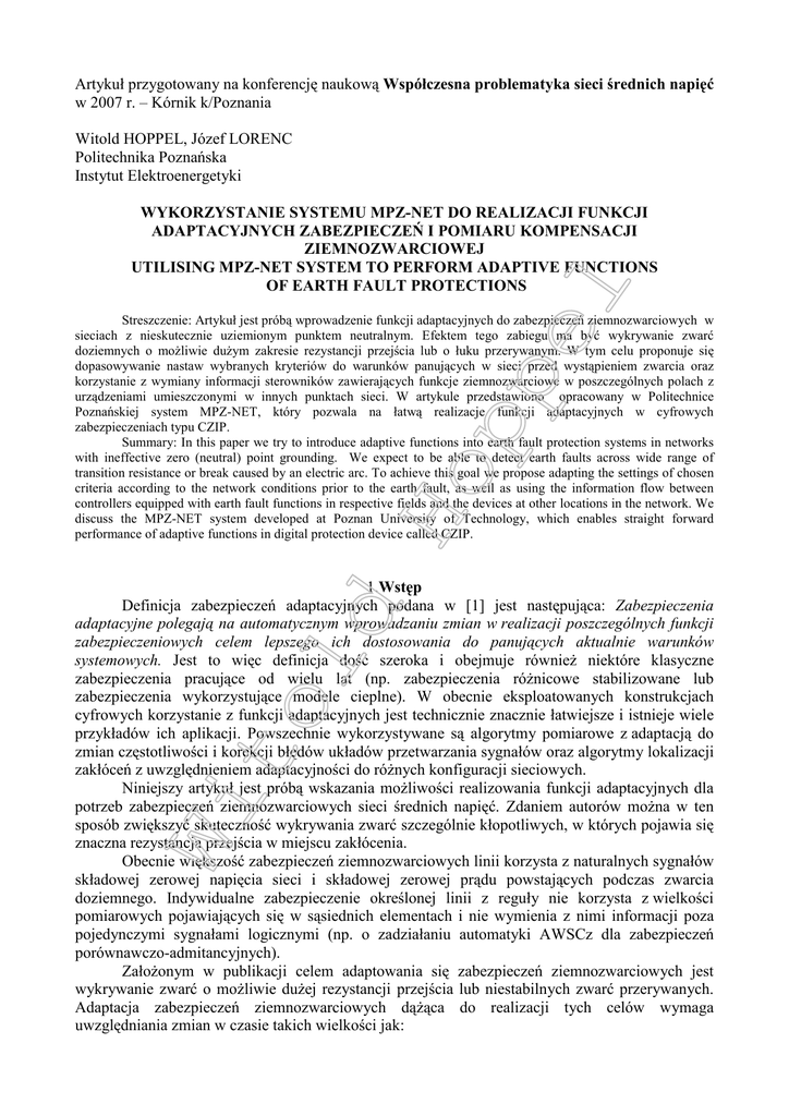 Artykuł przygotowany na konferencję naukową Współczesna problematyka sieci średnich napięć w 2007 r. – Kórnik k/Poznania Witold HOPPEL, Józef LORENC Politechnika Poznańska Instytut Elektroenergetyki WYKORZYSTANIE SYSTEMU MPZ-NET DO REALIZACJI FUNKCJI ADAPTACYJNYCH ZABEZPIECZEŃ I POMIARU KOMPENSACJI ZIEMNOZWARCIOWEJ UTILISING MPZ-NET SYSTEM TO PERFORM ADAPTIVE FUNCTIONS OF EARTH FAULT PROTECTIONS Streszczenie: Artykuł jest próbą wprowadzenie funkcji adaptacyjnych do zabezpieczeń ziemnozwarciowych w sieciach z nieskutecznie uziemionym punktem neutralnym. Efektem tego zabiegu ma być wykrywanie zwarć doziemnych o możliwie dużym zakresie rezystancji przejścia lub o łuku przerywanym. W tym celu proponuje się dopasowywanie nastaw wybranych kryteriów do warunków panujących w sieci przed wystąpieniem zwarcia oraz korzystanie z wymiany informacji sterowników zawierających funkcje ziemnozwarciowe w poszczególnych polach z urządzeniami umieszczonymi w innych punktach sieci. W artykule przedstawiono opracowany w Politechnice Poznańskiej system MPZ-NET, który pozwala na łatwą realizacje funkcji adaptacyjnych w cyfrowych zabezpieczeniach typu CZIP. Summary: In this paper we try to introduce adaptive functions into earth fault protection systems in networks with ineffective zero (neutral) point grounding. We expect to be able to detect earth faults across wide range of transition resistance or break caused by an electric arc. To achieve this goal we propose adapting the settings of chosen criteria according to the network conditions prior to the earth fault, as well as using the information flow between controllers equipped with earth fault functions in respective fields and the devices at other locations in the network. We discuss the MPZ-NET system developed at Poznan University of Technology, which enables straight forward performance of adaptive functions in digital protection device called CZIP. 1.Wstęp Definicja zabezpieczeń adaptacyjnych podana w [1] jest następująca: Zabezpieczenia adaptacyjne polegają na automatycznym wprowadzaniu zmian w realizacji poszczególnych funkcji zabezpieczeniowych celem lepszego ich dostosowania do panujących aktualnie warunków systemowych. Jest to więc definicja dość szeroka i obejmuje również niektóre klasyczne zabezpieczenia pracujące od wielu lat (np. zabezpieczenia różnicowe stabilizowane lub zabezpieczenia wykorzystujące modele cieplne). W obecnie eksploatowanych konstrukcjach cyfrowych korzystanie z funkcji adaptacyjnych jest technicznie znacznie łatwiejsze i istnieje wiele przykładów ich aplikacji. Powszechnie wykorzystywane są algorytmy pomiarowe z adaptacją do zmian częstotliwości i korekcji błędów układów przetwarzania sygnałów oraz algorytmy lokalizacji zakłóceń z uwzględnieniem adaptacyjności do różnych konfiguracji sieciowych. Niniejszy artykuł jest próbą wskazania możliwości realizowania funkcji adaptacyjnych dla potrzeb zabezpieczeń ziemnozwarciowych sieci średnich napięć. Zdaniem autorów można w ten sposób zwiększyć skuteczność wykrywania zwarć szczególnie kłopotliwych, w których pojawia się znaczna rezystancja przejścia w miejscu zakłócenia. Obecnie większość zabezpieczeń ziemnozwarciowych linii korzysta z naturalnych sygnałów składowej zerowej napięcia sieci i składowej zerowej prądu powstających podczas zwarcia doziemnego. Indywidualne zabezpieczenie określonej linii z reguły nie korzysta z wielkości pomiarowych pojawiających się w sąsiednich elementach i nie wymienia z nimi informacji poza pojedynczymi sygnałami logicznymi (np. o zadziałaniu automatyki AWSCz dla zabezpieczeń porównawczo-admitancyjnych). Założonym w publikacji celem adaptowania się zabezpieczeń ziemnozwarciowych jest wykrywanie zwarć o możliwie dużej rezystancji przejścia lub niestabilnych zwarć przerywanych. Adaptacja zabezpieczeń ziemnozwarciowych dążąca do realizacji tych celów wymaga uwzględniania zmian w czasie takich wielkości jak: - uchyby pomiarowe w obwodach składowych zerowych linii, - admitancja doziemna linii, - admitancja uziemienia punktu neutralnego sieci, - napięcie naturalnej asymetrii doziemnej sieci. Na temat uchybów pomiarowych brak jest pewnych i szczegółowych danych. W doborze nastaw dla poszczególnych kryteriów działania zabezpieczeń ziemnozwarciowych uwzględnia się szacowany poziom uchybów w zależności od zastosowanego filtru składowej zerowej prądu. Pomija się w analizach problem uchybów filtrów składowych zerowych napięcia, których wpływ jest minimalny. Nie wchodząc w szczegóły związane ze sposobami pracy punktu neutralnego sieci, można podzielić kryteria ziemnozwarciowe [2-4] na dwie grupy : a) silnie reagujące na wartość rezystancji przejścia w miejscu zwarcia, b) praktycznie nie reagujące na wartość rezystancji przejścia. Do grupy „a” należą przede wszystkim rozwiązania jednowielkościowe takie jak zerowoprądowe lub zerowonapięciowe. Grupę „b” reprezentują układy wykorzystujące obie wielkości pomiarowe (I0 i U0) , których typowym przykładem są zabezpieczenia admitancyjne. Należy jednak zaznaczyć, że kryteria admitancyjne są uaktywniane członem zerowonapięciowym i w związku z tym ich niezależność czułości od rezystancji przejścia jest ograniczona wartością nastawczą takiego członu napięciowego Dla typowych zabezpieczeń obowiązuje zasada, że im większa nastawa – tym mniejsza czułość czasem uniemożliwiająca całkowicie działanie kryterium, a im nastawa mniejsza – tym czułość lepsza, ale przy zbyt małej nastawie mogą pojawić się zadziałania zbędne. Wraz z działaniami brakującymi stwarzają one niepożądane skutki w sieci elektroenergetycznej. 2.Warunki pracy wybranych zabezpieczeń ziemnozwarciowych Dla kryteriów zerowonapięciowych i zerowoprądowych można sformułować następujące zależności: U0nast >f(Uns, t) (1) 