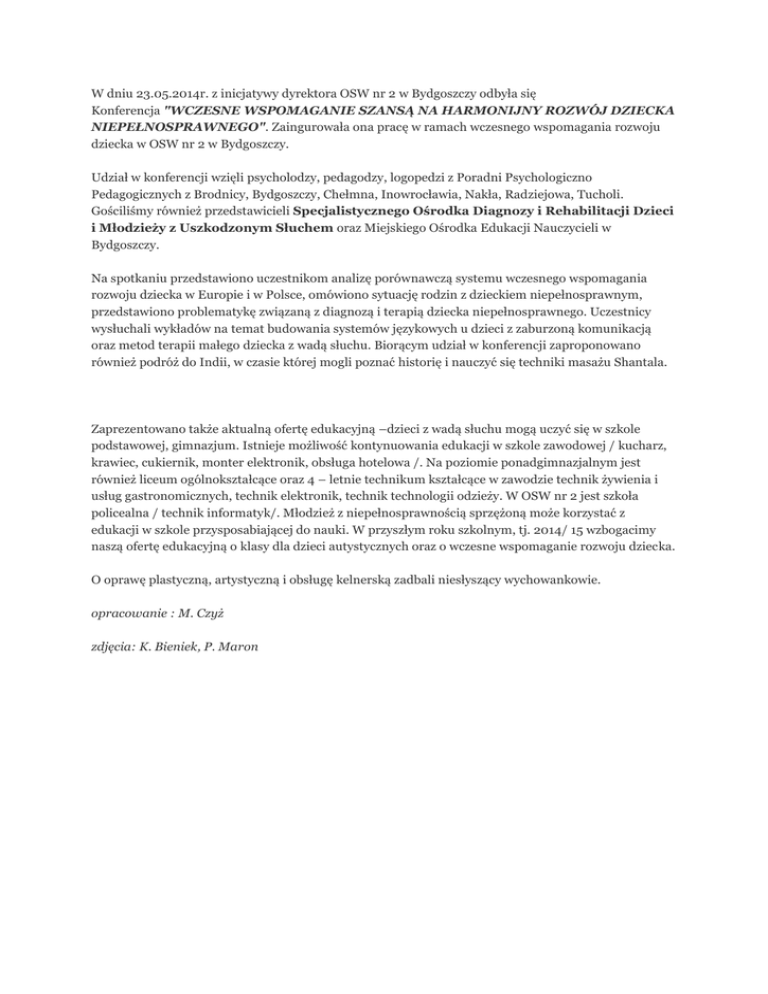 W dniu 23.05.2014r. z inicjatywy dyrektora OSW nr 2 w Bydgoszczy odbyła się Konferencja "WCZESNE WSPOMAGANIE SZANSĄ NA HARMONIJNY ROZWÓJ DZIECKA NIEPEŁNOSPRAWNEGO". Zaingurowała ona pracę w ramach wczesnego wspomagania rozwoju dziecka w OSW nr 2 w Bydgoszczy. Udział w konferencji wzięli psycholodzy, pedagodzy, logopedzi z Poradni Psychologiczno Pedagogicznych z Brodnicy, Bydgoszczy, Chełmna, Inowrocławia, Nakła, Radziejowa, Tucholi. Gościliśmy również przedstawicieli Specjalistycznego Ośrodka Diagnozy i Rehabilitacji Dzieci i Młodzieży z Uszkodzonym Słuchem oraz Miejskiego Ośrodka Edukacji Nauczycieli w Bydgoszczy. Na spotkaniu przedstawiono uczestnikom analizę porównawczą systemu wczesnego wspomagania rozwoju dziecka w Europie i w Polsce, omówiono sytuację rodzin z dzieckiem niepełnosprawnym, przedstawiono problematykę związaną z diagnozą i terapią dziecka niepełnosprawnego. Uczestnicy wysłuchali wykładów na temat budowania systemów językowych u dzieci z zaburzoną komunikacją oraz metod terapii małego dziecka z wadą słuchu. Biorącym udział w konferencji zaproponowano również podróż do Indii, w czasie której mogli poznać historię i nauczyć się techniki masażu Shantala. Zaprezentowano także aktualną ofertę edukacyjną –dzieci z wadą słuchu mogą uczyć się w szkole podstawowej, gimnazjum. Istnieje możliwość kontynuowania edukacji w szkole zawodowej / kucharz, krawiec, cukiernik, monter elektronik, obsługa hotelowa /. Na poziomie ponadgimnazjalnym jest również liceum ogólnokształcące oraz 4 – letnie technikum kształcące w zawodzie technik żywienia i usług gastronomicznych, technik elektronik, technik technologii odzieży. W OSW nr 2 jest szkoła policealna / technik informatyk/. Młodzież z niepełnosprawnością sprzężoną może korzystać z edukacji w szkole przysposabiającej do nauki. W przyszłym roku szkolnym, tj. 2014/ 15 wzbogacimy naszą ofertę edukacyjną o klasy dla dzieci autystycznych oraz o wczesne wspomaganie rozwoju dziecka. O oprawę plastyczną, artystyczną i obsługę kelnerską zadbali niesłyszący wychowankowie. opracowanie : M. Czyż zdjęcia: K. Bieniek, P. Maron
