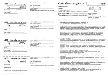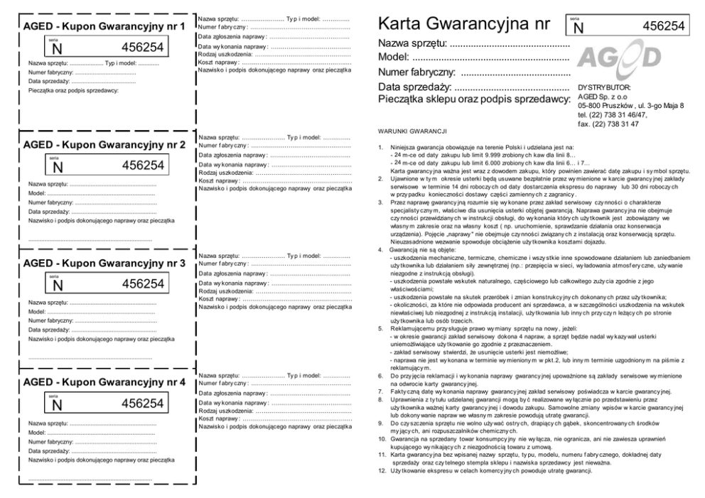 AGED - Kupon Gwarancyjny nr 1 Data zgłoszenia naprawy : ………………………………….. seria N Nazwa sprzętu: ………...….…… Ty p i model: ………….. Numer f abry czny : ………………………………………..…. 456254 Nazwa sprzętu: ..................... Typ i model: ............. Numer fabryczny: ...................................... Data wy konania naprawy : ………………………………..... Rodzaj uszkodzenia: ………………………………..……..... Koszt naprawy : ………………………………………….….... Nazwisko i podpis dokonującego naprawy oraz pieczątka Data sprzedaży: ........................................ Pieczątka oraz podpis sprzedawcy: Karta Gwarancyjna nr seria Nazwa sprzętu: .............................................. Model: ............................................................ Numer fabryczny: .......................................... Data sprzedaży: ............................................ Pieczątka sklepu oraz podpis sprzedawcy: N 456254 DYSTRYBUTOR: AGED Sp. z o.o 05-800 Pruszków , ul. 3-go Maja 8 tel. (22) 738 31 46/47, fax. (22) 738 31 47 WARUNKI GWARANCJI AGED - Kupon Gwarancyjny nr 2 Data zgłoszenia naprawy : ………………………………….. seria N Nazwa sprzętu: ………...….…… Ty p i model: ………….. Numer f abry czny : ………………………………………..…. 456254 Nazwa sprzętu: ...................................................... Model: ................................................................... Data wy konania naprawy : ………………………………..... Rodzaj uszkodzenia: ………………………………..……..... Koszt naprawy : ………………………………………….….... Nazwisko i podpis dokonującego naprawy oraz pieczątka Numer fabryczny: ................................................... Data sprzedaży: ..................................................... Nazwisko i podpis dokonującego naprawy oraz pieczątka ............................................................................. AGED - Kupon Gwarancyjny nr 3 Data zgłoszenia naprawy : ………………………………….. seria N Nazwa sprzętu: ………...….…… Ty p i model: ………….. Numer f abry czny : ………………………………………..…. 456254 Nazwa sprzętu: ...................................................... Model: ................................................................... Data wy konania naprawy : ………………………………..... Rodzaj uszkodzenia: ………………………………..……..... Koszt naprawy : ………………………………………….….... Nazwisko i podpis dokonującego naprawy oraz pieczątka Numer fabryczny: ................................................... Data sprzedaży: ..................................................... Nazwisko i podpis dokonującego naprawy oraz pieczątka ............................................................................. AGED - Kupon Gwarancyjny nr 4 Data zgłoszenia naprawy : ………………………………….. seria N Nazwa sprzętu: ………...….…… Ty p i model: ………….. Numer f abry czny : ………………………………………..…. 456254 Nazwa sprzętu: ...................................................... Model: ................................................................... Numer fabryczny: ................................................... Data sprzedaży: ..................................................... Nazwisko i podpis dokonującego naprawy oraz pieczątka ............................................................................. Data wy konania naprawy : ………………………………..... Rodzaj uszkodzenia: ………………………………..……..... Koszt naprawy : ………………………………………….….... Nazwisko i podpis dokonującego naprawy oraz pieczątka 1. Niniejsza gwarancja obowiązuje na terenie Polski i udzielana jest na: - 24 m-ce od daty zakupu lub limit 9.999 zrobiony ch kaw dla linii 8... - 24 m-ce od daty zakupu lub limit 6.000 zrobiony ch kaw dla linii 6... i 7... Karta gwarancy jna ważna jest wraz z dowodem zakupu, który powinien zawierać datę zakupu i sy mbol sprzętu. 2. Ujawnione w ty m okresie usterki będą usuwane bezpłatnie przez wy mienione w karcie gwarancy jnej zakłady serwisowe w terminie 14 dni roboczy ch od daty dostarczenia ekspresu do naprawy lub 30 dni roboczy ch w przy padku konieczności dostawy części zamienny ch z zagranicy . 3. Przez naprawę gwarancy jną rozumie się wy konane przez zakład serwisowy czy nności o charakterze specjalisty czny m, właściwe dla usunięcia usterki objętej gwarancją. Naprawa gwarancy jna nie obejmuje czy nności przewidziany ch w instrukcji obsługi, do wy konania który ch uży tkownik jest zobowiązany we własny m zakresie oraz na własny koszt ( np. uruchomienie, sprawdzanie działania oraz konserwacja urządzenia). Pojęcie „naprawy " nie obejmuje czy nności związany ch z instalacją oraz konserwacją sprzętu. Nieuzasadnione wezwanie spowoduje obciążenie uży tkownika kosztami dojazdu. 4. Gwarancją nie są objęte: - uszkodzenia mechaniczne, termiczne, chemiczne i wszy stkie inne spowodowane działaniem lub zaniedbaniem uży tkownika lub działaniem siły zewnętrznej (np.: przepięcia w sieci, wy ładowania atmosf ery czne, uży wanie niezgodne z instrukcją obsługi). - uszkodzenia powstałe wskutek naturalnego, częściowego lub całkowitego zuży cia zgodnie z jego właściwościami; - uszkodzenia powstałe na skutek przeróbek i zmian konstrukcy jny ch dokonany ch przez uży tkownika; - okoliczności, za które nie odpowiada producent ani sprzedawca, a w szczególności uszkodzenia na wskutek niewłaściwej lub niezgodnej z instrukcją instalacji, uży tkowania lub inny ch przy czy n leżący ch po stronie uż