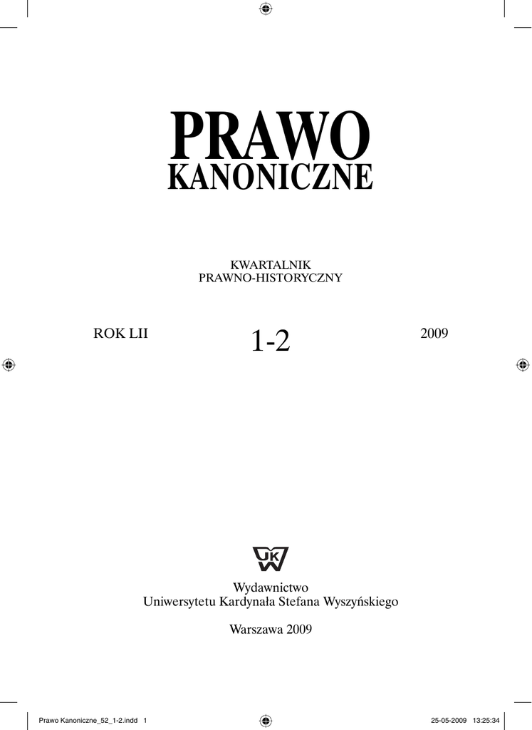 PRAWO KANONICZNE KWARTALNIK PRAWNO-HISTORYCZNY ROK LII 1-2 2009 Wydawnictwo Uniwersytetu Kardynała Stefana Wyszyńskiego Warszawa 2009 Prawo Kanoniczne_52_1-2.indd 1 25-05-2009 13:25:34 PRAWO KANONICZNE KWARTALNIK IUS CANONICUM FOLIA TRIMESTRIA studiis canonico-historicis dedicata Założyciel i pierwszy redaktor naczelny ks. Marian Alfons Myrcha Redaktor naczelny ks. Józef Wroceński SCJ Zastępca redaktora naczelnego s. Bożena Szewczul WNO Sekretarz Redakcji ks. Marek Stokłosa SCJ Rada Naukowa: ks. M. Fąka, ks. T. Gałkowski CP, ks. W. Góralski, ks. J. Gręźlikowski, ks. Julian Kałowski MIC, ks. W. Kiwior OCD, ks. G. Leszczyński, ks. R. Sobański, ks. H. Stawniak SBD, J. Zabłocki Za pozwoleniem Kurii Metropolitalnej Warszawskiej Pozycja dofinansowana ze środków Komitetu Badań Naukowych ISSN-0551-911X Zgłoszenia prenumeraty przyjmuje Wydawnictwo UKSW ul. Dewajtis 5, 01-815 Warszawa, tel./fax 022 839-89-85 Adres redakcji: ul. Dewajtis 5, 01-815 Warszawa e-mail: [email protected] www.wydawnictwo.uksw.edu.pl Druk i oprawa: Oficyna Drukarska ul. Sokołowska 12 a, 01-142 Warszawa tel./fax 022 632-83-52, fax 022 631-49-40 e-mail: [email protected] www.oficyna-drukarska.pl nakład: 450 egz. Prawo Kanoniczne_52_1-2.indd 2 25-05-2009 13:25:53 Dnia 13 stycznia 2009 roku niespodziewanie odszedł od nas na zawsze nasz Kolega Ks. prof. UKSW dr hab. JERZY SYRYJCZYK Był kapłanem diecezji siedleckiej, ściśle związanym z Wydziałem Prawa Kanonicznego ATK, a następnie od 1999 r. UKSW w Warszawie, gdzie zajmował stanowisko profesora nadzwyczajnego i kierownika Katedry Kościelnego Prawa Karnego oraz kuratora Katedry Polskiego Prawa Karnego i Procesowego. Z zamiłowaniem i poświęceniem oddawał się pracy naukowej i dydaktycznej. Wykształcił wielu magistrów i doktorów prawa kanonicznego. Pełnił funkcję Dziekana Wydziału i Prodziekana. Był członkiem Senatu ATK. Pracował na rzecz Uczelni w wielu Komisjach Uczelnianych pełniąc funkcję przewodniczącego. Ostatnio był członkiem Uczelnianej Komisji Rekrutacyjnej. Był również członkiem Komisji Upowszechniania Prawa Kanonicznego w pracach II Synodu Plenarnego Polski. Przez 25 lat pełnił funkcję sędziego w Sądzie Biskupim w Siedlcach. Nie wszystkie zamierzenia zdążył zrealizować. To, czego jednak dokonał, zapewnia Mu trwałe miejsce w kanonistyce polskiej, jako znawcy kanonicznego prawa karnego, a także i polskiego prawa karnego. Sam napisał szereg opracowań o charakterze porównawczym, a także pod jego kierunkiem powstało wiele prac magisterskich z tej dziedziny. Angażował się w prace dla dobra Kościoła w Polsce. Od 1991 r. podjął pracę w Ordynariacie Polowym Wojska Polskiego. Biskup Polowy mianował Go swoim wikariuszem generalnym. Urząd ten sprawował do 2004 roku. W latach 1996-2003 dodatkowo sprawował urząd proboszcza w parafii wojskowej w Warszawie-Bemowie. Można śmiało powiedzieć, że Ksiądz Profesor położył podwaliny prawne pod reaktywujący się Ordynariat Polowy i jego struktury wewnętrzne. Należy też dodać, że w 1993 r. został mianowany na stopień pułkownika, a w 2001 r. mianowany Prałatem Jego Świątobliwości Ojca Świętego. Ostatnią posługę, zgromadzeni pod przewodnictwem JE. ks. bpa Piotra Tomasika w asyście JE. ks. bpa Andrzeja Dzięgi oddaliśmy śp. Księdzu Jerzemu w dniu 17 stycznia 2009 r. w Radzyniu Podlaskim. Dziękujemy Księdzu Profesorowi, że był wśród nas i był właśnie takim, jakim był: dobrym człowiekiem i kolegą, pokornym uczonym i wymagającym profesorem. Ufamy, że Pan Zmartwychwstały da Mu udział w uczcie Swojego Królestwa. Wydział Prawa Kanonicznego Uniwersytetu Kardynała Stefana Wyszyńskiego w Warszawie Prawo Kanoniczne_52_1-2.indd 3 25-05-2009 13:25:53 Prawo Kanoniczne_52_1-2.indd 4 25-05-2009 13:25:53 Prawo Kanoniczne 52 (2009) nr 1-2 KS. JÓZEF WROCEŃSKI SCJ Uniwersytet Kardynała Stefana Wyszyńskiego w Warszawie KS. PROF. JERZY SYRYJCZYK (1950–2009) Ks. prof. Jerzy Syryjczyk urodził się 15 października 1950 roku w Wohyniu k. Radzynia Podlaskiego w diecezji siedleckiej. W roku 1957 rozpoczął naukę w Szkole Podstawowej w Radzyniu Podlaskim, a następnie w miejscowym Liceum Ogólnokształcącym. Po uzyskaniu świadectwa dojrzałości w roku 1968 wstąpił do Wyższego Seminarium Duchownego w Siedlcach. Studia filozoficzno-teologiczne ukończył w 1974 roku. W tym też roku otrzymał święcenia kapłańskie i rozpoczął pracę duszpasterską jako wikariusz w parafii Łochów w diecezji siedleckiej. W następnym roku, tj. w 1975 podjął studia prawa kanonicznego na Wydziale Prawa Kanonicznego Akademii Teologii Katolickiej w Warszawie, które ukończył w 1978 roku z wyróżnieniem, uzyskując tytuł zawodowy magistra prawa kanonicznego. W tym samym roku rozpoczął pracę naukowo-dydaktyczną na Wydziale Prawa Kanonicznego ATK jako asystent stażysta. W roku 1979 uzyskał stopień doktora nauk prawnych w zakresie prawa kanonicznego na podstawie rozprawy doktorskiej pt. Kradzież w karnym prawie kanonicznym i polskim. Od 1 października tegoż roku został zatrudniony w charakterze adiunkta przy Katedrze Kościelnego Prawa Karnego na wspomnianym wyżej Wydziale. W tym okresie prowadził wykłady i ćwiczenia z kościelnego prawa karnego, polskiego prawa karnego, polskiego procesu karnego i ćwiczenia z prawa rzymskiego oraz proseminarium z prawa kanonicznego. W dniu 10 stycznia 1983 r. przedłożył Radzie Wydziału Prawa Kanonicznego ATK dorobek naukowy i rozprawę habilitacyjną pt. Apostazja od wiary w świetle przepisów kanonicznego prawa karnego. Studium prawno-historyczne. Kolokwium habilitacyjne odbyło się Prawo Kanoniczne_52_1-2.indd 5 25-05-2009 13:25:53 6 KS. J. WROCEŃSKI [2] w dniu 25 maja tegoż roku, które Rada Wydziału przyjęła i oceniła pozytywnie, podejmując uchwałę o nadaniu ks. dr Jerzemu Syryjczykowi stopień doktora habilitowanego nauk prawnych w zakresie prawa kanonicznego. Dnia 26 