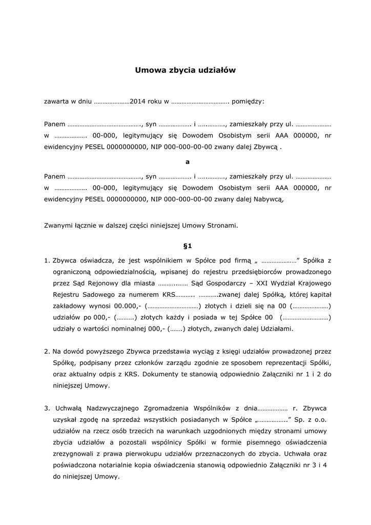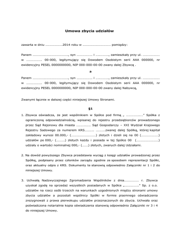 Umowa zbycia udziałów zawarta w dniu …………………2014 roku w ……………………………. pomiędzy: Panem ……………………………………., syn ………………. i …..………., zamieszkały przy ul. ………………… w ………………. 00-000, legitymujący się Dowodem Osobistym serii AAA 000000, nr ewidencyjny PESEL 0000000000, NIP 000-000-00-00 zwany dalej Zbywcą . a Panem ……………………………………., syn ………………. i …..………., zamieszkały przy ul. ………………… w ………………. 00-000, legitymujący się Dowodem Osobistym serii AAA 000000, nr ewidencyjny PESEL 0000000000, NIP 000-000-00-00 zwany dalej Nabywcą, Zwanymi łącznie w dalszej części niniejszej Umowy Stronami. §1 1. Zbywca oświadcza, że jest wspólnikiem w Spółce pod firmą „ ……………..…” Spółka z ograniczoną odpowiedzialnością, wpisanej do rejestru przedsiębiorców prowadzonego przez Sąd Rejonowy dla miasta ………..…… Sąd Gospodarczy – XXI Wydział Krajowego Rejestru Sadowego za numerem KRS……….. ………..zwanej dalej Spółką, której kapitał zakładowy wynosi 00.000,- (…………………………) złotych i dzieli się na 00 (…………………) udziałów po 000,- (……….) złotych każdy i posiada w tej Spółce 00 (………………………) udziały o wartości nominalnej 000,- (…….) złotych, zwanych dalej Udziałami. 2. Na dowód powyższego Zbywca przedstawia wyciąg z księgi udziałów prowadzonej przez Spółkę, podpisany przez członków zarządu zgodnie ze sposobem reprezentacji Spółki, oraz aktualny odpis z KRS. Dokumenty te stanowią odpowiednio Załączniki nr 1 i 2 do niniejszej Umowy. 3. Uchwałą Nadzwyczajnego Zgromadzenia Wspólników z dnia……………… r. Zbywca uzyskał zgodę na sprzedaż wszystkich posiadanych w Spółce „……………..” Sp. z o.o. udziałów na rzecz osób trzecich na warunkach uzgodnionych między stronami umowy zbycia udziałów a pozostali wspólnicy Spółki w formie pisemnego oświadczenia zrezygnowali z prawa pierwokupu udziałów przeznaczonych do zbycia. Uchwała oraz poświadczona notarialnie kopia oświadczenia stanowią odpowiednio Załączniki nr 3 i 4 do niniejszej Umowy. 4. Zbywca oświadcza, że od daty wydania odpisu z rejestru handlowego oraz wyciągu z księgi udziałów nie zaszły żadne zmiany podlegające wpisowi do rejestru oraz nie zostały dokonane żadne wpisy w księdze udziałów dotyczące Udziałów. § 2. 1. Zbywca przedstawia Nabywcy kopię zatwierdzonego sprawozdania finansowego Spółki za ostatni rok obrotowy oraz zestawienie zawierające: - Wykaz wszystkich umów zawartych przez Spółkę oraz obowiązujących w dniu zawarcia niniejszej Umowy . - Wykaz składników majątku trwałego Spółki wraz ze wskazaniem tytułu prawnego Spółki do korzystania z nieruchomości, - Wykaz postępowań sądowych i administracyjnych toczących się z udziałem Spółki, - Wykaz wszelkich zobowiązań oraz należności Spółki, - Dokumenty o nadaniu numerów NIP i REGON, - Zestawienie stanów magazynowych, - Wykaz osób zatrudnionych. 2. Sprawozdanie finansowe oraz zestawienie, o których mowa powyżej w § 2 ust. 1, zostały podpisane przez zarząd Spółki i stanowią odpowiednio Załączniki nr 5 i 6 do niniejszej Umowy. § 3. Zbywca zapewnia Nabywcę, że: 1) Udziały istnieją, stanowią własność Zbywcy oraz zostały w pełni opłacone. 2) Udziały nie są obciążone żadnymi prawami poza zobowiązaniami jakie nakładają na każdy udział umowa Spółki, uchwały Zgromadzeń Wspólników oraz tych jakie wynikają z bilansu; ze zbytych udziałów Zbywca nie zalega żadnego świadczenia a także w stosunku do Udziałów nie toczy się żadne postępowanie, 3. Poza zgodą na zbycie udziałów, wymienioną w § 1 ust. 3 niniejszej Umowy, nie istnieją żadne ustawowe lub umowne ograniczenia dotyczące rozporządzania Udziałami, 4.Wedle najlepszej wiedzy Zbywcy, nie istnieją podstawy do żądania od Spółki odszkodowań z tytułu czynów niedozwolonych oraz nałożenia na Spółkę opłat lub kar administracyjnych, 5. Sprawozdanie finansowe za ostatni rok obrotowy Spółki zostało sporządzone zgodnie z obowiązującymi przepisami i stanowi rzetelny obraz działalności Spółki, 6. Zestawienie, o którym mowa w § 2 niniejszej Umowy, zawiera prawdziwe i kompletne informacje w odniesieniu do kwestii stanowiących jego przedmiot, 7. Nie istnieją żadne umowy i porozumienia, na podstawie których przewidziane są dodatkowe świadczenia na rzecz Spółki związane z posiadaniem Udziałów, 8. Wedle najlepszej wiedzy Zbywcy, Spółka nie posiada zaległych zobowiązań podatkowych oraz zobowiązań z tytułu ubezpieczenia społecznego. § 4. 1. Zbywca przedstawił Nabywcy do wglądu całą dokumentację Spółki umożliwiającą zapoznanie się Nabywcy ze stanem prawnym, finansowym i ekonomicznym Spółki w chwili zawarcia niniejszej Umowy, co niniejszym Nabywca potwierdza. W szczególności Nabywca potwierdza, że został poinformowany o złożeniu przez zarząd Spółki wniosku o wszczęcie wobec Spółki postępowania upadłościowego. 2. Nabywca stwierdza, że nie wnosi zastrzeżeń co do rzetelności i niewadliwości prowadzenia ewidencji rachunkowej i gospodarczej oraz innych wymaganych prawem dokumentów finansowych i prawnych. 3. Nabywca oświadcza, że wszystkie okoliczności mające wpływ na ekonomiczną i kondycję Spółki w dniu zawarcia niniejszej Umowy, sytuację wykazane w przedstawionej dokumentacji Spółki, są mu znane i w związku z tym oświadcza, że nie będzie dochodził roszczeń z tytułu nabycia udziałów w Spółce w takim stanie w jakim się one znajdują i na warunkach określonych w niniejszej Umowie. § 5. Nabywca zobowiązuje się niezwłocznie zawiadomić Spółkę w formie pisemnej o przejściu Udziałów na jego rzecz. Do zawiadomienia zostanie do