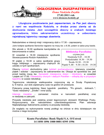 OGŁOSZENIA DUSZPASTERSKIE Ósma Niedziela Zwykła 27.02.2011 rok www.klemens.beskidy.pl Liturgiczne pozdrowienie jest zapewnieniem, że Pan jest obecny z nami we wspólnocie Kościoła, w drodze przez ziemię aż do skończenia świata. Jest szczególnie szczególnie obecny w znakach świętego zgromadzenia, które sakramentalnie uczestniczy w uobecnianiu największej tajemnicy naszego zbawienia. Nabożeństwo w intencji misji i misjonarzy dziś o 17.30 – zapraszamy. Jutro kolejne spotkanie Seniorów najpierw na mszy św. o 8.30, potem w salce przy kawie. We wtorek o 18.30 spotkanie kandydatów do bierzmowania w salce. Biblioteka Parafialna czynna jest: Niedziela 9.45 – 10.30 Poniedziałek 18.30 – 19.30 W piątek o 18.30 w salce spotkanie grupy Środa 18.30 – 19.30 kręgu biblijnego – zapraszamy chętnych do Piątek 9..00 – 9.30 i 18.30 – 19.30 udziału w tych spotkaniach. W czwartek o 18.30 miesięczne spotkanie Stowarzyszenia Rodzin Katolickich. Obecny tydzień obchodzimy jako tydzień eucharystyczny: /pierwszy czwartek, piątek i sobota/ - zapraszamy do sakramentów św. Okazja do spowiedzi św. jest przed każdą mszą św. Spowiedź miesięczna dzieci i młodzieży: w czwartek i piątek od 17.00. Odwiedziny chorych i słabych Parafian – odbędą się w przyszłym tygodniu w czasie rekolekcji. Tegoroczne rekolekcje wielkopostne rozpoczną się w Środę Popielcową tj. 9 marca. Już dziś zaplanujmy czas na godne ich przeżycie. Polecamy prasę katolicką: Nasz tygodnik "Gość niedzielny", „Źródło” i inne tytuły. Intencje mszalne w niedzielę w zakrystii. zamawiać parafialny można w "Po górach, kancelarii dolinach..", parafialnej oraz Przyszła niedziela jest ostatnią przed tegorocznym okresem Wielkiego Postu. Rozpoczynamy tzw. nabożeństwo czterdziestogodzinne. Plan adoracja Najświętszego Sakramentu podamy w przyszłą niedzielę. Ze względu na wykonywanie nowej podłogi na chórze w dniu dzisiejszym nie można z niego korzystać. Konto Parafialne: Bank Śląski S.A. O/Ustroń 14 1050 1096 1000 0001 0395 1596