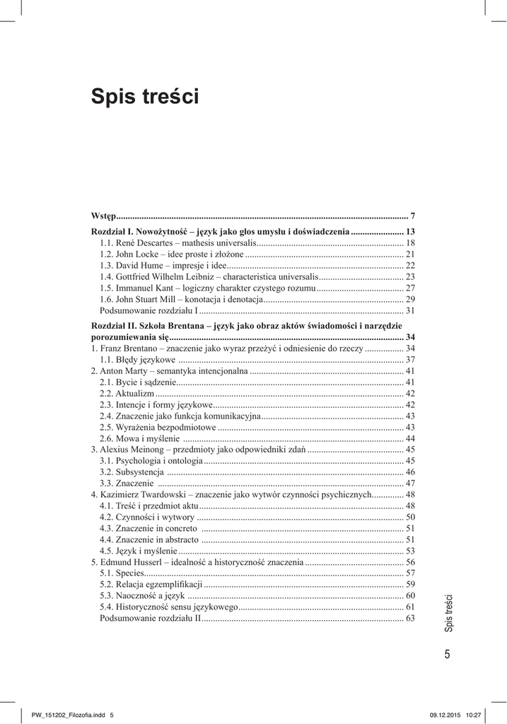 Spis treści Wstęp................................................................................................................................ 7 Rozdział II. Szkoła Brentana – język jako obraz aktów świadomości i narzędzie porozumiewania się....................................................................................................... 34 1. Franz Brentano – znaczenie jako wyraz przeżyć i odniesienie do rzeczy.................. 34 1.1. Błędy językowe ................................................................................................... 37 2. Anton Marty – semantyka intencjonalna.................................................................... 41 2.1. Bycie i sądzenie.................................................................................................... 41 2.2. Aktualizm............................................................................................................. 42 2.3. Intencje i formy językowe.................................................................................... 42 2.4. Znaczenie jako funkcja komunikacyjna............................................................... 43 2.5. Wyrażenia bezpodmiotowe.................................................................................. 43 2.6. Mowa i myślenie ................................................................................................. 44 3. Alexius Meinong – przedmioty jako odpowiedniki zdań........................................... 45 3.1. Psychologia i ontologia........................................................................................ 45 3.2. Subsystencja ........................................................................................................ 46 3.3. Znaczenie ............................................................................................................ 47 4. Kazimierz Twardowski – znaczenie jako wytwór czynności psychicznych............... 48 4.1. Treść i przedmiot aktu.......................................................................................... 48 4.2. Czynności i wytwory ........................................................................................... 50 4.3. Znaczenie in concreto ......................................................................................... 51 4.4. Znaczenie in abstracto ......................................................................................... 51 4.5. Język i myślenie................................................................................................... 53 5. Edmund Husserl – idealność a historyczność znaczenia............................................ 56 5.1. Species.................................................................................................................. 57 5.2. Relacja egzemplifikacji........................................................................................ 59 5.3. Naoczność a język ............................................................................................... 60 5.4. Historyczność sensu językowego......................................................................... 61 Podsumowanie rozdziału II......................................................................................... 63 Spis treści Rozdział I. Nowożytność – język jako głos umysłu i doświadczenia........................ 13 1.1. René Descartes – mathesis universalis................................................................. 18 1.2. John Locke – idee proste i złożone...................................................................... 21 1.3. David Hume – impresje i idee.............................................................................. 22 1.4. Gottfried Wilhelm Leibniz – characteristica universalis...................................... 23 1.5. Immanuel Kant – logiczny charakter czystego rozumu....................................... 27 1.6. John Stuart Mill – konotacja i denotacja.............................................................. 29 Podsumowanie rozdziału I.......................................................................................... 31 5 PW_151202_Filozofia.indd 5 09.12.2015 10:27 Rozdział III. Gottlob Frege – język jako idealna notacja......................................... 66 1. Język sztuczny a naturalny, logika a gramatyka, myśl a język................................... 67 2. Sens i nominat ............................................................................................................ 69 3. Odniesienie i prawda................................................................................................... 70 4. Wyrażanie myśli i uznawanie, akt i myśl.................................................................... 73 5. Obiektywność poznania – struktura sądu a geneza psychologiczna i historyczna .... 75 6. Struktura logiczna zdania, pojęcie i przedmiot, funkcja i argument........................... 77 7. Przykłady błędów kategorialnych .............................................................................. 83 Podsumowanie rozdziału III........................................................................................... 88 Marek Maciejczak / Filozofia jako krytyka języka Rozdział IV. Początki brytyjskiej szkoły analitycznej – język logiki i język potoczny .................................................................................... 91 1. George Edward Moore – język potoczny jako podstawowy dla nauki i filozofii....... 92 1.1. Definiowanie pojęć............................................................................................... 93 1.2. Rozkładanie pojęć................................................................................................ 95 2. Bertrand Russell – język idealny logicznie................................................................. 99 2.1. Atomizm logiczny........