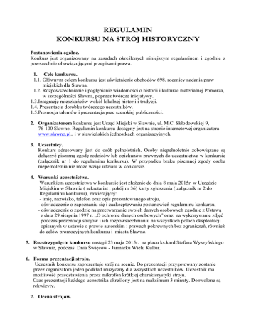 REGULAMIN KONKURSU NA STRÓJ HISTORYCZNY Postanowienia ogólne. Konkurs jest organizowany na zasadach określonych niniejszym regulaminem i zgodnie z powszechnie obowiązującymi przepisami prawa. 1. Cele konkursu. 1.1. Głównym celem konkursu jest uświetnienie obchodów 698. rocznicy nadania praw miejskich dla Sławna. 1.2. Rozpowszechnianie i pogłębianie wiadomości o historii i kulturze materialnej Pomorza, w szczególności Sławna, poprzez twórcze inicjatywy. 1.3.Integrację mieszkańców wokół lokalnej historii i tradycji. 1.4. Prezentacja dorobku twórczego uczestników. 1.5.Promocja talentów i prezentacja prac szerokiej publiczności. 2. Organizatorem konkursu jest Urząd Miejski w Sławnie, ul. M.C. Skłodowskiej 9, 76-100 Sławno. Regulamin konkursu dostępny jest na stronie internetowej organizatora www.slawno.pl., i w sławieńskich jednostkach organizacyjnych. 3. Uczestnicy. Konkurs adresowany jest do osób pełnoletnich. Osoby niepełnoletnie zobowiązane są dołączyć pisemną zgodę rodziców lub opiekunów prawnych do uczestnictwa w konkursie (załącznik nr 1 do regulaminu konkursu). W przypadku braku pisemnej zgody osoba niepełnoletnia nie może wziąć udziału w konkursie. 4. Warunki uczestnictwa. Warunkiem uczestnictwa w konkursie jest złożenie do dnia 8 maja 2015r. w Urzędzie Miejskim w Sławnie ( sekretariat , pokój nr 36) karty zgłoszenia ( załącznik nr 2 do Regulaminu konkursu), zawierającej: - imię, nazwisko, telefon oraz opis prezentowanego stroju, - oświadczenie o zapoznaniu się i zaakceptowaniu postanowień regulaminu konkursu, - oświadczenie o zgodzie na przetwarzanie swoich danych osobowych zgodnie z Ustawą z dnia 29 sierpnia 1997 r. „O ochronie danych osobowych” oraz na wykonywanie zdjęć podczas prezentacji strojów i ich rozpowszechnianiu na wszystkich polach eksploatacji opisanych w ustawie o prawie autorskim i prawach pokrewnych bez ograniczeń, również do celów promocyjnych konkursu i miasta Sławno. 5. Rozstrzygnięcie konkursu nastąpi 23 maja 2015r. na placu ks.kard.Stefana Wyszyńskiego w Sławnie, podczas Dnia Święców - Jarmarku Wielu Kultur. 6. Forma prezentacji stroju. Uczestnik konkursu zaprezentuje strój na scenie. Do prezentacji przygotowany zostanie przez organizatora jeden podkład muzyczny dla wszystkich uczestników. Uczestnik ma możliwość przedstawienia przez mikrofon krótkiej charakterystyki stroju. Czas prezentacji każdego uczestnika określony jest na maksimum 3 minuty. Dozwolone są rekwizyty. 7. Ocena strojów. Strój prezentowany podczas konkursu powinien zostać wykonany własnoręcznie. Głównej ocenie podlegać będzie wierność historyczna (nawiązanie do ubioru z epoki), pomysłowość, estetyka wykonania, wkład pracy. 8. Komisja Konkursowa. Nagrody O wyłonieniu zwycięzców konkursu decyduje powołana w tym celu Komisja Konkursowa. W skład Komisji Konkursowej wchodzą: osoba wskazana przez organizatora, oraz po jednym przedstawicielu miast partnerskich uczestniczących w Dniu Święców-Jarmarku Wielu Kultur. Komisja wyłoni laureatów I, II i III miejsca. Dla laureatów przewidziane zostały nagrody rzeczowe. Komisja może przyznać również wyróżnienia. Wręczenie nagród nastąpi 23 maja 2015r. na placu ks.kard.Stefana Wyszyńskiego w Sławnie. Bliższe informacje: Margareta Sadowska, inspektor ds.promocji i współpracy zagranicznej Urząd Miejski w Sławnie, tel. 59/810 0053.