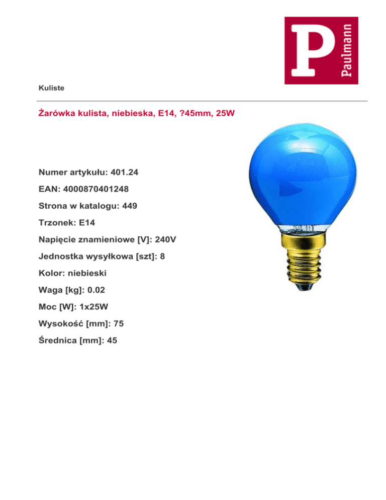 Kuliste Żarówka kulista, niebieska, E14, ?45mm, 25W Numer artykułu: 401.24 EAN: 4000870401248 Strona w katalogu: 449 Trzonek: E14 Napięcie znamieniowe [V]: 240V Jednostka wysyłkowa [szt]: 8 Kolor: niebieski Waga [kg]: 0.02 Moc [W]: 1x25W Wysokość [mm]: 75 Średnica [mm]: 45
