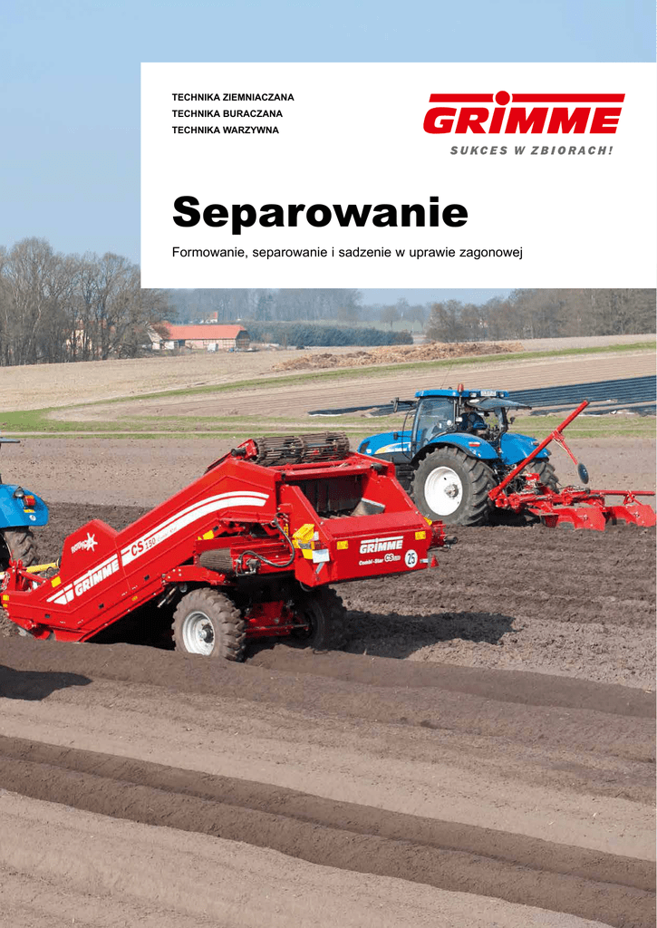 TECHNIKA ZIEMNIACZANA TECHNIKA BURACZANA TECHNIKA WARZYWNA Separowanie Formowanie, separowanie i sadzenie w uprawie zagonowej Najlepsza jakość na gleby zakamienione Optymalne przygotowanie gleby jest formowania, separowania i wysadzania kowej uprawy międzyrzędzi za pomocą podstawowym zabiegiem koniecznym w uprawie zagonowej. Przesiane i frezu. Podczas zbiorów ziemniaki do uzyskania ziemniaków wysokiej oczyszczone zagony szybko są mniej uszkodzone, a koszty jakości na glebach zakamienionych nagrzewają się zapewniając idealne związane z sortowaniem zmniejszają z wysoką zawartością brył ziemi. warunki wzrostu. Ponadto dzięki się lub nie ma ich wcale. Koszty Użytkownicy maszyn na całym użyciu opcjonalnej blachy formującej konserwacji i napraw są zmniejszone świecie znają korzyści 3-fazowego redliny za sadzarką odpada konieczność dzięki nieznacznemu zużyciu. oczyszczania gleby z brył i kamieni – dodatkowego obsypywania czy dodat Pierwsza faza: formowacze serii BF/BFL formują zagony. Podczas tego zabiegu ustalany jest ślad oraz szerokość zagonów. Druga faza: oczyszczanie zagonów z kamieni i brył ziemi za pomocą separatora serii CS. Separator przesiewa ziemię pracując na całej szerokości zagonu. Trzecia faza: sadzenie ziemniaków w zagonach. W oczyszczonej z brył i kamieni glebie sadzone są ziemniaki w systemie 1-, 2- i 3-zagonowym. Więcej informacji na stronach 4 – 7. Więcej informacji na stronach 8 – 15. Więcej informacji na stronach 16 – 17. Standardowe szerokości zagonów i rzędów w zależności od kierunku uprawy, zawartości kamieni i struktury przedsiębiorstwa Szerokość wyorywania 150 cm Szerokość wyorywania 170 cm 2 3 FORMOWANIE ZAGONU Optymalny kształt zagonów SEPAROWANIE SADZENIE DANE TECHNICZNE Formowanie dwóch zagonów Pierwszym krokiem do skutecznego modele formowaczy. Duże zapobiegają osuwaniu się ziemi oczyszczenia gleby z brył i kamieni formowacze zagonów serii BF są do bruzdy. Trzy szerokości jest właściwie uformowany zagon. idealnie przystosowane do pracy robocze umożliwiają formowanie Formowacz BF/BFL 200 jest Jakość wykonania tego zabiegu na glebach średnich i ciężkich z dwóch, trzech lub czterech wyposażony w dwa korpusy płużne ma decydujące znaczenie, gdyż dużą zawartością kamieni i brył. zagonów podczas jednego osadzone na sztywnej ramie. Podczas podczas pracy z maszynami w Lekkie elementy robocze w serii przejazdu – najlepsze warunki do jednego przejazdu formowane są kolejnych przejazdach roboczych BFL sprawdzają się na glebach późniejszego oczyszczania. dwa zagony, jeden między korpusami nie ma już możliwości korekty. lekkich i średnich formując wąskie i dwie połowy zagonu po obu Grimme oferuje trzy podstawowe zagony. Długie odkładnice stronach. Maszyna pracuje wydajnie BF/BFL 200 na małych polach. Formowanie trzech zagonów BFL 400 Formowacz BFL 400 jest wyposażony w trzy korpusy płużne osadzone na sztywnej ramie. Opcjonalnie rama może być składana hydraulicznie. Podczas jednego przejazdu formowane są trzy zagony, dwa między korpusami i dwie połowy zagonów po obu stronach. Formowanie czterech zagonów BF/BFL 600 Formowacz BF/BFL 600 jest wyposażony w cztery korpusy płużne osadzone na ramie składanej hydryulicznie. Podczas jednego przejazdu formowane są cztery, a ze złożoną ramą dwa zagony. 4 5 FORMOWANIE ZAGONU Na gleby ciężkie 1 2 Elementy BF SEPAROWANIE SADZENIE DANE TECHNICZNE Różnorodność opcji Opcje dla formowaczy zagonu Element BF jest przystosowany do formowania zagonów do Wymienne końcówki z 2 m szerokości na glebach możliwością użycia z dwóch zakamienionych. Podstawa o stron, a także lemiesze szerokości 410 mm zapewnia boczne (1) zwiększają stabilność. wystarczająco dużo miejsca na odłożenie dużej ilości Zęby (2) spulchniają glebę kamieni i brył. przed elementami BF/BFL poprawiając jakość pracy korpusów płużnych i zapewniając lepsze Na gleby lekkie 3 4 formowanie zagonu. Sztywne zęby spulchniają ziemię Elementy BFL bezpośrednio pod tworzonymi później zagonami. Do pracy na Element BFL jest przystosowany glebach zakamienionych dostępne do formowania zagonów do 2 m są opcjonalnie sprężyny nawracające szerokości na glebach lekkich i przy zębach spulchniających, średnich. Długie odkładnice zwiększające stabilność. Przed dociskają równomiernie transportem na drogach publicznych powierzchnie boczne zagonu. można wsunąć zęby (3). Podstawa o szerokości 330 mm zapewnia wystarczająco BF/BFL 600 ma funkcję składania dużo miejsca na kamienie. umożliwiającą formowanie jednego zagonu na uwrociu (4). Dobra stabilność Zabezpieczenie przed kamieniami Mechaniczne zabezpieczenie ze sworzniem ścinanym (1) zapewnia lepszą żywotność elementów obsypujących. Dostępne opcjonalnie zabezpieczenie hydrauliczne z automatycznym ustawieniem w pozycji wyjściowej (2) znacznie redukuje czas przestojów. 6 Równomierną głębokość roboczą 1 2 5 6 zapewniają przy BF/BFL 600 opcjonalne koła podporowe po prawej i lewej stronie (5). Obydwa skrajne elementy obsypujące przy BF/BFL 600 są zawieszone na równoległoboku (6) umożliwiając ustawienie głębokości roboczej. Aby zapobiec oddziaływaniu bocznych sił ciągu podczas formowania trzech zagonów zewnętrzne elementy pracują podczas pierwszego przejazdu na około 2/3 głębokości, a podczas drugiego przejazdu na całej głębokości. 7 FORMOWANIE ZAGONU Oczyszczenie gleby z brył i kamieni Drugi krok do uzyskania wydajność, najlepsza jakość szerokościami roboczymi 1500 ziemniaków wysokiej jakości na oczyszczania i dobra rentowność. lub 1700 mm przekonują dzięki glebach zakamienionych z dużą Aby uzyskać optymalne rezultaty, specjalnym kombinacjom zawartością brył jest optymalne oferowane są różnorodne opcje wałków pierścieniowych i taśm oczyszczenie. Do tego celu wyposażenia. Modele podstawowe o