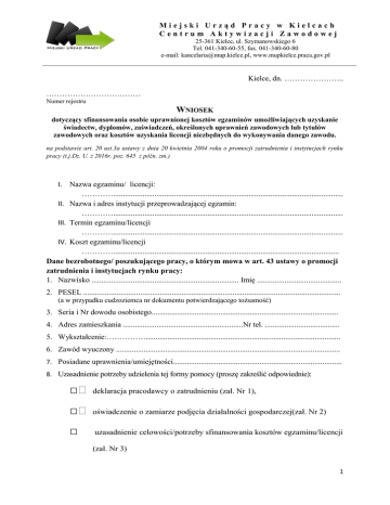 Miejski Urząd Pracy w Kielcach Centrum Aktywizacji Zawodowej 25-361 Kielce, ul. Szymanowskiego 6 Tel. 041-340-60-55, fax. 041-340-60-80 e-mail: [email protected], www.mupkielce.praca.gov.pl Kielce, dn. ………………….. ……………………………… Numer rejestru WNIOSEK dotyczący sfinansowania osobie uprawnionej kosztów egzaminów umożliwiających uzyskanie świadectw, dyplomów, zaświadczeń, określonych uprawnień zawodowych lub tytułów zawodowych oraz kosztów uzyskania licencji niezbędnych do wykonywania danego zawodu. na podstawie art. 20 ust.3a ustawy z dnia 20 kwietnia 2004 roku o promocji zatrudnienia i instytucjach rynku pracy (t.j.Dz. U. z 2016r. poz. 645 z późn. zm.) I. Nazwa egzaminu/ licencji: …………..................................................................................................................... II. Nazwa i adres instytucji przeprowadzającej egzamin: …………..................................................................................................................... III. Termin egzaminu/licencji …………..................................................................................................................... IV. Koszt egzaminu/licencji …………................................................................................................................... Dane bezrobotnego/ poszukującego pracy, o którym mowa w art. 43 ustawy o promocji zatrudnienia i instytucjach rynku pracy: 1. Nazwisko ........................................................................... Imię ........................................... 2. PESEL ................................................................................................................................... (a w przypadku cudzoziemca nr dokumentu potwierdzającego tożsamość) 3. Seria i Nr dowodu osobistego............................................................................................... 4. Adres zamieszkania .............................................................Nr tel. ...................................... 5. Wykształcenie:……………................................................................................................... 6. Zawód wyuczony .................................................................................................................. 7. Posiadane uprawnienia/umiejętności...................................................................................... 8. Uzasadnienie potrzeby udzielenia tej formy pomocy (proszę zakreślić odpowiednie): □ deklaracja pracodawcy o zatrudnieniu (zał. Nr 1), □ oświadczenie o zamiarze podjęcia działalności gospodarczej(zał. Nr 2) □ uzasadnienie celowości/potrzeby sfinansowania kosztów egzaminu/licencji (zał. Nr 3) 1 Informuję, że: 1. Wszystkie dane i informacje zawarte w powyższym Wniosku są zgodne z prawdą. 2. Zgodnie z ustawą z dnia 29 sierpnia 1997 r. o ochronie danych osobowych wyrażam zgodę na przetwarzanie moich danych osobowych zawartych w zgłoszeniu do celów związanych z rozpatrzeniem mojego wniosku i na potrzeby badań realizowanych lub zleconych przez Urząd w celu monitoringu skuteczności tej formy pomocy. 3. Zostałem/am poinformowany/a o zasadach finansowania kosztów egzaminu lub uzyskania licencji i po uzyskaniu zgody zobowiązuję się do podpisania dwustronnej umowy, w której zostaną określone warunki finansowania. …………………………………… (podpis wnioskodawcy) Wypełnia pracownik Miejskiego Urzędu Pracy Opinia specjalisty ds. rozwoju zawodowego/doradcy klienta: ………………………………………………………………………………………………… ………………………………………………………………………………………………… ………………………………………………………………………………………………… ………………………………………………………………………………………………… ……………………………………………………………………………………………… ............................. (data) …………………........................................ (podpis i pieczęć specjalisty ds. rozwoju zawodowego/ doradcy klienta ) 2 Miejski Urząd Pracy w Kielcach Centrum Aktywizacji Zawodowej 25-361 Kielce, ul. Szymanowskiego 6 Tel. 041-340-60-55, fax. 041-340-60-80 e-mail: [email protected], www.mupkielce.praca.gov.pl Załącznik nr 1 Deklaracja pracodawcy o zatrudnieniu po: □zdaniu egzaminu, □uzyskaniu licencji*, ……………………………… (pieczątka pracodawcy) 1. 2. 3. 4. 5. Nazwa pracodawcy:…………………………………………………………………… Adres:………………………………………………………………………………….. Nr telefonu: ……………….REGON ……………………….PKD…………………... Osoba reprezentująca pracodawcę:……………………………………………………. Rodzaj prowadzonej działalności:……………………………………………………… Oświadczam, iż zatrudnię w w/w firmie Pana/Panią: ………………………………………………………………………………………………… (imię nazwisko) …………………………………………………………………………………………………. (adres zamieszkania) po pozytywnym zdaniu egzaminu/uzyskaniu licencji z zakresu: ………………………………………………………………………………………………… ………………………………………………………………………………………………… ………………………………………………………………………………………………… (dokładna nazwa i egzaminu/licencji *) Proponowane stanowisko:………
