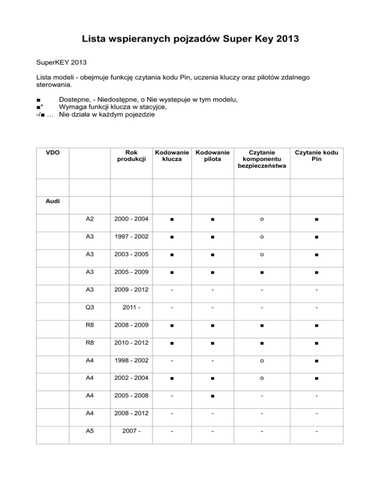 Lista wspieranych pojzadów Super Key 2013 SuperKEY 2013 Lista modeli - obejmuje funkcję czytania kodu Pin, uczenia kluczy oraz pilotów zdalnego sterowania. ■ Dostepne, - Niedostępne, o Nie wystepuje w tym modelu, ■* Wymaga funkcji klucza w stacyjce, -/■ … Nie działa w każdym pojezdzie VDO Rok produkcji Kodowanie klucza Kodowanie pilota Czytanie komponentu bezpieczeństwa Czytanie kodu Pin A2 2000 - 2004 ■ ■ o ■ A3 1997 - 2002 ■ ■ o ■ A3 2003 - 2005 ■ ■ o ■ A3 2005 - 2009 ■ ■ ■ ■ A3 2009 - 2012 - - - - Q3 2011 - - - - - R8 2008 - 2009 ■ ■ ■ ■ R8 2010 - 2012 ■ ■ ■ ■ A4 1998 - 2002 - - o ■ A4 2002 - 2004 ■ ■ o ■ A4 2005 - 2008 - ■ - - A4 2008 - 2012 - - - - A5 2007 - - - - - Audi Q5 2009 - 2013 - - - - A6/Allroad 1998 - 2004 ■ ■ o ■ A6 2005 - 2010 - - - - A6 2011 = - - - - - A7 2011 = - - - - - TT 1998 - 2006 ■ ■ o - TT 2006 - 2009 ■ ■ ■ ■ TT 2009 - 2012 ■ ■ ■ ■ A8 2000 - 2002 - - - - A8 2003 - 2008 - - - - A8 2009 = - - - - - up! 2012 - - - - - Fox 2005 - 2007 - - o - Lupo 1999 - 2002 - - o - Polo 1988 - 2002 - - o ■ Polo 2003 - 2008 ■ ■ o ■ Polo 2009 - 2013 ■ ■ ■ ■* Golf 3 1997 - 1999 - o o - Golf 4 1999 - 2003 ■ ■ o ■ Golf 5 2004 - 2009 ■ ■ -/■ ■ Golf 6 2009 - 2012 ■ ■ ■ ■* Golf 7 2013 - - - - - Volks... Bora 1999 - 2003 ■ ■ o ■ Bora 2004 - 2009 ■ ■ -/■ ■ Bora 2009 - 2012 ■ ■ ■ ■* Bora 2013 - - - - - Jetta 1999 - 2003 ■ ■ o ■ Jetta 2004 - 2009 ■ ■ -/■ ■ Jetta 2009 - 2012 ■ ■ ■ ■* Jetta 2013 - - - - - Scirocco 2008 - 2009 ■ ■ ■ ■ Scirocco 2010 - ■ ■ ■ ■* Tiguan 2007 - 2009 ■ ■ ■ ■ Tiguan 2010 = - ■ ■ ■ ■* Touran 2003 - 2010 ■ ■ ■ ■ Touran II 2011 - ■ ■ ■ ■* Transporter T4 1997 - 2003 - - o - Transporter T5 2003 - 2009 ■ ■ ■ ■ Transporter T6 2010 = - ■ ■ ■ ■* Amarok 2010 = - ■ ■ ■ ■* Eos 2005 - 2009 ■ ■ ■ ■ Eos 2009 - ■ ■ ■ ■* Sharan 1997 - 2000 - - o - Sharan 2000 - 2009 ■ ■ ■ ■ Sharan 2010 - ■ ■ ■ ■* Caddy 2003 - 2009 ■ ■ ■ ■ Caddy 2010 - ■ ■ ■ ■* Passat 3B 1999 - 2004 ■ ■ o ■ Passat 3C 2005 - 2008 ■ ■ ■ ■ Passat CC 2007 - 2012 - ■ - - Passat 36 2010 = - - ■ - - Phaeton 2002 - 2008 - - - - Phaeton II 2009 - - - - - Touareg 2002 - 2008 - - - - Touareg II 2009 - - - - - Citigo 2012 - - - - - Felicia 1996- 1999 ■ o - ■* Fabia I 1999 - 2007 ■ ■ - ■ Fabia II/Roomster 2006 - 2009 ■ ■ - ■ Fabia II facelift 2010 - 2013 ■ ■ ■ ■ Rapid 2013 - - - - - Octavia I 1998 - 2008 ■ ■ ■ ■ Octavia II 2004 - 2009 ■ ■ ■ ■ Octavia II facelift 2009 - 2013 ■ ■ ■ ■* Škoda Octavia III 2013 - - - - - Yeti 2010 - 2013 ■ ■ ■ ■* Superb 2000 - 2004 ■ ■ - ■ Superb facelift 2005 - 2008 ■ ■ ■ ■* Superb II 2008 - 2013 ■ ■ ■ ■* Superb II facelift 2013 - - - - - Mii 2012 - - - - - Inca 1998 - 2002 - - o - Ibiza 1998 - 2002 ■ - o - Ibiza 2003 - 2008 ■ ■ o ■ Ibiza 2008 - 2013 ■ ■ ■ ■* Cordoba 2000 - 2004 ■ ■ o ■ Cordoba 2005 - 2009 ■ ■ ■ ■* Toledo 2000 - 2004 ■ ■ o ■ Toledo 2005 - 2009 ■ ■ ■ ■* Toledo 2010 - 2013 ■ ■ ■ ■ Leon 2000 - 2004 ■ ■ o ■ Leon 2005 - 2009 ■ ■ ■ ■* Leon 2010 - 2013 ■ ■ ■ ■* Exeo 2009 - 2013 ■ ■ ■ ■ Alhambra 1997 - 2000 - - - - Seat Alhambra 2000 - 2003 ■ ■ o ■ Alhambra 2004 - 2009 ■ ■ ■ ■* Alhambra 2010 - 2013 ■ ■ ■ ■*