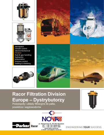 aerospace climate control electromechanical filtration fluid & gas handling hydraulics pneumatics process control sealing & shielding Racor Filtration Division Europe – Dystrybutorzy Podzespoły i układy filtracyjne do paliw, powietrza i węglowodorów ul. Hangarowa 8, 70-767 Szczecin tel. : +48 +91 4640 641 fax : +48 +91 4627 359 www.phu-nova.eu e-mail: [email protected] Wyroby dla dystrybutorów – Wprowadzenie Najlepsze rozwiązania Od ponad 30 lat firma Parker opracowuje Innowacje w konstrukcji i technologii i wdraża nowe rozwiązania w dziedzinie Jako jeden z wiodących światowych filtrowania paliw i separacji wody, oferując producentów wyrobów z dziedziny techniki je producentom oryginalnego sprzętu i filtracyjnej szczycimy się zaangażowaniem końcowym użytkownikom. Informacje zawarte w postęp techniczny i innowacje i rolą, jaką w niniejszym katalogu mają pomóc naszym odgrywają nasi dystrybutorzy, zapewniając dystrybutorom w znajdowaniu najważniejszych serwis, pomoc techniczną i dostępność wyrobów – zespołów filtrujących, wymiennych najnowszych wyrobów na poziomie lokalnym. wkładów filtrujących i innych – przeznaczonych specjalnie dla sektora MRO (konserwacji, napraw i przeglądów). Filtry puszkowe (spin-on) Odlewane aluminiowe głowice z wieloma portami instaluje się równie łatwo jak w przypadku wyposażenia dodatkowego. W głowice montażowe wbudowane są pompy zalewowe o dużej mocy. Seria Turbine Podzespoły z wysokogatunkowego aluminium oraz powłoki proszkowe pozwalają użytkownikowi zapomnieć o problemach korozji. Mocny i trwały wspornik z jedną śrubą montażową charakteryzuje się dwukrotnie większą odpornością na wibracje. Nagrzewnice o mocy 300 W ułatwiają rozruch na zimno. Standardowym wyposażeniem są termostaty, bez których filtry nie mogłyby pracować w nowoczesnych silnikach sterowanych układami elektronicznymi Polimerowe obudowy wytrzymują skrajne temperatury i są odporne na udary. Spust samoodpowietrzający. Pojedynczy obrót – obudowę filtra opróżnia się szybko, łatwo i bez zanieczyszczania otoczenia. Materiał filtrujący Aquabloc usuwa wodę z paliwa – silnik pozostaje czysty, nie wnikają do niego zanieczyszczenia ani woda i nie jest narażony na korozję. Najlepsze z najlepszych uszczelki gwarantują całkowite, pewne i niezawodne uszczelnienie. Polimerowe obudowy filtrów są praktycznie niezniszczalne. Nie zmieniają barwy pod wpływem alkoholu, dodatków do paliw ani promieniowania ultrafioletowego – pozostają zawsze przezroczyste. Do większości modeli oferujemy również obudowy odlewane z aluminium Do większości modeli oferujemy bardzo przydatne wyposażenie dodatkowe w postaci czujnika wody i czujników podciśnienia, sygnalizujących potrzebę przeprowadzenia serwisu. Harmonijkowe wkłady filtrujące Aquabloc II charakteryzują się większą czynną powierzchnią filtracji paliwa i zwiększoną zdolnością zatrzymywania zanieczyszczeń. Spust z automatycznym odpowietrzaniem i uszczelnieniem zupełnym eliminuje wycieki i przyśpiesza obsługę. Całoroczna eksploatacja 2 Przezroczyste obudowy filtrów Racor, wykonane z wysokogatunkowych polimerów, wytrzymują najtrudniejsze warunki klimatyczne i spełniają wymagania najbardziej odpowiedzialnych zastosowań. Nie zmieniają barwy pod wpływem promieniowania ultrafioletowego. Są niewrażliwe na działanie substancji chemicznych i dodatków uszlachetniających, występujących w paliwach do silników wysokoprężnych. Wytrzymują temperatury poniżej zera i są odporne na uderzenia i inne zagrożenia występujące podczas jazdy. Zamawiając zamienny wkład filtrujący Aquabloc otrzymuje się także komplet wszystkich elementów i uszczelek potrzebnych do jego zainstalowania. Wkład Aquabloc II jest wykonany z wysokogatunkowej celulozy zmieszanej z żywicami i poddanej specjalnej obróbce hemiicznej. Odpowietrzanie skrzyni korbowej Najlepsza marka w technice filtracji paliw oznacza najdoskonalsze wyroby Każdy silnik pracuje lepiej, gdy jest wyposażony w układ oczyszczający i podgrzewający paliwo, usuwający wodę i sygnalizujący potrzebę przeprowadzenia serwisu. Takie są układy Racor serii Turbine – najbardziej kompleksowe, wydajne i niezawodne systemy ochrony silników dużej mocy. W istocie chronią pieniądze zainwestowane w silniki i paliwo. Z przedmuchem gazów do skrzyni korbowej mamy do czynienia wtedy, kiedy gazy spalinowe pod wysokim ciśnieniem przedostają się do niej wokół pierścieni tłokowych. Przepływając przez nią zanieczyszczają się mgłą olejową. Poprzez otwarte, niewyposażone w filtry odpowietrzniki skrzyń korbowych mgła olejowa z cząstkami sadzy wydostaje się do atmosfery. Unikalny regulator ciśnienia w skrzyni korbowej z wbudowanym zaworem obejściowym do minimum zmniejszającym zmiany ciśnienia w skrzyni. Nadmierne skoki ciśnienia w skrzyni korbowej mogą doprowadzić do uszkodzenia uszczelek i spowodować utratę oleju i inne problemy. Trwałe podzespoły z nylonu zbrojonego włóknem szklanym. Wysoka sprawność separacji oleju do 0,3μm. Kolor pokrywki wkładu filtrującego mówi o jego przeznaczeniu –filtry pierwotne 30 μm mają pokrywki czerwone, filtry pierwotne i wtórne 10 μm pokrywki niebieskie, a filtry wtórne (końcowe) 2 μm pokrywki brązowe. Optymalną pracę filtrów gwarantują tylko oryginalne wkłady filtrujące Racor. Ukształtowany w pokrywce uchwyt ułatwia wymianę wkładu. Wkłady Aquabloc II odfiltrowują obecne w paliwie, a szkodliwe dla silnika drobne cząstki kurzu i brudu oraz glony. Wkłady Aquabloc II są odporne na korozję – pokrywki wykonane są z tworzywa polimerowego, które nigdy nie koroduje. Zwrotny zawór spustowy umożliwia zawrócenie zebranego oleju do skrzyni korbowej. Dzięki temu nie trzeba zbyt często spuszczać oleju zebranego w filtrze, a zużycie oleju znacznie maleje. Ze względu na ochronę środowiska naturalnego EPA i 