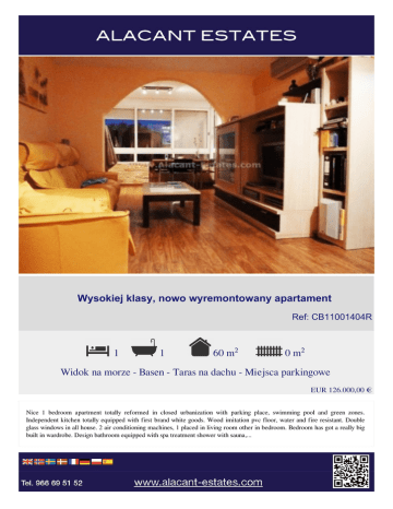 Wysokiej klasy, nowo wyremontowany apartament Ref: CB11001404R 1 1 60 m² 0 m² Widok na morze - Basen - Taras na dachu - Miejsca parkingowe EUR 126.000,00 € Nice 1 bedroom apartment totally reformed in closed urbanization with parking place, swimming pool and green zones. Independent kitchen totally equipped with first brand white goods. Wood imitation pvc floor, water and fire resistant. Double glass windows in all house. 2 air conditioning machines, 1 placed in living room other in bedroom. Bedroom has got a really big built in wardrobe. Design bathroom equipped with spa treatment shower with sauna,... Powered by TCPDF (www.tcpdf.org)