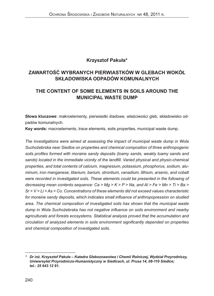 Ochrona Środowiska i Zasobów Naturalnych nr 48, 2011 r. Krzysztof Pakuła* ZAWARTOŚĆ WYBRANYCH PIERWIASTKÓW W GLEBACH WOKÓŁ SKŁADOWISKA ODPADÓW KOMUNALNYCH THE CONTENT OF SOME ELEMENTS IN SOILS AROUND THE MUNICIPAL WASTE DUMP Słowa kluczowe: makroelementy, pierwiastki śladowe, właściwości gleb, składowisko odpadów komunalnych. Key words: macroelements, trace elements, soils properties, municipal waste dump. The investigations were aimed at assessing the impact of municipal waste dump in Wola Suchożebrska near Siedlce on properties and chemical composition of three anthropogenic soils profiles formed with moraine sandy deposits (loamy sands, weakly loamy sands and sands) located in the immediate vicinity of the landfill. Varied physical and physic-chemical properties, and total contents of calcium, magnesium, potassium, phosphorus, sodium, aluminum, iron manganese, titanium, barium, strontium, vanadium, lithium, arsenic, and cobalt were recorded in investigated soils. These elements could be presented in the following of decreasing mean contents sequence: Ca > Mg > K > P > Na, and Al > Fe > Mn > Ti > Ba > Sr > V > Li > As > Co. Concentrations of these elements did not exceed values characteristic for moraine sandy deposits, which indicates small influence of anthropopression on studied area. The chemical composition of investigated soils has shown that the municipal waste dump in Wola Suchożebrska has not negative influence on soils environment and nearby agriculturals and forests ecosystems. Statistical analysis proved that the accumulation and circulation of analyzed elements in soils environment significantly depended on properties and chemical composition of investigated soils. * Dr inż. Krzysztof Pakuła – Katedra Gleboznawstwa i Chemii Rolniczej, Wydział Przyrodniczy, Uniwersytet Przyrodniczo-Humanistyczny w Siedlcach, ul. Prusa 14, 08-110 Siedlce; tel.: 25 643 12 91. 240 Zawartość wybranych pierwiastków w glebach wokół składowiska odpadów komunalnych 1. WPROWADZENIE Gleba stanowi podstawowy element środowiska przyrodniczego, który narażony jest na zanieczyszczenie i stopniową degradację ze strony deponowanych w niej pierwiastków pochodzących ze źródeł antropogenicznych [Kabata-Pendias, Pendias 1999]. W Polsce unieszkodliwianie odpadów poprzez składowanie jest nadal jedną z najczęściej stosowanych metod. Składowiska odpadów komunalnych należą do potencjalnych źródeł zanieczyszczeń, dlatego też wskazany jest stały monitoring ich wpływu na środowisko naturalne i agralne. Gleby położone wokół takich składowisk narażone są m.in. na zanieczyszczenie różnorodnymi związkami pierwiastków pochodzącymi z odcieków, pyłów oraz odpadów wynoszonych przez wiatr z obszaru eksploatowanych składowisk. Badania gleboznawcze pozwalają ocenić wpływ przemian zgromadzonych odpadów na skład chemiczny i aktywność biologiczną gleb w rejonie eksploatowanego składowiska oraz określić strefy (poziomy genetyczne oraz głębokość ich występowania) depozycji pierwiastków i możliwość ich przemieszczania w profilu glebowym [Ahel i in. 1998, Meller i in. 2005, Rosik-Dulewska 2005]. Celem niniejszej pracy była ocena oddziaływania składowiska odpadów komunalnych na właściwości i skład chemiczny gleb położonych w jego bezpośrednim sąsiedztwie. 2. MATERIAŁ I METODY Składowisko odpadów komunalnych zlokalizowane na wzgórzu morenowym w miejscowości Wola Suchożebrska koło Siedlec (we wschodniej części województwa mazowieckiego, na Wysoczyźnie Siedleckiej w granicach Niziny Południowopodlaskiej), funkcjonuje od 1986 r. i ma kwatery eksploatacyjne o powierzchni 6,40 ha. Składowane są tutaj wyłącznie odpady komunalne i przemysłowe typu komunalnego z Siedlec i okolic. Teren składowiska nie ma naturalnej bariery geologicznej w związku z tym, aby zabezpieczyć glebę i wody przed wyciekami dno składowiska zostało uszczelnione folią oraz wykonano system drenażu podfoliowego i nadfoliowego. Obiektem badań były trzy profile gleb antropogenicznych o niewykształconym profilu, zlokalizowane w odległości około 10 m od podstawy wału okalającego kwaterę eksploatacyjną składowiska, w jego części: północno-wschodniej (profil nr I – N: 52°14’6’’, E: 22°14’20’’), północno-zachodniej (profil nr II – N: 52°14’0’’, E: 22°14’15’’) i południowej (profil nr III – N: 52°13’48’’, E: 22°14’29’’). W powietrznie suchych próbkach gleby pobranych z poszczególnych wastw 3 profili glebowych zbadano: skład granulometryczny według Polskiego Towarzystwa Gleboznawczego [Klasyfikacja…2009] – metodą areometryczną, pH w 1 mol KCl·dm-3 – potencjometrycznie, węgiel związków organicznych (Corg) – metodą oksydacyjno-miareczkową [Kalembasa, Kalembasa 1992], azot ogólny (Nog) – metodą Kiejdahla, kwasowość cał- kowitą (hydrolityczną – Hcał) i sumę kationów zasadowych (S) – metodą Kappena, na pod- 241 Krzysztof Pakuła stawie których obliczono pojemność sorpcyjną gleby (T) i stopień wysycenia glebowego kompleksu sorpcyjnego zasadami (V). Zawartość ogólną P, K, Ca, Mg, Na, Fe, Al, Mn, Co, Li, Ti, Ba, Sr, V, As – oznaczono metodą ICP-AES, po mineralizacji mikrofalowej w mieszaninie stężonego HCl i HNO3 (3 :1). Dla poszczególnych warstw badanych gleb obliczono współczynniki wzbogacenia (w.w.) w analizowane pierwiastki (w stosunku do ich zawartości w najniżej położonej warstwie gleby). Uzyskane wyniki opracowano statystycznie, podano w postaci współczynników korelacji prostej i zmienności oraz wartości odchylenia standardowego. 3. WYNIKI I DYSKUSJA Wybrane fizyczne, fizykochemiczne i chemiczne właściwości badanych gleb antropogenicznych były charakterystyczne dla morenowych utworów piaszczystych (piaski gliniaste przewarstwione piaskami słabo gliniastymi i podścielone piaskiem luźnym) zlodowacenia środkowopolskiego (ta