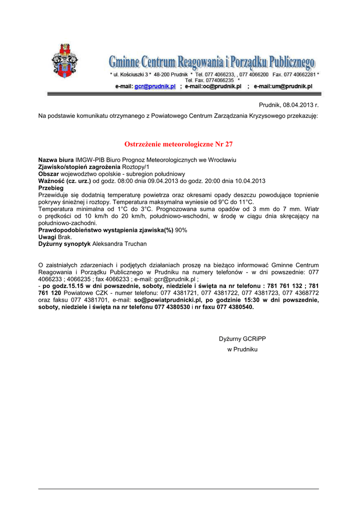 Prudnik, 08.04.2013 r. Na podstawie komunikatu otrzymanego z Powiatowego Centrum Zarządzania Kryzysowego przekazuję: Ostrzeżenie meteorologiczne Nr 27 Nazwa biura IMGW-PIB Biuro Prognoz Meteorologicznych we Wrocławiu Zjawisko/stopień zagrożenia Roztopy/1 Obszar wojewodztwo opolskie - subregion południowy Ważność (cz. urz.) od godz. 08:00 dnia 09.04.2013 do godz. 20:00 dnia 10.04.2013 Przebieg Przewiduje się dodatnią temperaturę powietrza oraz okresami opady deszczu powodujące topnienie pokrywy śnieżnej i roztopy. Temperatura maksymalna wyniesie od 9°C do 11°C. Temperatura minimalna od 1°C do 3°C. Prognozowana suma opadów od 3 mm do 7 mm. Wiatr o prędkości od 10 km/h do 20 km/h, południowo-wschodni, w środę w ciągu dnia skręcający na południowo-zachodni. Prawdopodobieństwo wystąpienia zjawiska(%) 90% Uwagi Brak. Dyżurny synoptyk Aleksandra Truchan O zaistniałych zdarzeniach i podjętych działaniach proszę na bieżąco informować Gminne Centrum Reagowania i Porządku Publicznego w Prudniku na numery telefonów - w dni powszednie: 077 4066233 ; 4066235 ; fax 4066233 ; e-mail: [email protected] ; - po godz.15.15 w dni powszednie, soboty, niedziele i święta na nr telefonu : 781 761 132 ; 781 761 120 Powiatowe CZK - numer telefonu: 077 4381721, 077 4381722, 077 4381723, 077 4368772 oraz faksu 077 4381701, e-mail: [email protected], po godzinie 15:30 w dni powszednie, soboty, niedziele i święta na nr telefonu 077 4380530 i nr faxu 077 4380540. Dyżurny GCRiPP w Prudniku
