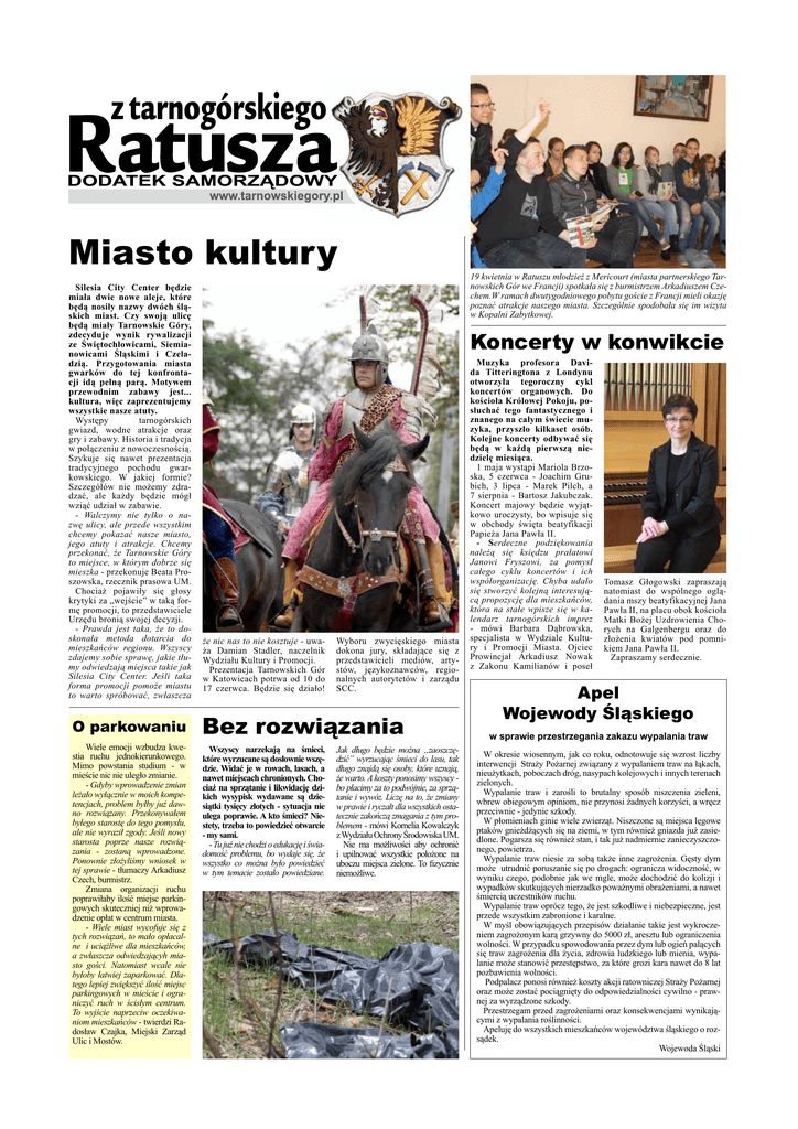 Miasto kultury Silesia City Center będzie miała dwie nowe aleje, które będą nosiły nazwy dwóch śląskich miast. Czy swoją ulicę będą miały Tarnowskie Góry, zdecyduje wynik rywalizacji ze Świętochłowicami, Siemianowicami Śląskimi i Czeladzią. Przygotowania miasta gwarków do tej konfrontacji idą pełną parą. Motywem przewodnim zabawy jest... kultura, więc zaprezentujemy wszystkie nasze atuty. Występy tarnogórskich gwiazd, wodne atrakcje oraz gry i zabawy. Historia i tradycja w połączeniu z nowoczesnością. Szykuje się nawet prezentacja tradycyjnego pochodu gwarkowskiego. W jakiej formie? Szczegółów nie możemy zdradzać, ale każdy będzie mógł wziąć udział w zabawie. - Walczymy nie tylko o nazwę ulicy, ale przede wszystkim chcemy pokazać nasze miasto, jego atuty i atrakcje. Chcemy przekonać, że Tarnowskie Góry to miejsce, w którym dobrze się mieszka - przekonuje Beata Proszowska, rzecznik prasowa UM. Chociaż pojawiły się głosy krytyki za „wejście” w taką formę promocji, to przedstawiciele Urzędu bronią swojej decyzji. - Prawda jest taka, że to doskonała metoda dotarcia do mieszkańców regionu. Wszyscy zdajemy sobie sprawę, jakie tłumy odwiedzają miejsca takie jak Silesia City Center. Jeśli taka forma promocji pomoże miastu to warto spróbować, zwłaszcza O parkowaniu Wiele emocji wzbudza kwestia ruchu jednokierunkowego. Mimo powstania studium - w mieście nic nie uległo zmianie. - Gdyby wprowadzenie zmian leżało wyłącznie w moich kompetencjach, problem byłby już dawno rozwiązany. Przekonywałem byłego starostę do tego pomysłu, ale nie wyraził zgody. Jeśli nowy starosta poprze nasze rozwiązania - zostaną wprowadzone. Ponownie złożyliśmy wniosek w tej sprawie - tłumaczy Arkadiusz Czech, burmistrz. Zmiana organizacji ruchu poprawiłaby ilość miejsc parkingowych skuteczniej niż wprowadzenie opłat w centrum miasta. - Wiele miast wycofuje się z tych rozwiązań, to mało opłacalne i uciążliwe dla mieszkańców, a zwłaszcza odwiedzającyh miasto gości. Natomiast wcale nie byłoby łatwiej zaparkować. Dlatego lepiej zwiększyć ilość miejsc parkingowych w mieście i ograniczyć ruch w ścisłym centrum. To wyjście naprzeciw oczekiwaniom mieszkańców - twierdzi Radosław Czajka, Miejski Zarząd Ulic i Mostów. 19 kwietnia w Ratuszu młodzież z Mericourt (miasta partnerskiego Tarnowskich Gór we Francji) spotkała się z burmistrzem Arkadiuszem Czechem.W ramach dwutygodniowego pobytu goście z Francji mieli okazję poznać atrakcje naszego miasta. Szczególnie spodobała się im wizyta w Kopalni Zabytkowej. Koncerty w konwikcie że nic nas to nie kosztuje - uważa Damian Stadler, naczelnik Wydziału Kultury i Promocji. Prezentacja Tarnowskich Gór w Katowicach potrwa od 10 do 17 czerwca. Będzie się działo! Wyboru zwycięskiego miasta dokona jury, składające się z przedstawicieli mediów, artystów, językoznawców, regionalnych autorytetów i zarządu SCC. Bez rozwiązania Wszyscy narzekają na śmieci, które wyrzucane są dosłownie wszędzie. Widać je w rowach, lasach, a nawet miejscach chronionych. Chociaż na sprzątanie i likwidację dzikich wysypisk wydawane są dziesiątki tysięcy złotych - sytuacja nie ulega poprawie. A kto śmieci? Niestety, trzeba to powiedzieć otwarcie - my sami. - Tu już nie chodzi o edukację i świadomość problemu, bo wydaje się, że wszystko co można było powiedzieć w tym temacie zostało powiedziane. Jak długo będzie można „zaoszczędzić” wyrzucając śmieci do lasu, tak długo znajdą się osoby, które uznają, że warto. A koszty ponosimy wszyscy bo płacimy za to podwójnie, za sprzątanie i wywóz. Liczę na to, że zmiany w prawie i ryczałt dla wszystkich ostatecznie zakończą zmagania z tym problemem - mówi Kornelia Kowalczyk z Wydziału Ochrony Środowiska UM. Nie ma możliwości aby ochronić i upilnować wszystkie położone na uboczu miejsca zielone. To fizycznie niemożliwe. Muzyka profesora Davida Titteringtona z Londynu otworzyła tegoroczny cykl koncertów organowych. Do kościoła Królowej Pokoju, posłuchać tego fantastycznego i znanego na całym świecie muzyka, przyszło kilkaset osób. Kolejne koncerty odbywać się będą w każdą pierwszą niedzielę miesiąca. 1 maja wystąpi Mariola Brzoska, 5 czerwca - Joachim Grubich, 3 lipca - Marek Pilch, a 7 sierpnia - Bartosz Jakubczak. Koncert majowy będzie wyjątkowo uroczysty, bo wpisuje się w obchody święta beatyfikacji Papieża Jana Pawła II. - Serdeczne podziękowania należą się księdzu prałatowi Janowi Fryszowi, za pomysł całego cyklu koncertów i ich współorganizację. Chyba udało się stworzyć kolejną interesującą propozycję dla mieszkańców, która na stałe wpisze się w kalendarz tarnogórskich imprez - mówi Barbara Dąbrowska, specjalista w Wydziale Kultury i Promocji Miasta. Ojciec Prowincjał Arkadiusz Nowak z Zakonu Kamilianów i poseł Tomasz Głogowski zapraszają natomiast do wspólnego oglądania mszy beatyfikacyjnej Jana Pawła II, na placu obok kościoła Matki Bożej Uzdrowienia Chorych na Galgenbergu oraz do złożenia kwiatów pod pomnikiem Jana Pawła II. Zapraszamy serdecznie. Apel Wojewody Śląskiego w sprawie przestrzegania zakazu wypalania traw W okresie wiosennym, jak co roku, odnotowuje się wzrost liczby interwencji Straży Pożarnej związany z wypalaniem traw na łąkach, nieużytkach, poboczach dróg, nasypach kolejowych i innych terenach zielonych. Wypalanie traw i zarośli to brutalny sposób niszczenia zieleni, wbrew obiegowym opiniom, nie przynosi żadnych korzyści, a wręcz przeciwnie - jedynie szkody. W płomieniach ginie wiele zwierząt. Niszczone są miejsca lęgowe ptaków gnieżdżących się na ziemi, w tym również gniazda już zasiedlone. Pogarsza się również stan, i tak już nadmiernie zanieczyszczonego, powietrza. Wypalanie traw niesie za sobą także inne zagrożenia. Gęsty dym może utrudni