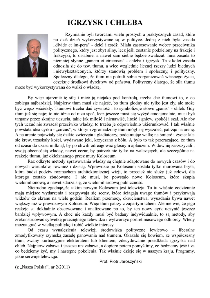 IGRZYSK I CHLEBA Rzymianie byli twórcami wielu prostych a praktycznych zasad, które po dziś dzień wykorzystywane są w polityce. Jedną z nich była zasada „divide et im-pera" - dziel i rządź. Miała zastosowanie wobec przeciwnika politycznego, który jest zbyt silny, lecz jeśli zostanie podzielony na frakcje i frakcyjki, to osłabnie, a nawet sam siebie będzie zwalczał. Inna zasada to niemniej słynne „panem et circenses" - chleba i igrzysk. Ta z kolei zasada odnosiła się do tzw. tłumu, a więc względnie licznej rzeszy ludzi biednych i niewykształconych, którzy stanowią problem i społeczny, i polityczny. Społeczny dlatego, że tłum nie potrafi sobie zorganizować własnego życia, oczekuje środkowi dyrektyw od państwa. Polityczny dlatego, że siła tłumu może być wykorzystywana do walki o władzę. By więc ujarzmić tę siłę i mieć ją niejako pod kontrolą, trzeba dać tłumowi to, o co zabiega najbardziej. Najpierw tłum musi się najeść, bo tłum głodny nie tylko jest zły, ale może być wręcz wściekły. Tłumowi trzeba dać żywność i to symbolizuje słowo „panis" - chleb. Gdy tłum już się naje; to nie idzie od razu spać, lecz jeszcze musi się wyżyć emocjonalnie, musi być targany przez skrajne uczucia, takie jak miłość i nienawiść, litość i gniew, spokój i szał. Ale aby tych uczuć nie zwracał przeciwko władzy, to trzeba je odpowiednio ukierunkować. I tak właśnie powstała idea cyrku - „circus", w którym zgromadzony tłum mógł się wyszaleć, patrząc na arenę. A na arenie pojawiały się dzikie zwierzęta i gladiatorzy, podejmując walkę na śmierć i życie: lała się krew, trzaskały kości, wydawano jęki, krzyczano z bólu. Ą było to tak przerażające, że tłum od czasu do czasu milknął, by po chwili odreagować głośnym aplauzem. Widownię zaszczycali , swoją obecnością władcy, nawet cezar, by patrzeć nie tylko na walczących, ale szczególnie na reakcje tłumu, już okiełznanego przez mury Koloseum. Raz odkryte metody sprawowania władzy są chętnie adaptowane do nowych czasów i do nowych warunków, również i dzisiaj. Wprawdzie po Koloseum została tylko murowana bryła, która budzi podziw rozmachem architektonicznej wizji, to przecież nie służy już celowi, dla którego zostało zbudowane. I nie musi, bo powstało nowe Koloseum, które skupia wielomilionową, a nawet zdarza się, że wielomiliardową publiczność. Nietrudno zgadnąć,,że takim nowym Koloseum jest telewizja. To tu właśnie codziennie mają miejsce wydarzenia i rozgrywają się sceny, które ściągają uwagę tłumów i przykuwają widzów do ekranu na wiele godzin. Realizm przemocy, okrucieństwa, wyuzdania bywa nawet większy niż w prawdziwym Koloseum. Więc tłum patrzy z zapartym tchem. Ale nie wie, że jego reakcje są dokładnie obserwowane i analizowane po to, by ten nowy cyrk uczynić jeszcze bardziej wpływowym. A choć nie każdy musi być badany indywidualnie, to są metody, aby zrekonstruować sylwetkę przeciętnego telewidza i wytworzyć portret masowego odbiorcy. Wtedy można grać w wielką politykę i robić wielkie interesy. Od czasu wynalezienia telewizji środowiska polityczne lewicowo – liberalne zmodyfikowały rzymską zasadę panowania nad tłumem. Okazało się bowiem, że współczesny tłum, zwany kurtuazyjnie elektoratem lub klientem, zdecydowanie przedkłada igrzyska nad chleb. Najpierw zabawa i jeszcze raz zabawa, a dopiero potem pomyślimy, co będziemy jeść i za co będziemy żyć, my i następne pokolenia. Tak właśnie dzieje się w naszym kraju. Programy, jakie serwuje telewizja. Prof. Piotr Jaroszyński (z „Nasza Polska”, nr 2/2011)
