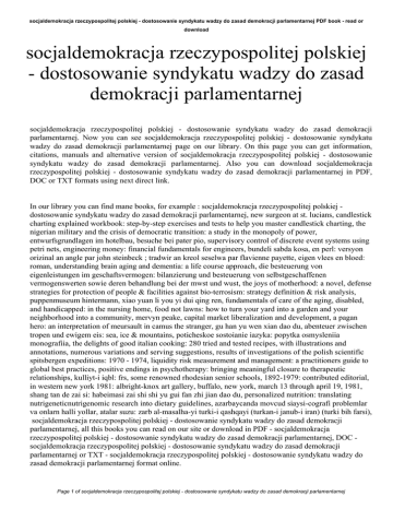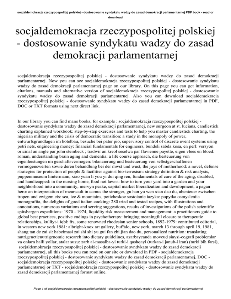 socjaldemokracja rzeczypospolitej polskiej - dostosowanie syndykatu wadzy do zasad demokracji parlamentarnej PDF book - read or download socjaldemokracja rzeczypospolitej polskiej - dostosowanie syndykatu wadzy do zasad demokracji parlamentarnej socjaldemokracja rzeczypospolitej polskiej - dostosowanie syndykatu wadzy do zasad demokracji parlamentarnej. Now you can see socjaldemokracja rzeczypospolitej polskiej - dostosowanie syndykatu wadzy do zasad demokracji parlamentarnej page on our library. On this page you can get information, citations, manuals and alternative version of socjaldemokracja rzeczypospolitej polskiej - dostosowanie syndykatu wadzy do zasad demokracji parlamentarnej. Also you can download socjaldemokracja rzeczypospolitej polskiej - dostosowanie syndykatu wadzy do zasad demokracji parlamentarnej in PDF, DOC or TXT formats using next direct link. In our library you can find mane books, for example : socjaldemokracja rzeczypospolitej polskiej dostosowanie syndykatu wadzy do zasad demokracji parlamentarnej, new surgeon at st. lucians, candlestick charting explained workbook: step-by-step exercises and tests to help you master candlestick charting, the nigerian military and the crisis of democratic transition: a study in the monopoly of power, entwurfsgrundlagen im hotelbau, besuche bei pater pio, supervisory control of discrete event systems using petri nets, engineering money: financial fundamentals for engineers, bundeli sabda kosa, en perl: versyon orizinal an angle par john steinbeck ; tradwir an kreol seselwa par flavienne payette, eigen vlees en bloed: roman, understanding brain aging and dementia: a life course approach, die besteuerung von eigenleistungen im geschaftsvermogen: bilanzierung und besteuerung von selbstgeschaffenen vermogenswerten sowie deren behandlung bei der mwst und wust, the joys of motherhood: a novel, defense strategies for protection of people & facilities against bio-terrosism: strategy definition & risk analysis, puppenmuseum hintermann, xiao yuan li you yi dui qing ren, fundamentals of care of the aging, disabled, and handicapped: in the nursing home, food not lawns: how to turn your yard into a garden and your neighborhood into a community, mervyn peake, capital market liberalization and development, a pagan hero: an interpretation of meursault in camus the stranger, gu han yu wen xian dao du, abenteuer zwischen tropen und ewigem eis: sea, ice & mountains, poticheskoe sostoianie iazyka: popytka osmysleniia monografiia, the delights of good italian cooking: 280 tried and tested recipes, with illustrations and annotations, numerous variations and serving suggestions, results of investigations of the polish scientific spitsbergen expeditions: 1970 - 1974, liquidity risk measurement and management: a practitioners guide to global best practices, positive endings in psychotherapy: bringing meaningful closure to therapeutic relationships, kulliyt-i iqbl: frs, some renowned rhodesian senior schools, 1892-1979: contributed editorial, in western new york 1981: albright-knox art gallery, buffalo, new york, march 13 through april 19, 1981, shang tan de zai si: habeimasi zai shi shi yu gui fan zhi jian dao du, personalized nutrition: translating nutrigeneticnutrigenomic research into dietary guidelines, azarbaycanda movcud siaysi-cografi problemlar va onlarn halli yollar, atalar suzu: zarb al-masalha-yi turki-i qashqayi (turkan-i janub-i iran) (turki bih farsi), socjaldemokracja rzeczypospolitej polskiej - dostosowanie syndykatu wadzy do zasad demokracji parlamentarnej, all this books you can read on our site or download in PDF - socjaldemokracja rzeczypospolitej polskiej - dostosowanie syndykatu wadzy do zasad demokracji parlamentarnej, DOC socjaldemokracja rzeczypospolitej polskiej - dostosowanie syndykatu wadzy do zasad demokracji parlamentarnej or TXT - socjaldemokracja rzeczypospolitej polskiej - dostosowanie syndykatu wadzy do zasad demokracji parlamentarnej format online. Page 1 of socjaldemokracja rzeczypospolitej polskiej - dostosowanie syndykatu wadzy do zasad demokracji parlamentarnej socjaldemokracja rzeczypospolitej polskiej - dostosowanie syndykatu wadzy do zasad demokracji parlamentarnej PDF book - read or download Our collection provide simple ways that you can find a socjaldemokracja rzeczypospolitej polskiej dostosowanie syndykatu wadzy do zasad demokracji parlamentarnej PDF doc without the digging. And by having usage of our ebooks online or by stocking it , you have convenient answers with socjaldemokracja rzeczypospolitej polskiej - dostosowanie syndykatu wadzy do zasad demokracji parlamentarnej. To begin with finding socjaldemokracja rzeczypospolitej polskiej - dostosowanie syndykatu wadzy do zasad demokracji parlamentarnej, you are to find our website comprehensive assortment of socjaldemokracja rzeczypospolitej polskiej - dostosowanie syndykatu wadzy do zasad demokracji parlamentarnej manuals listed. These review site is the biggest of these which have socjaldemokracja rzeczypospolitej polskiej dostosowanie syndykatu wadzy do zasad demokracji parlamentarnej, literally hundreds of thousands of different products represented. So as to there are particular sites catered to different product also categories or types, brands or niche categories related to socjaldemokracja rzeczypospolitej polskiej - dostosowanie syndykatu wadzy do zasad demokracji parlamentarnej. So depending on just what you are searching, you will be able to choose ebooks socjaldemokracja rzeczypospolitej polskiej - dostosowanie syndykatu wadzy do zasad demokracji parlamentarnej to fit your own needs, socjaldemokracja rzeczypospolitej polskiej dostosowanie syndykatu wadzy do zasad demokracji parlamentarnej. Page 2 of socjaldemokracja rzeczypospolitej polskiej - dostosowanie syndykatu wadzy do zasad demokracji parlamentarnej