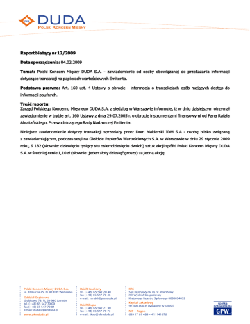 Raport bieżący nr 12/2009 Data sporządzenia: 04.02.2009 Temat: Polski Koncern Mięsny DUDA S.A. - zawiadomienie od osoby obowiązanej do przekazania informacji dotyczące transakcji na papierach wartościowych Emitenta. Podstawa prawna: Art. 160 ust. 4 Ustawy o obrocie - informacja o transakcjach osób mających dostęp do informacji poufnych. Treść raportu: Zarząd Polskiego Koncernu Mięsnego DUDA S.A. z siedzibą w Warszawie informuje, iż w dniu dzisiejszym otrzymał zawiadomienie w trybie art. 160 Ustawy z dnia 29.07.2005 r. o obrocie instrumentami finansowymi od Pana Rafała Abratańskiego, Przewodniczącego Rady Nadzorczej Emitenta. Niniejsze zawiadomienie dotyczy transakcji sprzedaży przez Dom Maklerski IDM S.A - osobę blisko związaną z zawiadamiającym, podczas sesji na Giełdzie Papierów Wartościowych S.A. w Warszawie w dniu 29 stycznia 2009 roku, 9 182 (słownie: dziewięciu tysięcy stu osiemdziesięciu dwóch) sztuk akcji spółki Polski Koncern Mięsny DUDA S.A. w średniej cenie 1,10 zł (słownie: jeden złoty dziesięć groszy) za jedną akcję. Investment objectives Strengthening the raw materials base Development and centralization of meat cutting at Grąbkowo Acting capital Ukraine – transportation base, meat and breeding sector Estimated value 40 million PLN 15 million PLN 20 million PLN 30 million PLN Polski Koncern Mięsny DUDA S.A. is a group of companies from the agricultural and food sector from all over Poland, connected by capital. The leader of the group, which currently employs over 2500 persons, is Polski Koncern Mięsny DUDA S.A., with the head office in Warsaw – a listed company since 2002. Five years since its entry into the Warsaw Stock Exchange, PKM DUDA has become one of three biggest companies operating on the Polish meat market, which on the whole encompasses over 30 companies connected by capital. The group is composed of the following companies: PKM DUDA S.A., Polska Wołowina, Hunter Wild, Makton, Stół Polski, NetBrokers, EURO DUDA, PZZ Dystrybucja, DUDA Distribution, New Logostic, Meat Service, AGRO DUDA, Wizental, Bioenergia, Agronet, Agrofirm, Agrohop, Agroprof, Rolpol and Przedsiębiorstwo Budowlano – Inwestycyjne. Since 2006, Polski Koncern Mięsny DUDA S.A. has been investing in Ukraine – currently the PKM DUDA S.S. Capital Group encompasses Rosan Agro Capital Group and, among others, Ekspress and Pieprzyk Rogatyn companies. Production plants of Polski Koncern Mięsny DUDA S.A. have the European Union competence and implemented HACCP system. The Group exports its products, among other things, to the majority of the European Union member states and to the markets of the Far East. Additional information: Rafał Oleszak Deputy President of the Management Board Polski Koncern Mięsny DUDA S.A. Grąbkowo 73, 63-930 Jutrosin Phone no.: +48 65 547-21-19, fax: +48 65 547-21-26 www.pkmduda.pl