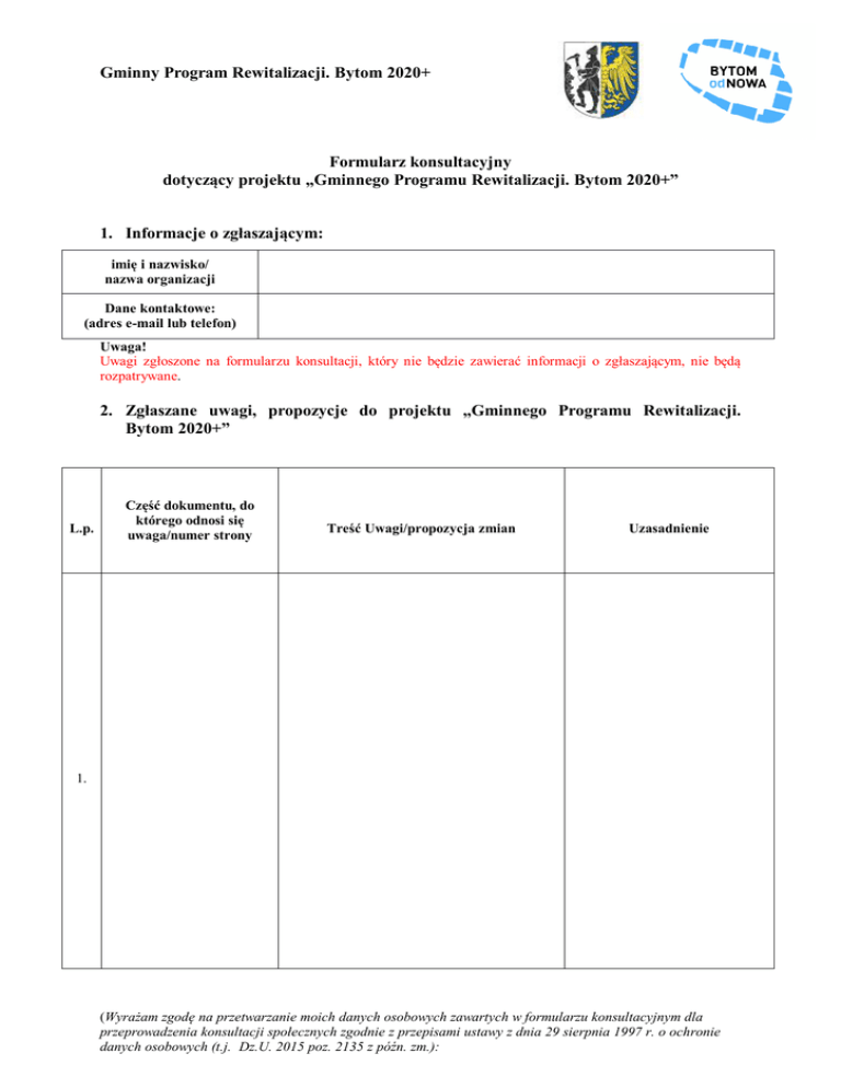 Gminny Program Rewitalizacji. Bytom 2020+ Formularz konsultacyjny dotyczący projektu „Gminnego Programu Rewitalizacji. Bytom 2020+” 1. Informacje o zgłaszającym: imię i nazwisko/ nazwa organizacji Dane kontaktowe: (adres e-mail lub telefon) Uwaga! Uwagi zgłoszone na formularzu konsultacji, który nie będzie zawierać informacji o zgłaszającym, nie będą rozpatrywane. 2. Zgłaszane uwagi, propozycje do projektu „Gminnego Programu Rewitalizacji. Bytom 2020+” L.p. Część dokumentu, do którego odnosi się uwaga/numer strony Treść Uwagi/propozycja zmian Uzasadnienie 1. (Wyrażam zgodę na przetwarzanie moich danych osobowych zawartych w formularzu konsultacyjnym dla przeprowadzenia konsultacji społecznych zgodnie z przepisami ustawy z dnia 29 sierpnia 1997 r. o ochronie danych osobowych (t.j. Dz.U. 2015 poz. 2135 z późn. zm.): Gminny Program Rewitalizacji. Bytom 2020+ L.p. Część dokumentu, do którego odnosi się uwaga/numer strony Treść Uwagi/propozycja zmian Uzasadnienie 2. (Wyrażam zgodę na przetwarzanie moich danych osobowych zawartych w formularzu konsultacyjnym dla przeprowadzenia konsultacji społecznych zgodnie z przepisami ustawy z dnia 29 sierpnia 1997 r. o ochronie danych osobowych (t.j. Dz.U. 2015 poz. 2135 z późn. zm.): Gminny Program Rewitalizacji. Bytom 2020+ L.p. Część dokumentu, do którego odnosi się uwaga/numer strony Treść Uwagi/propozycja zmian Uzasadnienie 3. (Wyrażam zgodę na przetwarzanie moich danych osobowych zawartych w formularzu konsultacyjnym dla przeprowadzenia konsultacji społecznych zgodnie z przepisami ustawy z dnia 29 sierpnia 1997 r. o ochronie danych osobowych (t.j. Dz.U. 2015 poz. 2135 z późn. zm.): Gminny Program Rewitalizacji. Bytom 2020+ Wypełniony formularz prosimy przesłać pocztą elektroniczną na adres: [email protected] w formacie możliwym od edycji (doc., docx.) lub złożyć w sekretariacie Wydziału Strategii i Funduszy Europejskich Urzędu Miejskiego w Bytomiu, 41-902 Bytom, ul. Parkowa 2, I piętro (budynek z windą i przystosowany do potrzeb osób niepełnosprawnych), w poniedziałek w godz. 7.30 do 17.30, od wtorku do piątku w godz. od 7.30 do 15.00. Formularz można także wysłać pocztą tradycyjną na ww. adres. 3. Inne uwagi do projektu „Gminnego Programu Rewitalizacji. Bytom 2020+” ………………………………………………………………………………….. ………………………………………………………………………………….. ………………………………………………………………………………….. ………………………………………………………………………………….. ………………………………………………………………………………….. ………………………………………………………………………………….. ………………………………………………………………………………….. ………………………………………………………………………………….. ………………………………………………………………………………….. ………………………………………………………………………………….. ………………………………………………………………………………….. ………………………………………………………………………………….. ………………………………………………………………………………….. ………………………………………………………………………………….. ………………………………………………………………………………….. ………………………………………………………………………………….. ………………………………………………………………………………….. (Wyrażam zgodę na przetwarzanie moich danych osobowych zawartych w formularzu konsultacyjnym dla przeprowadzenia konsultacji społecznych zgodnie z przepisami ustawy z dnia 29 sierpnia 1997 r. o ochronie danych osobowych (t.j. Dz.U. 2015 poz. 2135 z późn. zm.):