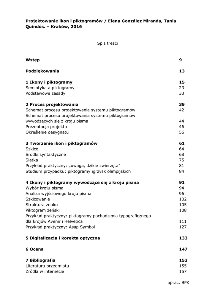 Projektowanie ikon i piktogramów / Elena González Miranda, Tania Quindós. – Kraków, 2016 Spis treści Wstęp 9 Podziękowania 13 1 Ikony i piktogramy Semiotyka a piktogramy Podstawowe zasady 15 23 33 2 Proces projektowania Schemat procesu projektowania systemu piktogramów Schemat procesu projektowania systemu piktogramów wywodzących się z kroju pisma Prezentacja projektu Określenie desygnatu 39 42 3 Tworzenie ikon i piktogramów Szkice Środki syntaktyczne Siatka Przykład praktyczny: „uwaga, dzikie zwierzęta" Studium przypadku: piktogramy igrzysk olimpijskich 61 64 68 75 81 84 4 Ikony i piktogramy wywodzące się z kroju pisma Wybór kroju pisma Analiza wyjściowego kroju pisma Szkicowanie Struktura znaku Piktogram żeński Przykład praktyczny: piktogramy pochodzenia typograficznego dla krojów Avenir i Helvetica Przykład praktyczny: Asap Symbol 91 94 96 102 105 108 5 Digitalizacja i korekta optyczna 133 6 Ocena 147 7 Bibliografia Literatura przedmiotu Źródła w internecie 153 155 157 44 46 56 111 127 oprac. BPK