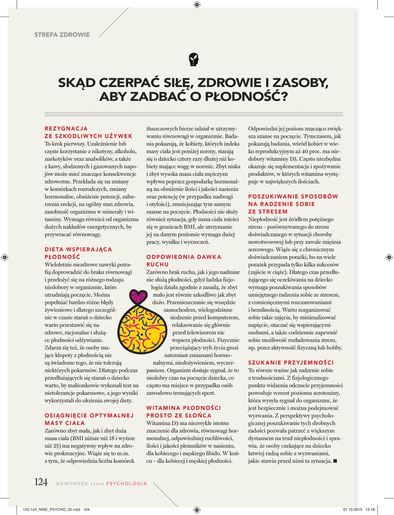 STREFA ZDROWIE SKĄD CZERPAĆ SIŁĘ, ZDROWIE I ZASOBY, ABY ZADBAĆ O PŁODNOŚĆ? R E Z YG N AC J A Z E S Z KO D L I W YC H U Ż Y W E K To krok pierwszy. Uzależnienie lub częste korzystanie z nikotyny, alkoholu, narkotyków oraz anabolików, a także z kawy, słodzonych i gazowanych napojów może mieć znaczące konsekwencje zdrowotne. Przekłada się na zmiany w komórkach rozrodczych, zmiany hormonalne, obniżenie potencji, zaburzenia erekcji, na ogólny stan zdrowia, zasobność organizmu w minerały i witaminy. Wymaga również od organizmu dużych nakładów energetycznych, by przywracać równowagę. D I E TA W S P I E R A J ĄC A PŁODNOŚĆ Wieloletnie niezdrowe nawyki potrafią doprowadzić do braku równowagi i przełożyć się na różnego rodzaju niedobory w organizmie, które utrudniają poczęcie. Można popełniać bardzo różne błędy żywieniowe i dlatego szczególnie w czasie starań o dziecko warto przestawić się na zdrowe, racjonalne i służące płodności odżywianie. Zdarza się też, że osoby mające kłopoty z płodnością nie są świadome tego, że nie tolerują niektórych pokarmów. Dlatego podczas przedłużających się starań o dziecko warto, by małżonkowie wykonali test na nietolerancje pokarmowe, a jego wyniki wykorzystali do ułożenia swojej diety. O S I ĄG N I Ę C I E O P T Y M A L N E J MASY CIAŁA Zarówno zbyt mała, jak i zbyt duża masa ciała (BMI niższe niż 18 i wyższe niż 25) ma negatywny wpływ na zdrowie prokreacyjne. Wiąże się to m.in. z tym, że odpowiednia liczba komórek 124 tłuszczowych bierze udział w utrzymywaniu równowagi w organizmie. Badania pokazują, że kobiety, których indeks masy ciała jest poniżej normy, starają się o dziecko cztery razy dłużej niż kobiety mające wagę w normie. Zbyt niska i zbyt wysoka masa ciała mężczyzn wpływa poprzez gospodarkę hormonalną na obniżenie ilości i jakości nasienia oraz potencję (w przypadku nadwagi i otyłości), zmniejszając tym samym szanse na poczęcie. Płodności nie służy również sytuacja, gdy masa ciała mieści się w granicach BMI, ale utrzymanie jej na danym poziomie wymaga dużej pracy, wysiłku i wyrzeczeń. O D P O W I E D N I A DAW K A RUCHU Zarówno brak ruchu, jak i jego nadmiar nie służą płodności, gdyż ludzka fizjologia działa zgodnie z zasadą, że zbyt mało jest równie szkodliwe jak zbyt dużo. Przemieszczanie się wszędzie samochodem, wielogodzinne siedzenie przed komputerem, relaksowanie się głównie przed telewizorem nie wspiera płodności. Fizycznie przeciążający tryb życia grozi natomiast zmianami hormonalnymi, niedożywieniem, wyczerpaniem. Organizm dostaje sygnał, że to niedobry czas na poczęcie dziecka, co często ma miejsce w przypadku osób zawodowo trenujących sport. W I TA M I N A P Ł O D N O Ś C I PROSTO ZE SŁOŃCA Witamina D3 ma niezwykle istotne znaczenie dla zdrowia, równowagi hormonalnej, odpowiedniej ruchliwości, ilości i jakości plemników w nasieniu, dla kobiecego i męskiego libido. W końcu – dla kobiecej i męskiej płodności. Odpowiedni jej poziom znacząco zwiększa szanse na poczęcie. Tymczasem, jak pokazują badania, wśród kobiet w wieku reprodukcyjnym aż 40 proc. ma niedobory witaminy D3. Często niezbędna okazuje się suplementacja i spożywanie produktów, w których witamina występuje w największych ilościach. P O S Z U K I WA N I E S P O S O B Ó W NA R ADZENIE SOBIE ZE STRESEM Niepłodność jest źródłem potężnego stresu – porównywanego do stresu doświadczanego w sytuacji choroby nowotworowej lub przy zawale mięśnia sercowego. Wiąże się z chronicznym doświadczaniem porażki, bo na wiele porażek przypada tylko kilka sukcesów (zajście w ciąże). Dlatego czas przedłużającego się oczekiwania na dziecko wymaga poszukiwania sposobów umiejętnego radzenia sobie ze stresem, z comiesięcznymi rozczarowaniami i bezsilnością. Warto zorganizować sobie takie zajęcia, by minimalizować napięcie, otaczać się wspierającymi osobami, a także codziennie zapewnić sobie możliwość rozładowania stresu, np. przez aktywność fizyczną lub hobby. S Z U K A N I E P R Z YJ E M N O Ś C I To równie ważne jak radzenie sobie z trudnościami. Z fizjologicznego punktu widzenia odczucie przyjemności powoduje wzrost poziomu serotoniny, która wysyła sygnał do organizmu, że jest bezpiecznie i można podejmować wyzwania. Z perspektywy psychologicznej poszukiwanie tych drobnych radości pozwala patrzeć z większym dystansem na trud niepłodności i sprawia, że osoby czekające na dziecko łatwiej radzą sobie z wyzwaniami, jakie stawia przed nimi ta sytuacja. ^ NEWSWEEK extra PSYCHOLOGIA 122-124_NWE_PSYCHO_02.indd 124 01.10.2015 13:18