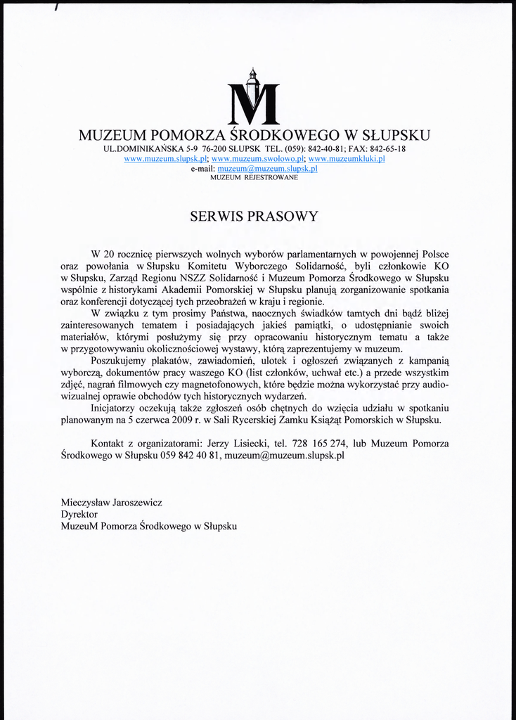 MUZEUM POMORZA ŚRODKOWEGO W SŁUPSKU UL.DOMINIKAŃSKA 5-9 76-200 SŁUPSK TEL. (059): 842-40-81; FAX: 842-65-18 www.muzeum.slupsk.pl;www.muzeum.swolowo.pl:www.muzeumkluki.pl e-tnail: m u z e u m @ m u z e u m . s l u p s k . p l MUZEUM REJESTROWANE SERWIS PRASOWY W 20 rocznicę pierwszych wolnych wyborów parlamentarnych w powojennej Polsce oraz powołania w Słupsku Komitetu Wyborczego Solidarność, byli członkowie KO w Słupsku, Zarząd Regionu NSZZ Solidarność i Muzeum Pomorza Środkowego w Słupsku wspólnie z historykami Akademii Pomorskiej w Słupsku planują zorganizowanie spotkania oraz konferencji dotyczącej tych przeobrażeń w kraju i regionie. W związku z tym prosimy Państwa, naocznych świadków tamtych dni bądź bliżej zainteresowanych tematem i posiadających jakieś pamiątki, o udostępnianie swoich materiałów, którymi posłużymy się przy opracowaniu historycznym tematu a także w przygotowywaniu okolicznościowej wystawy, którą zaprezentujemy w muzeum. Poszukujemy plakatów, zawiadomień, ulotek i ogłoszeń związanych z kampanią wyborczą dokumentów pracy waszego KO (list członków, uchwał etc.) a przede wszystkim zdjęć, nagrań filmowych czy magnetofonowych, które będzie można wykorzystać przy audio wizualnej oprawie obchodów tych historycznych wydarzeń. Inicjatorzy oczekują także zgłoszeń osób chętnych do wzięcia udziału w spotkaniu planowanym na 5 czerwca 2009 r. w Sali Rycerskiej Zamku Książąt Pomorskich w Słupsku. Kontakt z organizatorami: Jerzy Lisiecki, tel. 728 165 274, lub Muzeum Pomorza Środkowego w Słupsku 059 842 40 81, [email protected] Mieczysław Jaroszewicz Dyrektor MuzeuM Pomorza Środkowego w Słupsku