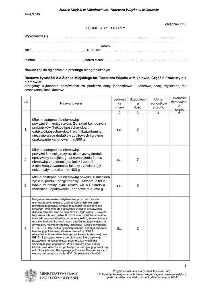Żłobek Miejski w Mikołowie im. Tadeusza Więcka w Mikołowie PN-2/2015 Załącznik nr 6 FORMULARZ OFERTY Wykonawca (*) ............................................................................................................................................ ..................................................................................................................................................................... Adres NIP:......................................................... REGON: ...................................................................................... telefon ................................................., Adres e-mail ……………………………………………………………. Nawiązując do ogłoszenia o przetargu nieograniczonym Dostawa żywności dla Żłobka Miejskiego im. Tadeusza Więcka w Mikołowie- Część 6 Produkty dla niemowląt oferujemy wykonanie zamówienia za poniższe ceny jednostkowe i końcową cenę, wyliczoną dla szacowanej ilości dostaw: Nazwa towaru Jednost ka miary Szacowan a ilość Cena jednostkow a brutto 1 2 3 4 1. Mleko następne dla niemowląt powyżej 6 miesiąca życia; 2 ; skład kompozycja prebiotyków (fruktooligosacharydów , galaktooligosacharydów i błonnika),witaminy , niezawierające dodatków zbożowych i glutenu opakowanie kartonowe, min.800 g szt. 6 2. Mleko następne dla niemowląt powyżej 6 miesiąca życia; dietetyczny środek spożywczy specjalnego przeznaczenia 2 ; dla niemowląt z tendencją do kolek i zaparć ; z obniżoną zawartością laktozy , zawierający nukleotydy ; puszka min. 400 g szt. 7 szt. 5 Szt. 2 L.p . 3. 4. Mleko następne dla niemowląt powyżej 6 miesiąca życia 2, produkt bezglutenowy ; zawiera: bifidus, białko ,witaminy, cynk, żelazo, wit. A i składniki mineralne ; opakowanie kartonowe min. 350 g Bezglutenowe mleko modyfikowane przeznaczone dla niemowląt po 6. miesiącu życia u których istnieje duże prawdopodobieństwo wystąpienia alergii na białko mleka krowiego. Polecane do stosowania w czasie odstawiania dziecka od piersi oraz po zakończeniu tego okresu.. Zawiera trzynaście witamin, białko, tłuszcze oraz składniki mineralne takie jak: wapń (niezbędny do budowy kości), żelazo (biorące udział w budowie komórek krwi), a także jod (wpływający na prawidłowy rozwój psychiczny i fizyczny) . Dzięki zawartości OPTI PRO - HA (białka hypoalergicznego) pomaga budować tolerancję pokarmową. Zawiera również LC PUFA (długołańcuchowe wielonienasycone kwasy tłuszczowe) oraz BIFIDUS (aktywne kultury pro biotyczne) które wpływają pozytywnie na dalszy rozwój psychofizyczny dziecka wspierając jego odporność. Mleko zawiera żywe kultury bakterii i ma właściwości probiotyczne - utrzymuje prawidłową mikroflorę jelitową. Nie wymaga gotowania. Przygotowywać z wody o temperaturze około 37 C. Opakowanie min.400g Wartość zamówieni a brutto 5 1 Projekt współfinansowany przez Ministra Pracy i Polityki Społecznej w ramach Resortowego programu rozwoju instytucji opieki nad dziećmi w wieku do lat 3 „Maluch - edycja 2015” Żłobek Miejski w Mikołowie im. Tadeusza Więcka w Mikołowie PN-2/2015 5. Kaszka mleczno – ryżowa po 4 miesiącu – skład min. 39% mąki ryżowej , min.32% odtłuszczonego mleka , witaminy min. 8 , składniki mineralne, smaki bananowa, jabłkowa ; opakowanie min. 230 g szt. 30 6. Kaszka mleczno – ryżowa po 6 miesiącu – skład min. 39% mąki ryżowej , min.32% odtłuszczonego mleka , witaminy min. 9 , składniki mineralne , szt. różne smaki np. bananowa , jabłkowa ; opakowanie min. 230 g 30 7. Kaszka ryżowa po 4 miesiącu – skład min. 75% mąki ryżowej , min.32% odtłuszczonego mleka , witaminy min. 8 , składniki mineralne , różne smaki np. malinowy , truskawkowy ; opakowanie min. 180 g szt. 10 8. Kaszka ryżowa po 6 miesiącu – skład min. 75% mąki ryżowej , min.32% odtłuszczonego mleka , witaminy min. 9 , składniki mineralne , różne smaki np. malinowy , truskawkowy ; opakowanie min. 180 g szt. 25 9. Bezglutenowy produkt zbożowy ( kaszka) nie zawierający mleka krowiego, białka sojowego , laktozy , glutenu ; skład : ryż , mąka chleba świętojańskiego , witaminy , składniki mineralne ; opakowanie min.500g szt. 5 szt. 2 10. koncentrat hydrolizowanego białka serwatkowego z mleka, laktoza z mleka, oleje roślinne (palmowy, rzepakowy, kokosowy, słonecznikowy, z organizmów jednokomórkowych), skrobia, galaktooligosacharydy z mleka (8,12%), fruktooligosacharydy (0,57%), mono- i diglicerydy kwasów tłuszczowych estryfikowane kwasem cytrynowym (emulgator), dwuwodorofosforan potasowy, chlorek wapnia, fosforan wapnia, olej rybi, chlorek choliny, kwas Laskorbinowy, tauryna, lecytyna sojowa, L-askorbinian sodu, siarczan żelazawy, octan DL-alfatokoferolu, siarczan cynku, inozytol, sól sodowa 5'monofosforanu urydyny, 5'-monofosforan cytydyny, 5'monofosforan adenozyny, sól sodowa 5'-monofosforanu inozyny, L-karnityna, nikotynamid, sól sodowa 5'monofosforanu uanozyny, D-pantotenian wapnia, Dbiotyna, siarczan miedzi, palmitynian retinylu kwas foliowy, DL-alfa-tokoferol, ryboflawina, chlorowodorek tiaminy, cholekalcyferol, chlorowodorek pirydoksyny, jodek potasu, siarczan manganu, fitomenadion, selenin sodu opakowanie min.400 g Razem: oraz deklarujemy następujący termin wymiany reklamowanego artykułu …..…………. godzin. 2 Projekt współfinansowany przez Ministra Pracy i Polityki Społecznej w ramach Resortowego programu rozwoju instytucji opieki nad dziećmi w wieku do lat 3 „Maluch - edycja 2015” Żłobek Miejski w Mikołowie im. Tadeusza Więcka w Mikołowie PN-2/2015 1. Oświadczamy, że zapoznaliśmy się ze specyfikacją istotnych warunków zamówienia i nie wnosimy do niej zastrzeżeń oraz, że zdobyliśmy konieczne informacje do przygotowania oferty, a także podpiszemy umowę zgodnie z wzorem stanowiącym załącznik do niniejszej specyfikacji. 2. Oświadczamy, 