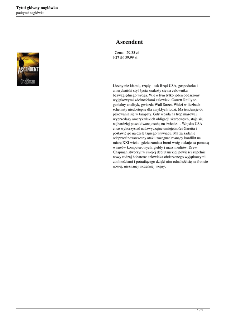 Tytuł główny nagłówka podtytuł nagłówka Ascendent Cena: 29.35 zł (-27%) 39.99 zł Liczby nie kłamią, rządy – tak Rząd USA, gospodarka i amerykański styl życia znalazły się na celowniku bezwzględnego wroga. Wie o tym tylko jeden obdarzony wyjątkowymi zdolnościami człowiek. Garrett Reilly to genialny analityk, gwiazda Wall Street. Widzi w liczbach schematy niedostępne dla zwykłych ludzi. Ma tendencję do pakowania się w tarapaty. Gdy wpada na trop masowej wyprzedaży amerykańskich obligacji skarbowych, staje się najbardziej poszukiwaną osobą na świecie… Wojsko USA chce wykorzystać nadzwyczajne umiejętności Garetta i postawić go na czele tajnego wywiadu. Ma za zadanie odeprzeć nowoczesny atak i zażegnać rosnący konflikt na miarę XXI wieku, gdzie zamiast broni wróg atakuje za pomocą wirusów komputerowych, giełdy i mass mediów. Drew Chapman stworzył w swojej debiutanckiej powieści zupełnie nowy rodzaj bohatera: człowieka obdarzonego wyjątkowymi zdolnościami i potrafiącego dzięki nim odnaleźć się na froncie nowej, nieznanej wcześniej wojny. 1/1 Powered by TCPDF (www.tcpdf.org)