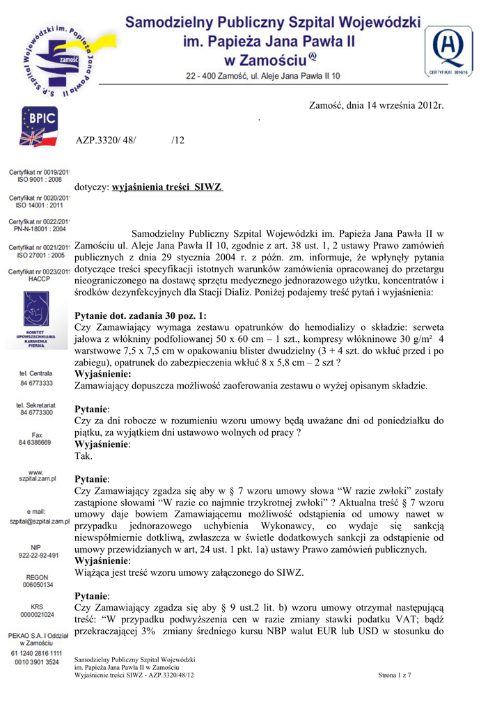Zamość, dnia 14 września 2012r. . AZP.3320/ 48/ /12 dotyczy: wyjaśnienia treści SIWZ Samodzielny Publiczny Szpital Wojewódzki im. Papieża Jana Pawła II w Zamościu ul. Aleje Jana Pawła II 10, zgodnie z art. 38 ust. 1, 2 ustawy Prawo zamówień publicznych z dnia 29 stycznia 2004 r. z późn. zm. informuje, że wpłynęły pytania dotyczące treści specyfikacji istotnych warunków zamówienia opracowanej do przetargu nieograniczonego na dostawę sprzętu medycznego jednorazowego użytku, koncentratów i środków dezynfekcyjnych dla Stacji Dializ. Poniżej podajemy treść pytań i wyjaśnienia: Pytanie dot. zadania 30 poz. 1: Czy Zamawiający wymaga zestawu opatrunków do hemodializy o składzie: serweta jałowa z włókniny podfoliowanej 50 x 60 cm – 1 szt., kompresy włókninowe 30 g/m² 4 warstwowe 7,5 x 7,5 cm w opakowaniu blister dwudzielny (3 + 4 szt. do wkłuć przed i po zabiegu), opatrunek do zabezpieczenia wkłuć 8 x 5,8 cm – 2 szt ? Wyjaśnienie: Zamawiający dopuszcza możliwość zaoferowania zestawu o wyżej opisanym składzie. Pytanie: Czy za dni robocze w rozumieniu wzoru umowy będą uważane dni od poniedziałku do piątku, za wyjątkiem dni ustawowo wolnych od pracy ? Wyjaśnienie: Tak. Pytanie: Czy Zamawiający zgadza się aby w § 7 wzoru umowy słowa “W razie zwłoki” zostały zastąpione słowami “W razie co najmnie trzykrotnej zwłoki” ? Aktualna treść § 7 wzoru umowy daje bowiem Zamawiającemu możliwość odstąpienia od umowy nawet w przypadku jednorazowego uchybienia Wykonawcy, co wydaje się sankcją niewspółmiernie dotkliwą, zwłaszcza w świetle dodatkowych sankcji za odstąpienie od umowy przewidzianych w art, 24 ust. 1 pkt. 1a) ustawy Prawo zamówień publicznych. Wyjaśnienie: Wiążąca jest treść wzoru umowy załączonego do SIWZ. Pytanie: Czy Zamawiający zgadza się aby § 9 ust.2 lit. b) wzoru umowy otrzymał następującą treść: “W przypadku podwyższenia cen w razie zmiany stawki podatku VAT; bądź przekraczającej 3% zmiany średniego kursu NBP walut EUR lub USD w stosunku do Samodzielny Publiczny Szpital Wojewódzki im. Papieża Jana Pawła II w Zamościu Wyjaśnienie treści SIWZ - AZP.3320/48/12 Strona 1 z 7 kursu z dnia zawarcia umowy; bądź gdy suma miesięcznych wskaźników cen i usług konsumpcyjnych opublikowanych przez Prezesa GUS za okres od dnia zawarcia umowy przekroczy 3%”? Proponowana zmiana wzoru umowy nie zagraża interesom Zamawiającego. Jeżeli Zamawiający nie będzie akceptował zmiany cen, będzie mógł odmówić podpisania aneksu o zmianie umowy. Wyjaśnienie: Wiążąca jest treść wzoru umowy załączonego do SIWZ. Pytanie: Zważywszy na treść § 10 wzoru umowy, jaką minimalną ilość (jaki procent ilości wskazanych w SIWZ) Zamawiający na pewno zamówi ? Odpowiedź na powyższe pytanie ma istotne znaczenie dla odpowiedniej kalkulacji oferowanej ceny. Wyjaśnienie: Treść § 10 ulega zmianie i uzyskuje brzmienie: “ W przypadku wystąpienia braku środków finansowych Kupujący zastrzega sobie prawo ograniczenia ilości dostaw, o czym powiadomi Sprzedającego na piśmie. W takim przypadku Sprzedający może jedynie żądać wynagrodzenia za faktycznie zrealizowaną część dostawy. Strony przyjmują, że ewentualne zmniejszenie zamówienia nie przekroczy 20% wartości umowy.” Pytanie dot. zadania 30: Czy Zamawiający dopuści zestaw o składzie: a) - serweta włókninowa 38 cm x 45 cm – 1 szt. - kompresy włókninowe 7,5 cm x 7,5 cm 30 g/m, 4-warstwowe – 4 szt. - plaster do wenflonów 6 cm x 8 cm – 2 szt. - przylepiec włokninowy hypoalergiczny 15 cm x 2,5 cm – 2 szt. - rękawiczki lateksowe niepudrowane rozmiar M – 2 szt. (1 para) lub b) - serweta włókninowa 50 x 60 cm – 1 szt. - rękawice lateksowe bezpudrowe S lub M lub L– 2 szt. - kompresy z gazy 7,5 x 7,5 8w, 17 n – 4 szt. - plaster do wenflonów 6 cm x 8 cm – 1 szt. W przypadku negatywnej odpowiedzi prosimy o szczegółowe określenie parametrów zamawianych zestawów. Wyjaśnienie: Zamawiający dopuszcza możliwość zaoferowania zestawu opisanego pod literą a) lub zestawu opisanego pod literą b). Pytanie dot. zadania 21: Czy Zamawiający wyrazi zgodę na zaoferowanie wysokiej jakości zestawu do hemodializy dwukanałowego w następujących rozmiarach: 12F x 15 cm, 12F x 20 cm zawierającego igłę z portem bocznym umożliwiającym wprowadzenie prowadnicy bez konieczności zdejmowania strzykawki zamiast strzykawki z systemem wprowadzającym ? Pozostałe elementy zestawu pozostają bez zmian. Wyjaśnienie: Tak. Pytanie dot. zadania 22: Samodzielny Publiczny Szpital Wojewódzki im. Papieża Jana Pawła II w Zamościu Wyjaśnienie treści SIWZ - AZP.3320/48/12 Strona 2 z 7 Czy Zamawiający wyrazi zgodę na zaoferowanie wysokiej jakości cewników permanentnych dwukanałowych w zestawach do implantacji wstecznej, z rozdzieloną końcówką, wykonanych z carbothanu w następujących rozmiarach do wyboru przez Zamawiającego: 12F – dł.: 16 i 19 cm; 14F – dł.: 19, 23, 27, 31, 35 cm; 16F – dł.: 19, 23, 27, 31 i 35 cm ? Wyjaśnienie: Tak. Pytanie dot. zadania 1: Czy Zamawiający w zakresie zadania nr 1 dopuści złożenie oferty z dializatorami polisulfonowymi, sterylizowanymi przy użyciu wiązki elektronów, spełniającymi wszystkie pozostałe wymagania z SIWZ ? Wyjaśnienie: Tak. Pytanie dot. zadania 2: Czy Zamawiający w zakresie zadania nr 2 dopuści złożenie oferty z dializatorami polisulfonowymi, sterylizowanymi przy użyciu wiązki elektronów, spełniającymi wszystkie pozostałe wymagania z SIWZ ? Wyjaśnienie: Tak. Pytanie dot. zadania 3: Czy Zamawiający w zakresie zadania nr 3 dopuści złożenie oferty z dializatorami polisulfonowymi, sterylizowanymi przy użyciu wiązki elektronów, spełniającymi wszystkie pozostałe wymagania z SIWZ ? Wyjaśnienie: Tak. Pytanie dot. zadania 4: Czy zamawiający w zakresie zadania nr 4 dopuści złożenie oferty z dializatorami polisulfono