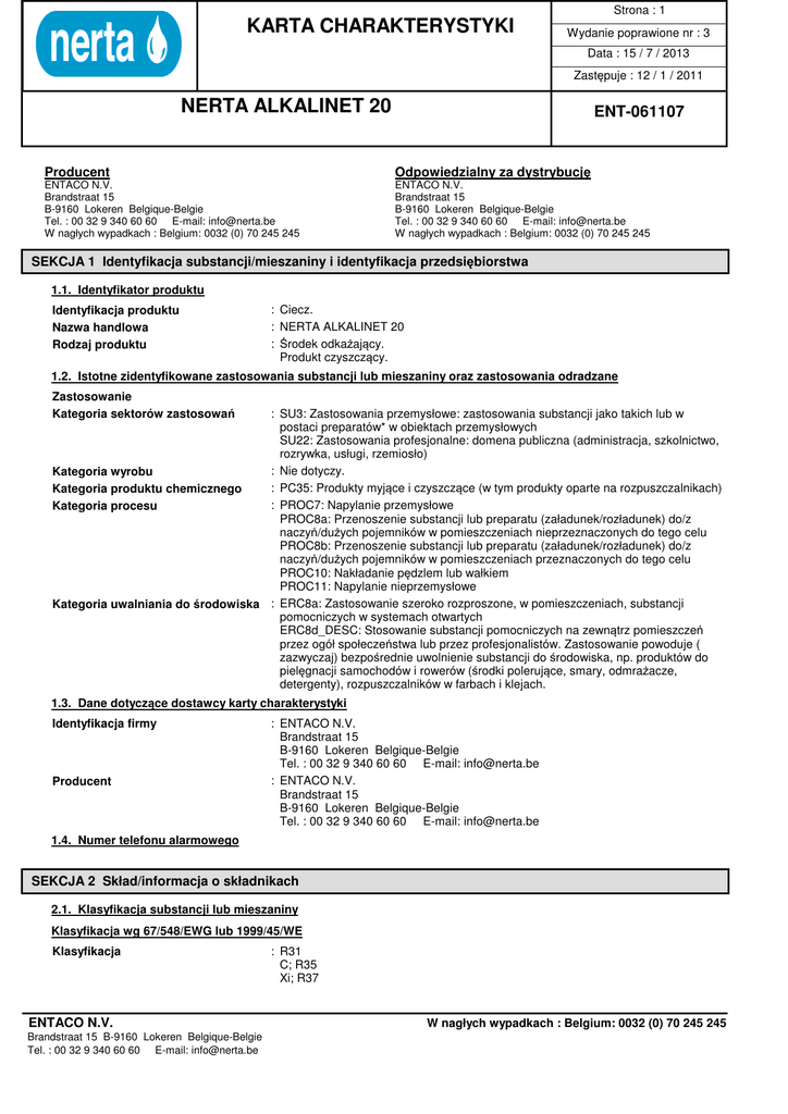 Strona : 1 KARTA CHARAKTERYSTYKI Wydanie poprawione nr : 3 Data : 15 / 7 / 2013 Zastępuje : 12 / 1 / 2011 NERTA ALKALINET 20 Producent ENTACO N.V. Brandstraat 15 B-9160 Lokeren Belgique-Belgie Tel. : 00 32 9 340 60 60 E-mail: [email protected] W nagłych wypadkach : Belgium: 0032 (0) 70 245 245 ENT-061107 Odpowiedzialny za dystrybucję ENTACO N.V. Brandstraat 15 B-9160 Lokeren Belgique-Belgie Tel. : 00 32 9 340 60 60 E-mail: [email protected] W nagłych wypadkach : Belgium: 0032 (0) 70 245 245 SEKCJA 1 Identyfikacja substancji/mieszaniny i identyfikacja przedsiębiorstwa 1.1. Identyfikator produktu Identyfikacja produktu Nazwa handlowa Rodzaj produktu : Ciecz. : NERTA ALKALINET 20 : Środek odkażający. Produkt czyszczący. 1.2. Istotne zidentyfikowane zastosowania substancji lub mieszaniny oraz zastosowania odradzane Zastosowanie Kategoria sektorów zastosowań : SU3: Zastosowania przemysłowe: zastosowania substancji jako takich lub w postaci preparatów* w obiektach przemysłowych SU22: Zastosowania profesjonalne: domena publiczna (administracja, szkolnictwo, rozrywka, usługi, rzemiosło) : Nie dotyczy. Kategoria wyrobu : PC35: Produkty myjące i czyszczące (w tym produkty oparte na rozpuszczalnikach) Kategoria produktu chemicznego : PROC7: Napylanie przemysłowe Kategoria procesu PROC8a: Przenoszenie substancji lub preparatu (załadunek/rozładunek) do/z naczyń/dużych pojemników w pomieszczeniach nieprzeznaczonych do tego celu PROC8b: Przenoszenie substancji lub preparatu (załadunek/rozładunek) do/z naczyń/dużych pojemników w pomieszczeniach przeznaczonych do tego celu PROC10: Nakładanie pędzlem lub wałkiem PROC11: Napylanie nieprzemysłowe Kategoria uwalniania do środowiska : ERC8a: Zastosowanie szeroko rozproszone, w pomieszczeniach, substancji pomocniczych w systemach otwartych ERC8d_DESC: Stosowanie substancji pomocniczych na zewnątrz pomieszczeń przez ogół społeczeństwa lub przez profesjonalistów. Zastosowanie powoduje ( zazwyczaj) bezpośrednie uwolnienie substancji do środowiska, np. produktów do pielęgnacji samochodów i rowerów (środki polerujące, smary, odmrażacze, detergenty), rozpuszczalników w farbach i klejach. 1.3. Dane dotyczące dostawcy karty charakterystyki Identyfikacja firmy Producent : ENTACO N.V. Brandstraat 15 B-9160 Lokeren Belgique-Belgie Tel. : 00 32 9 340 60 60 E-mail: [email protected] : ENTACO N.V. Brandstraat 15 B-9160 Lokeren Belgique-Belgie Tel. : 00 32 9 340 60 60 E-mail: [email protected] 1.4. Numer telefonu alarmowego SEKCJA 2 Skład/informacja o składnikach 2.1. Klasyfikacja substancji lub mieszaniny Klasyfikacja wg 67/548/EWG lub 1999/45/WE Klasyfikacja ENTACO N.V. Brandstraat 15 B-9160 Lokeren Belgique-Belgie Tel. : 00 32 9 340 60 60 E-mail: [email protected] : R31 C; R35 Xi; R37 W nagłych wypadkach : Belgium: 0032 (0) 70 245 245 Strona : 2 KARTA CHARAKTERYSTYKI Wydanie poprawione nr : 3 Data : 15 / 7 / 2013 Zastępuje : 12 / 1 / 2011 NERTA ALKALINET 20 ENT-061107 SEKCJA 2 Skład/informacja o składnikach (ciąg dalszy) Klasa zagrożenia i kody kategorii, Rozporządzenie (WE) NR 1272/2008 (CLP) Zagrożenia dla zdrowia : Działanie żrące na skórę - Kategoria 1A - Niebezpieczeństwo (CLP : Skin Corr. 1A) Poważne uszkodzenie oczu - Kategoria 1 - Niebezpieczeństwo (CLP : Eye Dam. 1) Działanie toksyczne na narządy docelowe - narażenie jednorazowe - Respiratory tract irritation - Kategoria 3 - Uwaga (CLP : STOT SE 3) 2.2. Elementy oznakowania Oznakowanie wg 67/548/EWG lub 1999/45/WE C ê Symbol(e) Zwrot(y) R Zwrot(y) S Zawiera : C : Produkt żrący : R31 : W kontakcie z kwasami uwalnia toksyczne gazy. R35 : Powoduje poważne oparzenia. R37 : Działa drażniąco na drogi oddechowe. : S26 : Zanieczyszczone oczy przemyć natychmiast dużą ilością wody i zasięgnąć porady lekarza. S36/37/39 : Nosić odpowiednią odzież ochronną, odpowiednie rękawice ochronne i okulary lub ochronę twarzy. S45 : W przypadku awarii lub jeżeli źle się poczujesz, niezwłocznie zasięgnij porady lekarza - jeżeli to możliwe, pokaż etykietę. : Wodorotlenek potasowy Podchloryn sodu, roztwór zawierajacy Oznakowanie wg Rozporządzenia (WE) nr 1272/2008 (CLP) » M Piktogramy określające rodzaj zagrożenia : SGH05 Piktogramy określające rodzaj zagrożenia : Niebezpieczeństwo Hasła ostrzegawcze Zwroty wskazujące rodzaj zagrożenia : H314 - Powoduje poważne oparzenia skóry i uszkodzenie oczu. H335 - Może powodować podrażnienie dróg oddechowych. : EUH031 - W kontakcie z kwasami uwalnia toksyczne gazy. Informacje uzupełniające o zagrożeniach : Wodorotlenek potasowy • Zawiera Podchloryn sodu, roztwór zawierajacy Zwroty wskazujące środki ostrożności - Zapobieganie - reagowanie ENTACO N.V. Brandstraat 15 B-9160 Lokeren Belgique-Belgie Tel. : 00 32 9 340 60 60 E-mail: [email protected] : P260 - Nie wdychać pyłu, dymu, gazu, mgły, par, rozpylonej cieczy. P264 - Dokładnie umyć po manipulowaniu. P280 - Używać rękawic ochronnych, odzieży ochronnej, ochrony oczu, ochrony twarzy. : P301+330+331 - W PRZYPADKU POŁKNIĘCIA: wypłukać usta. NIE wywoływać wymiotów. P303+361+353 - W PRZYPADKU DOSTANIA SIę NA SKÓRę (lub na włosy) : Natychmiast usunąć/zdjąć całą zanieczyszczoną odzież. Spłukać skórę pod strumieniem wody/prysznicem. P305+P351+P338 - W PRZYPADKU DOSTANIA SIę DO OCZU : Ostrożnie płukać wodą przez kilka minut. Wyjąć soczewki kontaktowe, jeżeli są i można je łatwo usunąć. Nadal płukać. W nagłych wypadkach : Belgium: 0032 (0) 70 245 245 Strona : 3 KARTA CHARAKTERYSTYKI Wydanie poprawione nr : 3 Data : 15 / 7 / 2013 Zastępuje : 12 / 1 / 2011 NERTA ALKALINET 20 ENT-061107 SEKCJA 2 Skład/informacja o składnikach (ciąg dalszy) 2.3. Inne zagrożenia : W normalnych warunkach nieobecne. Inne zagrożenia SEKCJA 3 Identyfikacja zagrożeń : Mieszanina. Substancja / Preparat 3.1./3.2. Substancja / Preparat NERTA ALKALINET 20 :Produkt niebezpieczny (Dyrektywa 1999/45/EC).Subst