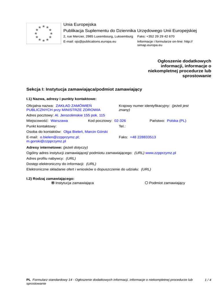 Unia Europejska Publikacja Suplementu do Dziennika Urzędowego Unii Europejskiej 2, rue Mercier, 2985 Luxembourg, Luksemburg Faks: +352 29 29 42 670 E-mail: [email protected] Informacje i formularze on-line: http:// simap.europa.eu Ogłoszenie dodatkowych informacji, informacje o niekompletnej procedurze lub sprostowanie Sekcja I: Instytucja zamawiająca/podmiot zamawiający I.1) Nazwa, adresy i punkty kontaktowe: Oficjalna nazwa: ZAKŁAD ZAMÓWIEŃ PUBLICZNYCH przy MINISTRZE ZDROWIA Krajowy numer identyfikacyjny: (jeżeli jest znany) _____ Adres pocztowy: Al. Jerozolimskie 155 pok. 115 Miejscowość: Warszawa Kod pocztowy: 02-326 Punkt kontaktowy: _____ Państwo: Polska (PL) Tel.: _____ Osoba do kontaktów: Olga Bieleń, Marcin Górski E-mail: [email protected]; [email protected] Faks: +48 228833513 Adresy internetowe: (jeżeli dotyczy) Ogólny adres instytucji zamawiającej/ podmiotu zamawiającego: (URL) www.zzpprzymz.pl Adres profilu nabywcy: (URL) _____ Dostęp elektroniczny do informacji: (URL) _____ Elektroniczne składanie ofert i wniosków o dopuszczenie do udziału: (URL) _____ I.2) Rodzaj zamawiającego: Instytucja zamawiająca Podmiot zamawiający PL Formularz standardowy 14 - Ogłoszenie dodatkowych informacji, informacje o niekompletnej procedurze lub sprostowanie 1/4 Sekcja II: Przedmiot zamówienia II.1.1) Nazwa nadana zamówieniu: PRZEPROWADZENIE KONTROLI DOTYCZĄCYCH PRAWIDŁOWOŚCI UDZIELANIA ZAMÓWIEŃ PUBLICZNYCH W ŚWIETLE PRZEPISÓW PRAWA KRAJOWEGO I UNII EUROPEJSKIEJ ORAZ UMÓW/ DECYZJI / POROZUMIEŃ W SPRAWIE REALIZACJI PROJEKTÓW, CZĘŚĆ 1 -2, postępowanie znak: ZZP-171/16 II.1.2) Krótki opis zamówienia lub zakupu: (podano w pierwotnym ogłoszeniu) PRZEPROWADZENIE KONTROLI DOTYCZĄCYCH PRAWIDŁOWOŚCI UDZIELANIA ZAMÓWIEŃ PUBLICZNYCH W ŚWIETLE PRZEPISÓW PRAWA KRAJOWEGO I UNII EUROPEJSKIEJ ORAZ UMÓW/ DECYZJI / POROZUMIEŃ W SPRAWIE REALIZACJI PROJEKTÓW, CZĘŚĆ 1 - 2 Przedmiotem zamówienia jest: Przeprowadzenie kontroli dotyczących prawidłowości udzielania zamówień publicznych w świetle przepisów prawa krajowego i Unii Europejskiej oraz umów/ decyzji / porozumień w sprawie realizacji projektów. Zamówienie będzie realizowane w oparciu o zlecenia. Przedmiotem jednego zlecenia jest: 1. Kontrola dokumentacji przekazanej przez Zamawiającego i sporządzenie pisemnej opinii ze wskazaniem proponowanej wysokości korekty finansowej w przypadku stwierdzenia nieprawidłowości oraz 2. Ustosunkowanie się pisemnie do uwag Zamawiającego dotyczących wyników opiniowanego zamówienia publicznego oraz 3. Ustosunkowanie się pisemnie do ewentualnych zastrzeżeń Beneficjenta lub Instytucji Realizującej dotyczących wyników skontrolowanego zamówienia publicznego oraz 4. przygotowanie wkładu merytorycznego do raportu o nieprawidłowościach/ rekomendacji/ informacji pokontrolnej, ze wskazaniem wysokości korekty finansowej w przypadku stwierdzenia nieprawidłowości, o której mowa powyżej. Szacuje się, że w okresie obowiązywania umowy Wykonawca w danej części otrzyma nie mniej niż 200 i nie więcej niż 300 zleceń/postępowań do kontroli. Usługa będzie realizowana w 2016r. i 2017r. Szczegółowy opis przedmiotu zamówienia stanowi załącznik nr 1 do SIWZ. II.1.3) Wspólny Słownik Zamówień (CPV) Główny przedmiot Dodatkowe przedmioty Słownik główny 79100000 79111000 79212000 Słownik uzupełniający (jeżeli dotyczy) PL Formularz standardowy 14 - Ogłoszenie dodatkowych informacji, informacje o niekompletnej procedurze lub sprostowanie 2/4 Sekcja IV: Procedura IV.1)Rodzaj procedury (podano w pierwotnym ogłoszeniu) Otwarta Ograniczona Ograniczona przyspieszona Negocjacyjna Negocjacyjna przyspieszona Dialog konkurencyjny Negocjacyjna z uprzednim ogłoszeniem Negocjacyjna bez uprzedniego ogłoszenia Negocjacyjna z publikacją ogłoszenia o zamówieniu Negocjacyjna bez publikacji ogłoszenia o zamówieniu Udzielenie zamówienia bez uprzedniej publikacji ogłoszenia o zamówieniu w Dzienniku Urzędowym Unii Europejskiej IV.2)Informacje administracyjne IV.2.1)Numer referencyjny: (podano w pierwotnym ogłoszeniu) ZZP-171/16 IV.2.2)Dane referencyjne ogłoszenia w przypadku ogłoszeń przesłanych drogą elektroniczną: Pierwotne ogłoszenie przesłane przez eNotices TED eSender Login: ENOTICES_ZZPprzyMZ Dane referencyjne ogłoszenia: 2016-081328 rok i numer dokumentu IV.2.3)Ogłoszenie, którego dotyczy niniejsza publikacja: Numer ogłoszenia w Dz.U.: 2016/S 124-222546 z dnia: 30/06/2016 (dd/mm/rrrr) IV.2.4)Data wysłania pierwotnego ogłoszenia: 27/06/2016 (dd/mm/rrrr) PL Formularz standardowy 14 - Ogłoszenie dodatkowych informacji, informacje o niekompletnej procedurze lub sprostowanie 3/4 Sekcja VI: Informacje uzupełniające VI.1) Ogłoszenie dotyczy: Procedury niepełnej Sprostowania Informacji dodatkowych VI.2) Informacje na temat niepełnej procedury udzielenia zamówienia: Postępowanie o udzielenie zamówienia zostało przerwane Postępowanie o udzielenie zamówienia uznano za nieskuteczne Zamówienia nie udzielono Zamówienie może być przedmiotem ponownej publikacji VI.3) Informacje do poprawienia lub dodania : VI.3.1) Zmiana oryginalnej informacji podanej przez instytucję zamawiającą Publikacja w witrynie TED niezgodna z oryginalną informacją, przekazaną przez instytucję zamawiającą Oba przypadki VI.3.2) W ogłoszeniu pierwotnym W odpowiedniej dokumentacji przetargowej (więcej informacji w odpowiedniej dokumentacji przetargowej) W obu przypadkach (więcej informacji w odpowiedniej dokumentacji przetargowej) VI.3.3) Tekst, który należy poprawić w pierwotnym ogłoszeniu Miejsce, w którym znajduje się Zamiast: zmieniany tekst: VI.3.4) Daty, które należy poprawić w pierwotnym ogłoszeniu Miejsce, w którym znajdują się Zamiast: zmieniane daty: 12/07/2016 Godzina: 10:00 IV.3.4) Termin składania ofert lub (dd/mm/rrrr) wniosków o dopuszczenie do udziału w postępowaniu Miejsce, w którym znajdują się zmienia