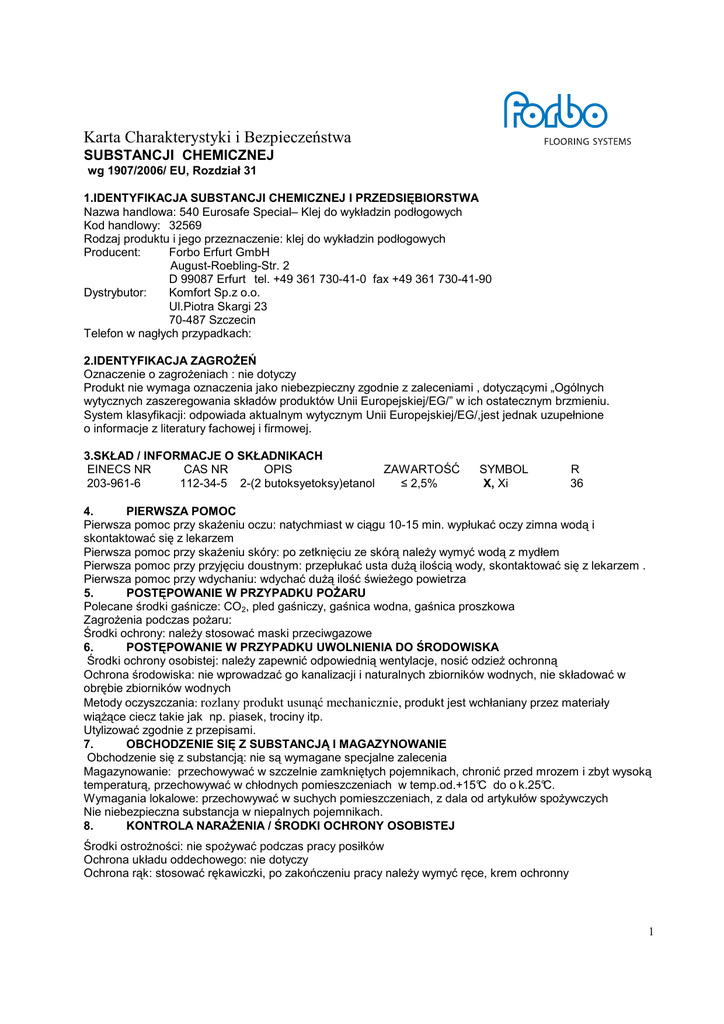 Karta Charakterystyki i Bezpieczeństwa SUBSTANCJI CHEMICZNEJ wg 1907/2006/ EU, Rozdział 31 1.IDENTYFIKACJA SUBSTANCJI CHEMICZNEJ I PRZEDSIĘBIORSTWA Nazwa handlowa: 540 Eurosafe Special– Klej do wykładzin podłogowych Kod handlowy: 32569 Rodzaj produktu i jego przeznaczenie: klej do wykładzin podłogowych Producent: Forbo Erfurt GmbH August-Roebling-Str. 2 D 99087 Erfurt tel. +49 361 730-41-0 fax +49 361 730-41-90 Dystrybutor: Komfort Sp.z o.o. Ul.Piotra Skargi 23 70-487 Szczecin Telefon w nagłych przypadkach: 2.IDENTYFIKACJA ZAGROśEŃ Oznaczenie o zagroŜeniach : nie dotyczy Produkt nie wymaga oznaczenia jako niebezpieczny zgodnie z zaleceniami , dotyczącymi „Ogólnych wytycznych zaszeregowania składów produktów Unii Europejskiej/EG/” w ich ostatecznym brzmieniu. System klasyfikacji: odpowiada aktualnym wytycznym Unii Europejskiej/EG/,jest jednak uzupełnione o informacje z literatury fachowej i firmowej. 3.SKŁAD / INFORMACJE O SKŁADNIKACH EINECS NR CAS NR OPIS ZAWARTOŚĆ 203-961-6 112-34-5 2-(2 butoksyetoksy)etanol ≤ 2,5% SYMBOL X, Xi R 36 4. PIERWSZA POMOC Pierwsza pomoc przy skaŜeniu oczu: natychmiast w ciągu 10-15 min. wypłukać oczy zimna wodą i skontaktować się z lekarzem Pierwsza pomoc przy skaŜeniu skóry: po zetknięciu ze skórą naleŜy wymyć wodą z mydłem Pierwsza pomoc przy przyjęciu doustnym: przepłukać usta duŜą ilością wody, skontaktować się z lekarzem . Pierwsza pomoc przy wdychaniu: wdychać duŜą ilość świeŜego powietrza 5. POSTĘPOWANIE W PRZYPADKU POśARU Polecane środki gaśnicze: CO2, pled gaśniczy, gaśnica wodna, gaśnica proszkowa ZagroŜenia podczas poŜaru: Środki ochrony: naleŜy stosować maski przeciwgazowe 6. POSTĘPOWANIE W PRZYPADKU UWOLNIENIA DO ŚRODOWISKA Środki ochrony osobistej: naleŜy zapewnić odpowiednią wentylacje, nosić odzieŜ ochronną Ochrona środowiska: nie wprowadzać go kanalizacji i naturalnych zbiorników wodnych, nie składować w obrębie zbiorników wodnych Metody oczyszczania: rozlany produkt usunąć mechanicznie, produkt jest wchłaniany przez materiały wiąŜące ciecz takie jak np. piasek, trociny itp. Utylizować zgodnie z przepisami. 7. OBCHODZENIE SIĘ Z SUBSTANCJĄ I MAGAZYNOWANIE Obchodzenie się z substancją: nie są wymagane specjalne zalecenia Magazynowanie: przechowywać w szczelnie zamkniętych pojemnikach, chronić przed mrozem i zbyt wysoką temperaturą, przechowywać w chłodnych pomieszczeniach w temp.od.+15°C do o k.25°C. Wymagania lokalowe: przechowywać w suchych pomieszczeniach, z dala od artykułów spoŜywczych Nie niebezpieczna substancja w niepalnych pojemnikach. 8. KONTROLA NARAśENIA / ŚRODKI OCHRONY OSOBISTEJ Środki ostroŜności: nie spoŜywać podczas pracy posiłków Ochrona układu oddechowego: nie dotyczy Ochrona rąk: stosować rękawiczki, po zakończeniu pracy naleŜy wymyć ręce, krem ochronny 1 Ochrona oczu: stosować okulary ochronne Ochrona skóry: stosować odzieŜ ochronną Zalecane dopuszczalne stęŜenia (ACGIH): Nazwa składnika CAS: 112-34-5 Typ granicy 2 butoksyetanol Wartość [Jednostka] 100 mg/m³ AGW Zalecane dopuszczalne stęŜenia: 3 Nazwa składnika 9. NDS [mg/m ] 3 NDSCh [mg/m ] 3 NDSP [mg/m ] WŁASNOŚCI FIZYKOCHEMICZNE (DLA NIEBEZPIECZNEGO SKŁADNIKA MIESZANINY) wygląd: kolor: zapach: temperatura topnienia: temperatura wrzenia: temperatura zapłonienia: temperatura zapłonu: pastowaty beŜowa charakterystyczny nie określona - samozapłon: produkt nie ulega samozapłonowi niebezpieczeństwo wybuchu: produkt nie jest wybuchowy granice wybuchowości: dolna: górna: o pręŜność pary w temp. 20 C: 3 gęstość nasypowa: 1,3 g/cm rozpuszczalność w wodzie : miesza się z wodą o pH w temp.20 C o lepkość w temp. 20 C zawartość rozpuszczalników: organiczne ≤ 2,5% VOC(EU) ≤ 2,5% 10. STABILNOŚĆ I REAKTYWNOŚĆ Warunki, których naleŜy unikać: przy odpowiednim składowaniu i oznakowaniu nie następuje rozkład produktu Materiały, których naleŜy unikać: nie ma specjalnych zaleceń 11. INFORMACJE TOKSYKOLOGICZNE Przy odpowiednim oznakowaniu i zachowaniu podstawowych zasad higieny nie jest to produkt mający uboczne skutki dla organizmu. 12. INFORMACJE EKOLOGICZNE nie wprowadzać do kanalizacji, zbiorników wodnych, wód gruntowych i nie przechowywać w pobliŜu zbiorników wodnych 13. POSTĘPOWANIE Z ODPADAMI Odpady utylizować, przestrzegać lokalnych przepisów utylizacyjnych, Kod utylizacyjny dostępny na zapytanie . 14. INFORMACJE O TRANSPORCIE nie ma specjalnych niebezpieczeństw podczas transportu, produkt nie jest niebezpieczny w świetle przepisów transportowych 2 15. INFORMACJE DOTYCZĄCE UREGULOWAŃ PRAWNYCH Klasyfikację i oznakowanie preparatu podano zgodnie z zaleceniami EWG. Produkt nie wymaga oznaczenia jako niebezpieczny zgodnie z wytycznymi Unii Europejskiej/EU/. NaleŜy przestrzegać ogólnych zasad bezpieczeństwa dotyczących obchodzenia się z chemikaliami. Klasa zagroŜenia dla środowiska wodnego(WGK): 1 – niski stopień zagroŜenia Techniczna informacja – powietrze: Klasa Udział w % ≤ 2,5% NK Uwagi specjalne: zawiera: 16. INNE INFORMACJE znaki ostrzegawcze: X nie dotyczy R symbole zagroŜenia: R 36 – podraŜnia oczy S symbole bezpieczeństwa: nie dotyczy PowyŜsze informacje zostały opracowane w oparciu o bieŜący stan wiedzy i doświadczeń. Nie stanowią jednak gwarancji własności produktu ani specyfikacji jakościowej i nie mogą być podstawą do reklamacji. Produkt powinien być transportowany, magazynowany i stosowany zgodnie z obowiązującymi przepisami oraz dobrą praktyką i higieną pracy. Dotyczy stanu produktu w momencie dostawy. Producent nie ponosi odpowiedzialności za straty wynikające bezpośrednio lub pośrednio ze stosowania powyŜszej interpretacji przepisów lub instrukcji. Przedstawione informacje nie mogą mieć zastosowania dla mieszanin produktu z innymi substancjami. Wykorzystanie podanych informacji, jak i stosowanie produktu, nie są kont