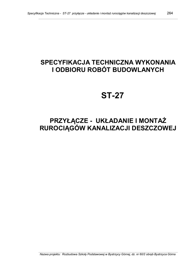 Specyfikacja Techniczna - ST-27 przyłącze - układanie i montaż rurociągów kanalizacji deszczowej 264 SPECYFIKACJA TECHNICZNA WYKONANIA I ODBIORU ROBÓT BUDOWLANYCH ST-27 PRZYŁĄCZE - UKŁADANIE I MONTAŻ RUROCIĄGÓW KANALIZACJI DESZCZOWEJ Nazwa projektu: Rozbudowa Szkoły Podstawowej w Bystrzycy Górnej, dz. nr 60/2 obręb Bystrzyca Górna Specyfikacja Techniczna - ST-27 przyłącze - układanie i montaż rurociągów kanalizacji deszczowej 1. 265 PRZEDMIOT ST. Przedmiotem niniejszej szczegółowej specyfikacji technicznej są wymagania dotyczące wykonania i odbioru robót polegających na układaniu i montażu rurociągów kanalizacji deszczowej dla rozbudowy Szkoły Podstawowej w Bystrzycy Górnej . Bystrzyca Górna nr 64, dz. nr 60/2 obr. Bystrzyca Górna 2. ZAKRES STOSOWANIA ST. Specyfikacja Techniczna jest stosowana jako dokument przetargowy i kontraktowy przy zlecaniu i realizacji robót wymienionych w punkcie j.w. 3. ZAKRES ROBÓT OBJĘTYCH ST. Roboty, których dotyczy specyfikacja obejmują wszystkie czynności związane z budową przyłączy kanalizacji deszczowej 4. OGÓLNE WYMAGANIA DOTYCZĄCE ROBÓT. Wykonawca robót jest odpowiedzialny za jakość ich wykonania oraz za ich zgodność z dokumentacja projektową, Specyfikacją Techniczną oraz zaleceniami Inżynierami. 5. MATERIAŁY I URZĄDZENIA. Materiały systemy kanalizacji zewnętrznej PVC Posiadane aprobaty techniczne: - rury i kształtki kanalizacyjne: COBRTI "Instal": AT/97-01-0131, AT/2000-02-0961-01 IBDiM: AT/98-03-0500, wyroby zgodne z PN-EN 1401-01:1999. Rury kanalizacyjne z PVC do f630 mm są dostarczane w oryginalnie zapakowanych paletach, aby zapewnić odpowiednie zabezpieczenie w czasie transportu i magazynowania. Rury są dostarczane z fabryki wraz z gumowymi pierścieniami uszczelniającymi (uszczelkami), które nie są wstępnie smarowane. Sprzęt Zastosowany sprzęt powinien być zgodny z projektem organizacji robót zaakceptowanym przez Inżyniera. . 6. TRANSPORT. Transport sprzętu i urządzeń pomocniczych przeprowadzić można dowolnymi środkami transportu. Gruz kamienny, betonowy i elementy rozebranych sieci przeprowadzić należy wskazaną drogą i we wskazane przez Inżyniera miejsce. Transport rurociągów zgodnie z zasadami : - Rury powinny być składowane tak długo jak to możliwe w oryginalnym opakowaniu. - Rury powinny być podparte na całej długości. Wysokość podkładów winna uwzględnić maksymalną średnicę kielicha. Załadunek i rozładunek rur powinien być prowadzony ze szczególną uwagą. Niedopuszczalne jest np. zrzucanie rur z samochodu. Nazwa projektu: Rozbudowa Szkoły Podstawowej w Bystrzycy Górnej, dz. nr 60/2 obręb Bystrzyca Górna Specyfikacja Techniczna - ST-27 przyłącze - układanie i montaż rurociągów kanalizacji deszczowej 266 - Wiązki rur lub rury luzem należy przechowywać na stabilnym podłożu. Przy układaniu wiązek w sterty, ramy wiązki wyższej powinny spoczywać na ramach wiązki niższej. Gdy rury są składowane luzem, należy zastosować boczne wsporniki i podkłady. Warstwy rur należy układać naprzemiennie. Kielichy rur winny być wysunięte tak, aby końce rur w wyższej warstwie nie spoczywały na kielichach warstwy niższej. - Rury o mniejszych średnicach można przenosić bez użycia sprzętu. - Niedopuszczalne jest ciągnięcie rury po ziemi. Należy chronić rurę przed kontaktem z ostrymi krawędziami. - Rury o mniejszych .średnicach można wkładać do wykopu bez pomocy sprzętu pomocniczego. - W przypadku rur o większych .średnicach może być konieczne użycie pasów (lin). - W przypadku bardzo dużych średnic zalecane jest użycie dźwigu. Rura winna być zawieszona na elastycznych zawiesiach i trawersie. . 7. WYKONANIE ROBÓT. 7.1. Montaż rur i kształtek PVC-u Aby zapewnić jak najłatwiejszy i jak najbezpieczniejszy montaż, wszystkie rury kanalizacyjne wraz z towarzyszącymi kształtkami, posiadają efektywny i bezpieczny system uszczelnień . System ten jest oparty na montowanych fabrycznie gumowych uszczelkach wargowych. Uszczelki te nie są wstępnie smarowane w fabryce specjalnym smarem silikonowym. Smarowanie uszczelek powinno nastąpić na placu budowy tuż przed montażem, aby uniknąć zabrudzeń. Prawidłową technologię wykonywania połączeń kielichowych przedstawiono poniżej: - Usuń korek ochronny z kielicha i bosego końca łączonych rur (jeżeli występuję). - Montowane fabrycznie uszczelki wargowe należy posmarować smarem silikonowym ułatwiającym poślizg. - Ustaw współosiowo łączone elementy. W trakcie łączenia nie powinno być odchyleń od osi. Jeżeli rura była skracana, wióry i zadziory należy usunąć nożem lub skrobakiem. Fazowanie, (ukosowanie) końca rury jest konieczne, ułatwia wykonanie połączenia i zabezpiecza przed wysunięciem. - Włóż koniec bosy do kielicha i wsuń do oznaczonego miejsca. Czynność tą należy wykonać ręcznie, ewentualnie można posłużyć się dźwignią (w tym przypadku należy koniec rury zabezpieczyć drewnianym kołkiem). - W niektórych przypadkach do montażu należy użyć sprzętu pomocniczego (pasy, bloki itd). Po zmontowaniu rurociągu należy go przysypać ziemią (pozostawiając złącza odkryte), aby jej ciężar ustabilizował rury przed przeprowadzeniem próby szczelności. Należy również upewnić się, czy wszystkie kształtki (kolana, trójniki, redukcje itd.), a zwłaszcza zaślepki są właściwie wzmocnione, zabezpieczone. Po przeprowadzeniu próby szczelNazwa projektu: Rozbudowa Szkoły Podstawowej w Bystrzycy Górnej, dz. nr 60/2 obręb Bystrzyca Górna Specyfikacja Techniczna - ST-27 przyłącze - układanie i montaż rurociągów kanalizacji deszczowej 267 ności wypełnić wykop w obszarze połączeń ręcznie do poziomu odrobinę wyższego niż górna powierzchnia rury, uważając żeby ziemia stosowana do zasypki nie zawierała kamieni. Udeptać zasypkę. Dalsze prace ziemne należy wykonywać zgodnie z o