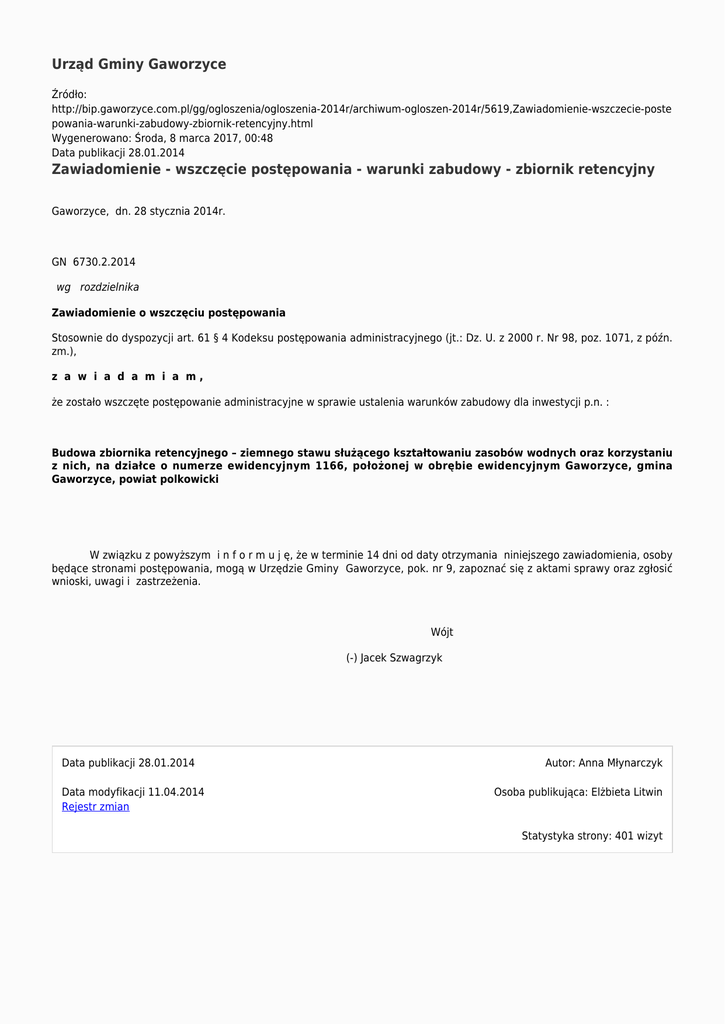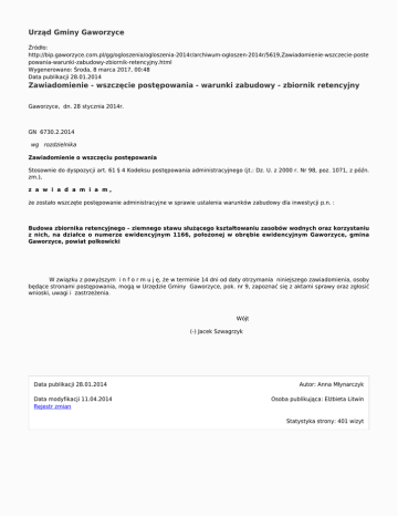 Urząd Gminy Gaworzyce Źródło: http://bip.gaworzyce.com.pl/gg/ogloszenia/ogloszenia-2014r/archiwum-ogloszen-2014r/5619,Zawiadomienie-wszczecie-poste powania-warunki-zabudowy-zbiornik-retencyjny.html Wygenerowano: Środa, 8 marca 2017, 00:48 Data publikacji 28.01.2014 Zawiadomienie - wszczęcie postępowania - warunki zabudowy - zbiornik retencyjny Gaworzyce, dn. 28 stycznia 2014r. GN 6730.2.2014 wg rozdzielnika Zawiadomienie o wszczęciu postępowania Stosownie do dyspozycji art. 61 § 4 Kodeksu postępowania administracyjnego (jt.: Dz. U. z 2000 r. Nr 98, poz. 1071, z późn. zm.), z a w i a d a m i a m, że zostało wszczęte postępowanie administracyjne w sprawie ustalenia warunków zabudowy dla inwestycji p.n. : Budowa zbiornika retencyjnego – ziemnego stawu służącego kształtowaniu zasobów wodnych oraz korzystaniu z nich, na działce o numerze ewidencyjnym 1166, położonej w obrębie ewidencyjnym Gaworzyce, gmina Gaworzyce, powiat polkowicki W związku z powyższym i n f o r m u j ę, że w terminie 14 dni od daty otrzymania niniejszego zawiadomienia, osoby będące stronami postępowania, mogą w Urzędzie Gminy Gaworzyce, pok. nr 9, zapoznać się z aktami sprawy oraz zgłosić wnioski, uwagi i zastrzeżenia. Wójt (-) Jacek Szwagrzyk Data publikacji 28.01.2014 Data modyfikacji 11.04.2014 Rejestr zmian Autor: Anna Młynarczyk Osoba publikująca: Elżbieta Litwin Statystyka strony: 401 wizyt