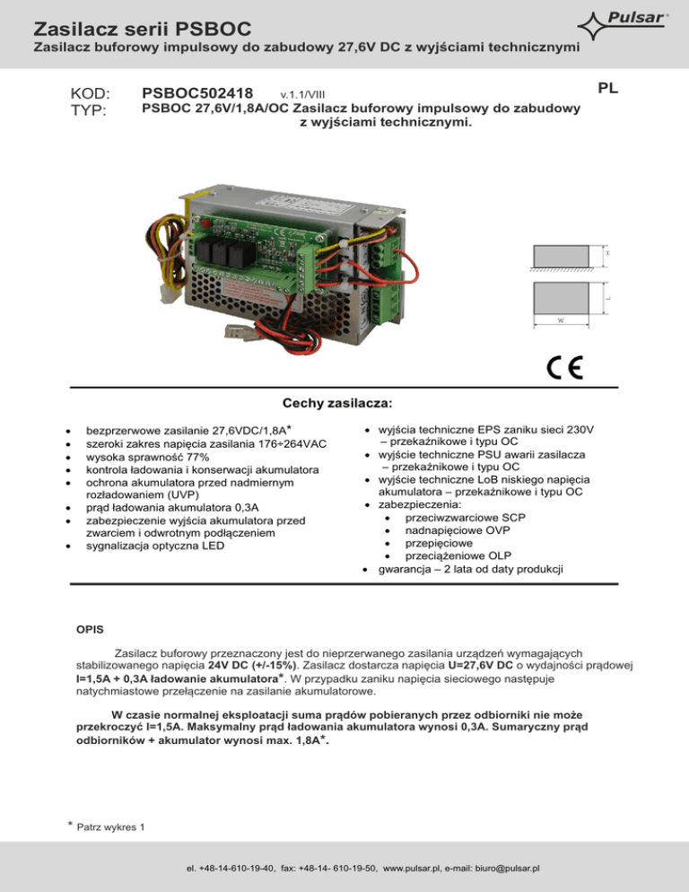 Pulsar Zasilacz serii PSBOC Zasilacz buforowy impulsowy do zabudowy 27,6V DC z wyjściami technicznymi KOD: TYP: PSBOC502418 PL v.1.1/VIII PSBOC 27,6V/1,8A/OC Zasilacz buforowy impulsowy do zabudowy z wyjściami technicznymi. Cechy zasilacza: · · · · · · · · bezprzerwowe zasilanie 27,6VDC/1,8A* szeroki zakres napięcia zasilania 176÷264VAC wysoka sprawność 77% kontrola ładowania i konserwacji akumulatora ochrona akumulatora przed nadmiernym rozładowaniem (UVP) prąd ładowania akumulatora 0,3A zabezpieczenie wyjścia akumulatora przed zwarciem i odwrotnym podłączeniem sygnalizacja optyczna LED · wyjścia techniczne EPS zaniku sieci 230V – przekaźnikowe i typu OC · wyjście techniczne PSU awarii zasilacza – przekaźnikowe i typu OC · wyjście techniczne LoB niskiego napięcia akumulatora – przekaźnikowe i typu OC · zabezpieczenia: · przeciwzwarciowe SCP · nadnapięciowe OVP · przepięciowe · przeciążeniowe OLP · gwarancja – 2 lata od daty produkcji OPIS Zasilacz buforowy przeznaczony jest do nieprzerwanego zasilania urządzeń wymagających stabilizowanego napięcia 24V DC (+/-15%). Zasilacz dostarcza napięcia U=27,6V DC o wydajności prądowej I=1,5A + 0,3A ładowanie akumulatora*. W przypadku zaniku napięcia sieciowego następuje natychmiastowe przełączenie na zasilanie akumulatorowe. W czasie normalnej eksploatacji suma prądów pobieranych przez odbiorniki nie może przekroczyć I=1,5A. Maksymalny prąd ładowania akumulatora wynosi 0,3A. Sumaryczny prąd odbiorników + akumulator wynosi max. 1,8A*. * Patrz wykres 1 wyjście TAMPER : przewody 30cm el. +48-14-610-19-40, fax: +48-14- 610-19-50, www.pulsar.pl, e-mail: [email protected] ® Pulsar Zasilacz serii PSBOC Zasilacz buforowy impulsowy do zabudowy 27,6V DC z wyjściami technicznymi DANE TECHNICZNE Zasilanie: Pobór prądu: Moc zasilacza: Sprawność: Napięcie wyjściowe: Prąd wyjściowy tAMB<30°C Prąd wyjściowy tAMB=40°C Zakres regulacji napięcia wyjściowego: Napięcie tętnienia: Pobór prądu przez układy zasilacza Prąd ładowania akumulatora: Zabezpieczenie przed zwarciem SCP: Zabezpieczenie przeciążeniowe OLP Zabezpieczenie w obwodzie akumulatora SCP i odwrotna polaryzacja podłączenia: Zabezpieczenie nadnapięciowe OVP Zabezpieczenie akumulatora przed nadmiernym rozładowaniem UVP: Wyjścia techniczne: - EPS; wyjście sygnalizujące awarię zasilania AC 176 ÷ 264V AC 0,6A@230VAC max. 50W max. 77% 22V÷ 27,6V DC – praca buforowa 19V÷27,6V DC – praca bateryjna 1,5A + 0,3A ładowanie akumulatora - patrz wykres 1 1A + 0,3A ładowanie akumulatora - patrz wykres 1 24÷28V DC 150 mV p-p max. 50 mA 0,3A elektroniczne, automatyczny powrót 105-150% mocy zasilacza, automatyczny powrót bezpiecznik polimerowy >32V (przywracanie automatyczne) U<19V (± 5%) – odłączenie zacisku akumulatora - typu przekaźnikowego: 1A@ 30VDC/50VAC, czas opóźnienia zadziałania: ok. 10s. - typu OC: 50mA max. stan normalny: poziom L (0V), awaria: poziom hi-Z, opóźnienie 10s. - PSU; wyjście sygnalizujące brak napięcia DC/awarię zasilacza - typu przekaźnikowego: 1A@ 30VDC/50VAC - typu OC, 50mA max. stan normalny: poziom L (0V), awaria: poziom hi-Z - LoB wyjście sygnalizujące niski poziom napięcia akumulatora - typu przekaźnikowego: 1A@ 30VDC/50VAC - typu OC, 50mA max. stan normalny (UBAT >23V): poziom L (0V), awaria (UBAT <23V): poziom hi-Z Zasilacz nie posiada funkcji wykrywania akumulatora. Tak - diody LED o o II klasa środowiskowa, -10 C÷40 C 159 x 97 x 42 +23 [mm] (LxWxH) (+/- 2) 0,59kg / 0,65kg CE, RoHS, 2 lata od daty produkcji Optyczna sygnalizacja pracy: Warunki pracy: Wymiary: Waga netto/brutto Deklaracje, gwarancja Wykres 1. Dopuszczalny prąd wyjściowy zasilacza w zależności od temperatury otoczenia. wyjście TAMPER : przewody 30cm Tel. +48-14-610-19-40, fax: +48-14- 610-19-50, www.pulsar.pl, e-mail: [email protected] ®