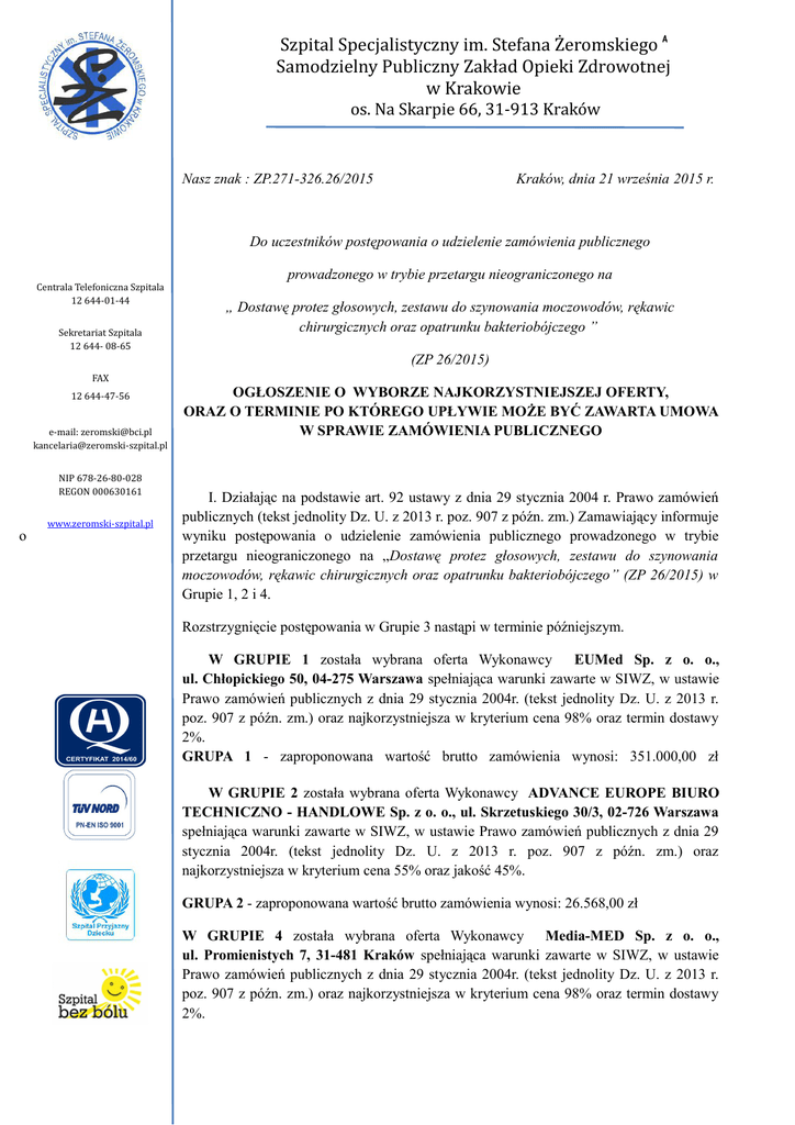Szpital Specjalistyczny im. Stefana Żeromskiego Samodzielny Publiczny Zakład Opieki Zdrowotnej w Krakowie os. Na Skarpie 66, 31-913 Kraków Nasz znak : ZP.271-326.26/2015 Kraków, dnia 21 września 2015 r. Do uczestników postępowania o udzielenie zamówienia publicznego Centrala Telefoniczna Szpitala 12 644-01-44 Sekretariat Szpitala 12 644- 08-65 FAX 12 644-47-56 e-mail: [email protected] [email protected] NIP 678-26-80-028 REGON 000630161 o www.zeromski-szpital.pl prowadzonego w trybie przetargu nieograniczonego na „ Dostawę protez głosowych, zestawu do szynowania moczowodów, rękawic chirurgicznych oraz opatrunku bakteriobójczego ” (ZP 26/2015) OGŁOSZENIE O WYBORZE NAJKORZYSTNIEJSZEJ OFERTY, ORAZ O TERMINIE PO KTÓREGO UPŁYWIE MOŻE BYĆ ZAWARTA UMOWA W SPRAWIE ZAMÓWIENIA PUBLICZNEGO I. Działając na podstawie art. 92 ustawy z dnia 29 stycznia 2004 r. Prawo zamówień publicznych (tekst jednolity Dz. U. z 2013 r. poz. 907 z późn. zm.) Zamawiający informuje wyniku postępowania o udzielenie zamówienia publicznego prowadzonego w trybie przetargu nieograniczonego na „Dostawę protez głosowych, zestawu do szynowania moczowodów, rękawic chirurgicznych oraz opatrunku bakteriobójczego” (ZP 26/2015) w Grupie 1, 2 i 4. Rozstrzygnięcie postępowania w Grupie 3 nastąpi w terminie późniejszym. W GRUPIE 1 została wybrana oferta Wykonawcy EUMed Sp. z o. o., ul. Chłopickiego 50, 04-275 Warszawa spełniająca warunki zawarte w SIWZ, w ustawie Prawo zamówień publicznych z dnia 29 stycznia 2004r. (tekst jednolity Dz. U. z 2013 r. poz. 907 z późn. zm.) oraz najkorzystniejsza w kryterium cena 98% oraz termin dostawy 2%. GRUPA 1 - zaproponowana wartość brutto zamówienia wynosi: 351.000,00 zł W GRUPIE 2 została wybrana oferta Wykonawcy ADVANCE EUROPE BIURO TECHNICZNO - HANDLOWE Sp. z o. o., ul. Skrzetuskiego 30/3, 02-726 Warszawa spełniająca warunki zawarte w SIWZ, w ustawie Prawo zamówień publicznych z dnia 29 stycznia 2004r. (tekst jednolity Dz. U. z 2013 r. poz. 907 z późn. zm.) oraz najkorzystniejsza w kryterium cena 55% oraz jakość 45%. GRUPA 2 - zaproponowana wartość brutto zamówienia wynosi: 26.568,00 zł W GRUPIE 4 została wybrana oferta Wykonawcy Media-MED Sp. z o. o., ul. Promienistych 7, 31-481 Kraków spełniająca warunki zawarte w SIWZ, w ustawie Prawo zamówień publicznych z dnia 29 stycznia 2004r. (tekst jednolity Dz. U. z 2013 r. poz. 907 z późn. zm.) oraz najkorzystniejsza w kryterium cena 98% oraz termin dostawy 2%. GRUPA 4 - zaproponowana wartość brutto zamówienia wynosi: 7.147,44 zł, Zestawienie wykonawców, którzy złożyli oferty: L.P. Nr oferty Grupa Nazwa i siedziba wykonawców, którzy złożyli oferty 1 1 1 EUMed Sp. z o. o., ul. Chłopickiego 50, 04-275 Warszawa 2 2 3 ABOOK Sp. z o. o., ul. Brzostowska 22, 04-985 Warszawa 3 3 2 ADVANCE EUROPE BIURO TECHNICZNO HANDLOWE Sp. z o. o., ul. Skrzetuskiego 30/3, 02-726 Warszawa 4 4 4 Media-MED Sp. 31-481 Kraków z o. o.,ul. Promienistych 7, Zestawienie wykonawców wraz ze streszczeniem oceny i porównaniem złożonych ofert: GRUPA 1 Nr oferty 1 1 Nazwa i siedziba wykonawców, którzy złożyli oferty Punktacja w kryterium cena (98%) Punktacja w kryterium termin dostawy (2%) Łączna punktacja EUMed Sp. z o. o., ul. Chłopickiego 50, 04-275 Warszawa 98 pkt. 2 pkt. 100 pkt. Nazwa i siedziba wykonawców, którzy złożyli oferty Punktacja w kryterium cena (55%) Punktacja w kryterium jakość (45%) Łączna punktacja ADVANCE EUROPE BIURO TECHNICZNO- HANDLOWE Sp. z o. o., ul. Skrzetuskiego 30/3, 02-726 Warszawa 55 pkt. 45 pkt. 100 pkt. Punktacja w kryterium cena (98%) Punktacja w kryterium termin dostawy (2%) Łączna punktacja 98 pkt. 2 pkt. 100 pkt. GRUPA 2 L.P. 2 Nr oferty 3 GRUPA 4 L.P. 3 Nr oferty 4 Nazwa i siedziba wykonawców, którzy złożyli oferty Media-MED Sp. z o. ul. Promienistych 31-481 Kraków o., 7, II. Działając na podstawie art. 92 ust. 1 pkt. 4 w/w ustawy Dyrektor Szpitala informuje, że umowy w przedmiotowym postępowaniu o udzielenie zamówienia publicznego zostaną zawarte zgodnie z art. 94 ustawy Prawo zamówień publicznych w dniu 24 września 2015r. Ogłoszenie powyższe przekazane zostanie wszystkim uczestnikom postępowania, zamieszczone na stronie internetowej Szpitala oraz umieszczone na tablicy ogłoszeń w siedzibie Zamawiającego od dnia 21 września 2015 r. Dziękujemy za udział w procedurze przetargowej. ZATWIERDZIŁ: Dr med. Zbigniew J. Król Dyrektor Szpitala Prosimy o potwierdzenie otrzymania w dniu 21 września 2015 r. niniejszego pisma nr ZP.271-326.26/2015 na nr faxu 12/ 644 47 56 lub e-mail: kancelaria@ zeromski-szpital.pl