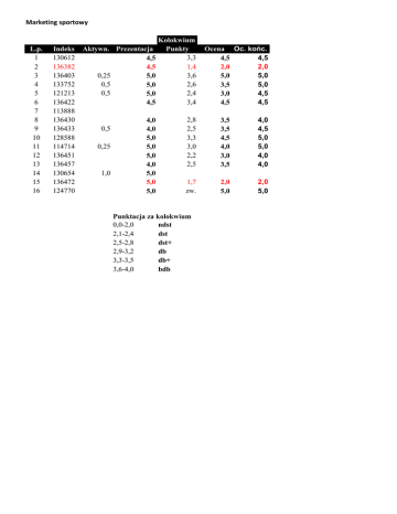 Marketing sportowy L.p. 1 2 3 4 5 6 7 8 9 10 11 12 13 14 15 16 Indeks 130612 136382 136403 133752 121213 136422 113888 136430 136433 128588 114714 136451 136457 130654 136472 124770 Aktywn. Prezentacja 4,5 4,5 0,25 5,0 0,5 5,0 0,5 5,0 4,5 0,5 0,25 1,0 4,0 4,0 5,0 5,0 5,0 4,0 5,0 5,0 5,0 Kolokwium Punkty 3,3 1,4 3,6 2,6 2,4 3,4 Ocena Oc. końc. 4,5 4,5 2,0 2,0 5,0 5,0 3,5 5,0 3,0 4,5 4,5 4,5 2,8 2,5 3,3 3,0 2,2 2,5 3,5 3,5 4,5 4,0 3,0 3,5 4,0 4,5 5,0 5,0 4,0 4,0 1,7 zw. 2,0 5,0 2,0 5,0 Punktacja za kolokwium 0,0-2,0 ndst 2,1-2,4 dst 2,5-2,8 dst+ 2,9-3,2 db 3,3-3,5 db+ 3,6-4,0 bdb