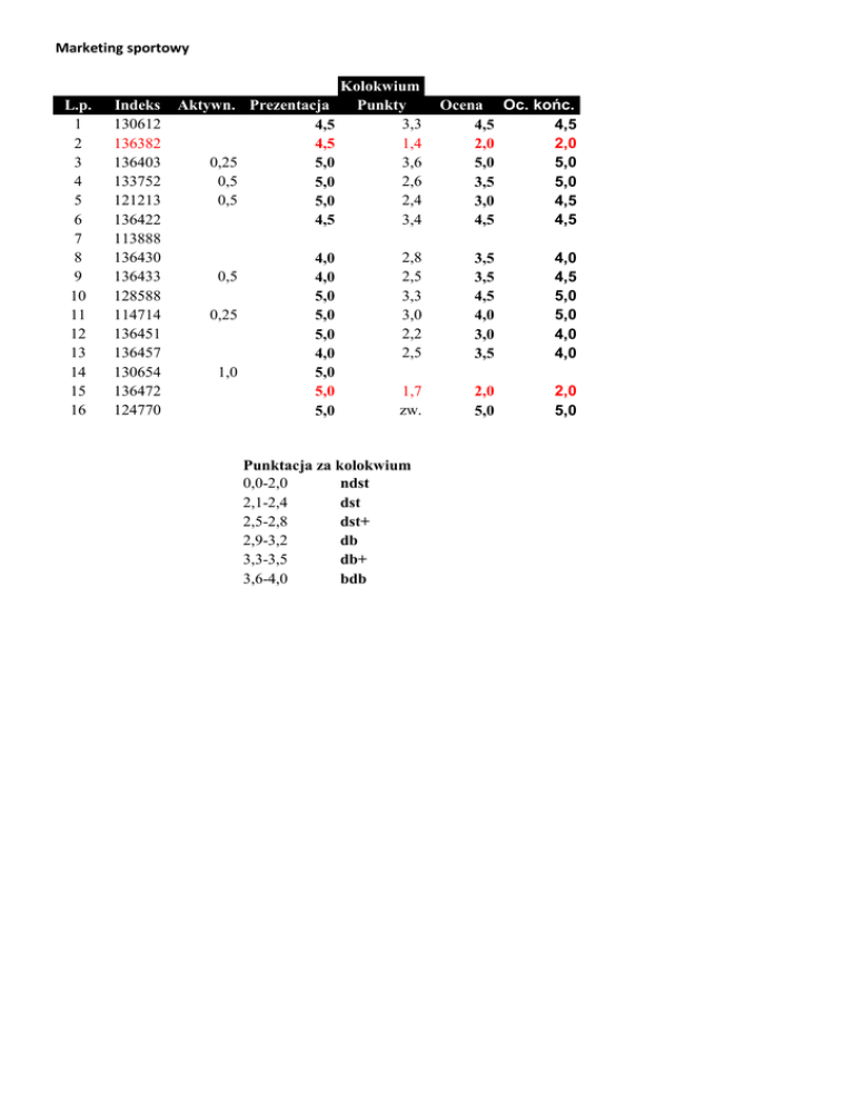 Marketing sportowy Kolokwium L.p. Indeks Aktywn. Prezentacja
