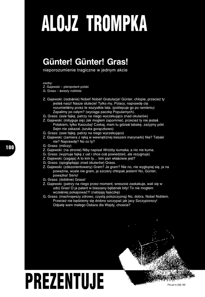 ALOJZ TROMPKA Günter! Günter! Gras! nieporozumienie tragiczne w jednym akcie osoby: Z. Gajewski plenipotent polski G. Grass wie¿y noblista 100 Z. Gajewski: (radonie) Nobel! Nobel! Gratulacje! Günter, ch³opie, przecie¿ ty jeste nasz! Nasze stulecie! Tylko my, Polacy, naprawdê ciê rozumielimy przez te wszystkie lata. (poklepuje go po ramieniu) Zapalimy po ca³ym? (wyci¹ga paczkê Popularnych). G. Grass: (ssie fajkê, patrzy na niego wyczekuj¹co znad okularów) Z. Gajewski: (mityguje siê) Jak mog³em zapomnieæ, przecie¿ ty nie jeste Polakiem, tylko Kaszub¹! Czekaj, mam tu gdzie tabakê, za¿yjmy póki Sejm nie zakaza³. (szuka gor¹czkowo) G. Grass: (ssie fajkê, patrzy na niego wyczekuj¹co) Z. Gajewski: (zamiera z rêk¹ w wewnêtrznej kieszeni marynarki) Nie? Tabaki nie? Naprawdê? No co ty? G. Grass: (milczy) Z. Gajewski: (na stronie) Niby napisa³ Wró¿by kumaka, a nic nie kuma. G. Grass: (wyjmuje fajkê z ust i chce co powiedzieæ, ale rezygnuje) Z. Gajewski: (zagaja) A to kim ty kim pan w³aciwie jest? G. Grass: (spogl¹daj¹c znad okularów) Grass. Z. Gajewski: (zdezorientowany) Gram? Ja gram? Nie no, nie wyg³upiaj siê, ja na powa¿nie, wcale nie gram, ja szczery ch³opak jestem! No, Günter, powa¿ka! Serio! G. Grass: (dobitnie) Grass! Z. Gajewski: (patrzy na niego przez moment, wreszcie zaskakuje, wali siê w udo) Gras! O ja palant w blaszany bêbenek bity! To nie mog³em wczeniej pokapowaæ?! (nabijaj¹ fajeczkê) G. Grass: (machn¹wszy zdrowo, czyst¹ polszczyzn¹) No, dobra, Nobel Noblem. Przecie¿ nie bêdziemy siê drobno szczypaæ jak jacy Szczypiorscy! Odpalê wam ma³ego Oskara dla Wajdy, chcecie? PREZENTUJE FA-art 4 (38) '99