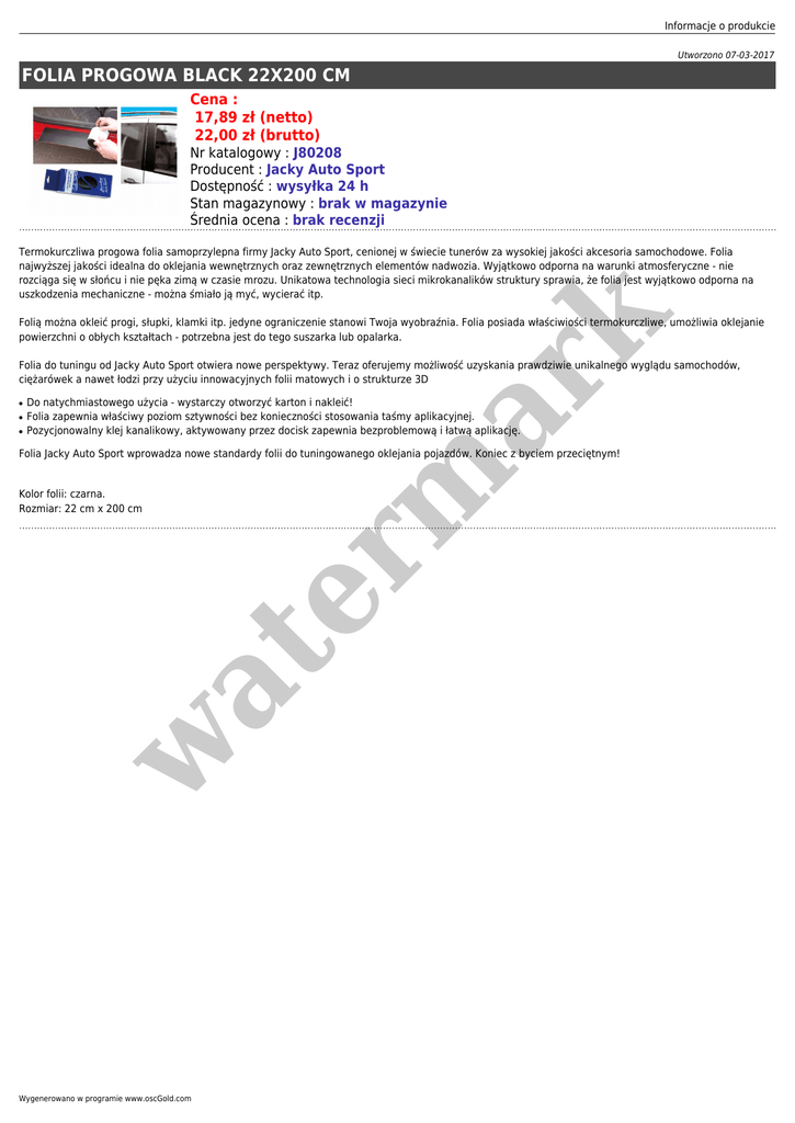 Informacje o produkcie Utworzono 07-03-2017 FOLIA PROGOWA BLACK 22X200 CM Cena : 17,89 zł (netto) 22,00 zł (brutto) Nr katalogowy : J80208 Producent : Jacky Auto Sport Dostępność : wysyłka 24 h Stan magazynowy : brak w magazynie Średnia ocena : brak recenzji er m ar k Termokurczliwa progowa folia samoprzylepna firmy Jacky Auto Sport, cenionej w świecie tunerów za wysokiej jakości akcesoria samochodowe. Folia najwyższej jakości idealna do oklejania wewnętrznych oraz zewnętrznych elementów nadwozia. Wyjątkowo odporna na warunki atmosferyczne - nie rozciąga się w słońcu i nie pęka zimą w czasie mrozu. Unikatowa technologia sieci mikrokanalików struktury sprawia, że folia jest wyjątkowo odporna na uszkodzenia mechaniczne - można śmiało ją myć, wycierać itp. Folią można okleić progi, słupki, klamki itp. jedyne ograniczenie stanowi Twoja wyobraźnia. Folia posiada właściwiości termokurczliwe, umożliwia oklejanie powierzchni o obłych kształtach - potrzebna jest do tego suszarka lub opalarka. Folia do tuningu od Jacky Auto Sport otwiera nowe perspektywy. Teraz oferujemy możliwość uzyskania prawdziwie unikalnego wyglądu samochodów, ciężarówek a nawet łodzi przy użyciu innowacyjnych folii matowych i o strukturze 3D ● ● ● Do natychmiastowego użycia - wystarczy otworzyć karton i nakleić! Folia zapewnia właściwy poziom sztywności bez konieczności stosowania taśmy aplikacyjnej. Pozycjonowalny klej kanalikowy, aktywowany przez docisk zapewnia bezproblemową i łatwą aplikację. Folia Jacky Auto Sport wprowadza nowe standardy folii do tuningowanego oklejania pojazdów. Koniec z byciem przeciętnym! w at Kolor folii: czarna. Rozmiar: 22 cm x 200 cm Wygenerowano w programie www.oscGold.com