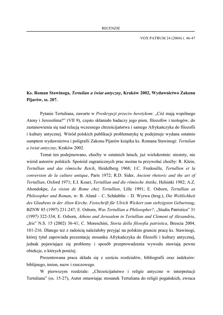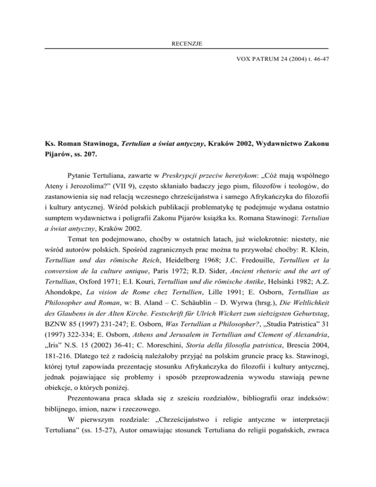 RECENZJE VOX PATRUM 24 (2004) t. 46-47 Ks. Roman Stawinoga, Tertulian a świat antyczny, Kraków 2002, Wydawnictwo Zakonu Pijarów, ss. 207. Pytanie Tertuliana, zawarte w Preskrypcji przeciw heretykom: „Cóż mają wspólnego Ateny i Jerozolima?” (VII 9), często skłaniało badaczy jego pism, filozofów i teologów, do zastanowienia się nad relacją wczesnego chrześcijaństwa i samego Afrykańczyka do filozofii i kultury antycznej. Wśród polskich publikacji problematykę tę podejmuje wydana ostatnio sumptem wydawnictwa i poligrafii Zakonu Pijarów książka ks. Romana Stawinogi: Tertulian a świat antyczny, Kraków 2002. Temat ten podejmowano, choćby w ostatnich latach, już wielokrotnie: niestety, nie wśród autorów polskich. Spośród zagranicznych prac można tu przywołać choćby: R. Klein, Tertullian und das römische Reich, Heidelberg 1968; J.C. Fredouille, Tertullien et la conversion de la culture antique, Paris 1972; R.D. Sider, Ancient rhetoric and the art of Tertullian, Oxford 1971; E.I. Kouri, Tertullian und die römische Antike, Helsinki 1982; A.Z. Ahondokpe, La vision de Rome chez Tertullien, Lille 1991; E. Osborn, Tertullian as Philosopher and Roman, w: B. Aland – C. Schäublin – D. Wyrwa (hrsg.), Die Weltlichkeit des Glaubens in der Alten Kirche. Festschrift für Ulrich Wickert zum siebzigsten Geburtstag, BZNW 85 (1997) 231-247; E. Osborn, Was Tertullian a Philosopher?, „Studia Patristica” 31 (1997) 322-334; E. Osborn, Athens and Jerusalem in Tertullian and Clement of Alexandria, „Iris” N.S. 15 (2002) 36-41; C. Moreschini, Storia della filosofia patristica, Brescia 2004, 181-216. Dlatego też z radością należałoby przyjąć na polskim gruncie pracę ks. Stawinogi, której tytuł zapowiada prezentację stosunku Afrykańczyka do filozofii i kultury antycznej, jednak pojawiające się problemy i sposób przeprowadzenia wywodu stawiają pewne obiekcje, o których poniżej. Prezentowana praca składa się z sześciu rozdziałów, bibliografii oraz indeksów: biblijnego, imion, nazw i rzeczowego. W pierwszym rozdziale: „Chrześcijaństwo i religie antyczne w interpretacji Tertuliana” (ss. 15-27), Autor omawiając stosunek Tertuliana do religii pogańskich, zwraca RECENZJE uwagę, przy negatywnym doń jego nastawieniu, na naturalne pragnienie absolutu, zbawiciela i męża opatrznościowego (s. 19), obecne także w tych religiach, które to nastawienie autor publikacji, powołując się na nauczanie św. Pawła, uważa za podstawę do rozwoju religii chrześcijańskiej; poruszana jest przy tym także kwestia istnienia bóstw pogańskich (ss. 2224) oraz zarzutów wobec chrześcijan i ich rzekomej bezbożności (ss. 24-26). W rozdziale drugim: „Stanowisko Tertuliana wobec filozofii i filozofów” (ss. 28-45) Autor wychodząc od dwóch kierunków istniejących w pierwotnym Kościele: Pawłowego – prostej wiary i Janowego – wiary oświeconej (s. 29), przedstawia postawę Tertuliana wobec mądrości ludzkiej, czyli filozofii; stwierdza, iż „dla niego chrześcijaństwo to nie jakaś tam filozofia, ale sprawa boska” (s. 30) i dlatego też postawa Pawłowa będzie charakterystyczna również dla Tertuliana. Autor przedstawia przyczyny antypatii Afrykańczyka wobec filozofii i samych filozofów (ss. 31-38). W zakończeniu tego rozdziału ks. Stawinoga konstatuje, że nie można mówić o wrogości Tertuliana wobec filozofii, co wielu autorów mu zarzuca, a właściwie o niechęci spowodowanej zagrożeniem dla wiary ze strony filozofii pogańskiej. Przedstawia także argumenty, dla których można go nazwać „z konieczności antyfilozofem” (s. 39) oraz przedstawia dzieła, w których korzysta on z filozofii, a nawet, rzec by można, jest filozofem (ss. 44-45) . Kolejny, trzeci rozdział, ukazuje temat: „Tertulian jako pisarz i jako krytyk literatury antycznej” (ss. 46-60), w którym Autor m.in. stwierdza, iż „Tertulian do chrześcijaństwa przyszedł z zewnątrz i, podobnie jak inni tego okresu pisarze chrześcijańscy, wszedł doń bogaty zasobem wiedzy i nieprzeciętną umiejętnością posługiwania się środkami warsztatu naukowego i literackiego, jaką mu dało i zapewniło wykształcenie ówczesne – ogólne, typowe dla epoki – na równi z innymi oświeconymi obywatelami cesarstwa rzymskiego. I spod naporu tej edukacji szczęśliwie nie potrafił się wyzwolić” (ss. 46-47); w dalszej kolejności ukazuje wpływ owej edukacji i kultury na pisarstwo Kartagińczyka oraz na jego widzenie literatury i filozofii pogańskiej. „Nauka i wychowanie młodzieży chrześcijańskiej w szkołach publicznych – według Tertuliana” to tytuł czwartego rozdziału (ss. 61-68), w którym Autor w zwięzły sposób przedstawia „problem oświaty, nauczania i wychowania młodzieży chrześcijańskiej w warunkach określonych istnieniem wyłącznie szkół realizujących program oparty o literaturę i naukę ‘pogańską’ i tradycyjny system wychowania antycznego” (s. 61) i odpowiedź Tertuliana na te problemy w odniesieniu do nauczyciela i wychowanka. W rozdziale piątym (ss. 69-94) ks. Stawinoga przedstawia „Pogląd Tertuliana na państwo i władze państwowe oraz obowiązki obywatelskie chrześcijanina”, który „trzeba widzieć: po pierwsze – na tle sytuacji ustrojowej uniwersalnego imperium rzymskiego w ówczesnych warunkach wielkiej polityki światowej; po drugie – w świetle podstawowych RECENZJE zasad i roszczeń sui generis ze strony równie czy nawet bardziej jeszcze uniwersalnego w założeniu ‘królestwa nie z tego świata’ nowej religii, monoteistycznej, obejmującej władztwo dusz o nieograniczonym zasięgu przestrzennym i czasowym” (s. 69) i w oparciu o te principia Autor dokonuje analizy pism Afrykańczyka wobec kultu pogańskiego (s. 70) i władzy państwowej (ss. 71-77); przedstawia tu także zawarte w pismach Tertuliana praktyczne implikacje stosunku chrześcijan do państwa np. modlitwa za panującego