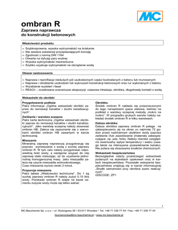 ombran R Zaprawa naprawcza do konstrukcji betonowych Właściwości produktu • • • • • • Szybkosprawna, wysoka wytrzymałość na ściskanie Nie zawiera substancji przyspieszających korozję Zgodność z normą DIN 1164 Otwarta na dyfuzję pary wodnej Wysoka wytrzymałość mechaniczna Szybko uzyskuje wytrzymałość na obciążenie wodą Obszar zastosowania • • • • Naprawa i reprofilacja niedużych pól uszkodzonych części budowlanych z betonu lub murowanych Naprawa i obrabianie uszkodzeń lub wykruszeń konstrukcji betonowych oraz rur wykonanych z betonu Wyrabianie wyobleń i faset REACh – oczekiwane scenariusze ekspozycji: czasowa inhalacja, obróbka, długotrwały kontakt z wodą Wskazówki do obróbki Przygotowanie podłoża Patrz informacja „Ogólne wskazówki obróbki zapraw do renowacji kanałów i studni kanalizacyjnych”. Zwilżanie / warstwa sczepna Patrz karta techniczna „Ogólne wskazówki obróbki zapraw do renowacji kanałów i studni kanalizacyjnych”. Jako warstwę sczepną należy stosować ombran HB. Zaleca się zapoznanie się z warunkami obróbki ombran HB zawartymi w karcie technicznej. Mieszanie Mineralną zaprawę naprawczą przygotowuję się poprzez wymieszanie z wodą z suchej zaprawy ombran R. W tym celu należy przygotować odpowiednią ilość wody, a następnie wsypać do niej zaprawę stale mieszając, aż do uzyskania jednorodnej homogenicznej masy. Jako mieszadła zaleca się użycie mieszadła wolnoobrotowego. Czas mieszania wynosi około 3 minut. Proporcje mieszania Patrz tabela „Właściwości techniczne”. Do 1 kg suchej zaprawy ombran R należy zużyć 0,15 litra wody. Ponieważ ombran R wiąże na bazie cementu zużycie wody może się lekko wahać Obróbka Środek ombran R nakłada się przeznaczonymi do tego narzędziami (paca stalowa, kielnia) na podkład z warstwy sczepnej metodą „mokro na mokro”. W przypadku grubych warstw należy nakładać środek ombran R w kilku warstwach. Dalsza obróbka Dalsza obróbka zaprawy ombran R polega na zabezpieczeniu jej na okres co najmniej 72 godzin przed nadmiernym ubytkiem wody poprzez zwilżanie i/lub zaizolowanie (materiały zabezpieczające, np. juta, folia). Należy również uwzględnić ewentualny wpływ temperatury i wiatru (uwaga także na intensywne przewietrzenie kanału). Nie poleca się stosowania środków chemicznych. Wskazówki bezpieczeństwa Bezwzględnie należy przestrzegać wskazówek podanych na etykietach opakowań oraz w kartach bezpieczeństwa. Pozostałe wskazania bezpieczeństwa znajdują się w karcie informacyjnej „Środki ostrożności przy obróbce żywic reakcyjnych”. GISCODE: ZP1 1 MC-Bauchemie Sp. z o.o. • ul. Wyścigowa 39 • 53-011 Wrocław • Tel. +48 71 339 77 44 • Fax: +48 71 339 77 44 [email protected] • www.mc-bauchemie.pl Właściwości techniczne zaprawy ombran R Parametr Jednostka Wartość* Uwagi Stosunek mieszania wagowo Ombran R : woda Czas obróbki min. 1 : 0,15 ok. 7 Temperatura aplikacji o Zużycie** suchej zaprawy +5 do +30 temperatura powietrza, podłoża i materiału kg/m /mm ok. 1,7 suchej zaprawy Grubości warstw mm na każdy krok roboczy max grubość powłok Obciążalność wodą godz. 3 – 15 30 ok. 1,5 Maksymalne uziarnienie mm C Gęstość świeżej zaprawy 2 ok.1 kg/dm 3 Rozwój wytrzymałości na ściskanie N/mm 2 Rozwój wytrzymałości 2 N/mm na rozciąganie przy zginaniu * ok. 2,0 15,0 24,0 35,0 37,0 po 1 godzinie po 1 dniu po 7 dniach po 28 dniach ok. 3,5 ok. 4,8 ok. 7,0 ok. 7,5 po 1 godzinie po 1 dniu po 7 dniach po 28 dniach Podane parametry są podane dla temperatury +23°C i 50% wilgotności względnej powietrza. ** Zużycie zależy od szorstkości i temperatury podłoża oraz od temperatury składowania i obróbki. W celu określenia zużycia w danym obiekcie zalecamy wykonanie uprzednich prób. Właściwości produktu ombran R Kolor Szary Dostawa Pojemnik 15 kg Środek do oczyszczenia narzędzi Woda Składowanie Szczelnie zamknięte oryginalne opakowania mogą być składowane przez co najmniej jeden rok w suchym pomieszczeniu w temperaturach pomiędzy + 5°C i + 25° C. Te same warunki dotyczą transportu. Utylizacja opakowań Należy całkowicie opróżniać opakowania. Dodatkowe informacje znajdują się w broszurce informacyjnej „System utylizacji pustych opakowań opracowany przez firmę MC”, którą na Państwa życzenie chętnie wyślemy. Uwaga: Wszelkie informacje zawarte w niniejszej karcie oparte są na naszym doświadczeniu i najlepszej wiedzy, jednakże nie mogą być traktowane jako prawnie wiążące. Należy bezwzględnie każdorazowo stosować się do prawodawstwa miejscowego, w zakresie przeznaczenia oraz zastosowania w obiektach budowlanych. Przy spełnieniu powyższych wymogów odpowiadamy za poprawność przekazanych informacji w ramach naszych Ogólnych Warunków Sprzedaży, Dostaw i Płatności. Wszelkie doradztwo ze strony naszych Współpracowników, odbiegające od treści naszych kart technicznych, jest wiążące jedynie w przypadku pisemnego ich potwierdzenia. W każdym przypadku należy stosować się do ogólnie obowiązujących zasad sztuki budowlanej. Wydanie 07/2013. Niniejszy druk został aktualizowany pod względem technicznym. Unieważnia się dotychczasowe wydania i nie wolno ich stosować. W przypadku wydania nowej karty, zaktualizowanej pod względem technicznym, wydanie niniejsze traci ważność. 2 MC-Bauchemie Sp. z o.o. • ul. Wyścigowa 39 • 53-011 Wrocław • Tel. +48 71 339 77 44 • Fax: +48 71 339 77 44 [email protected] • www.mc-bauchemie.pl