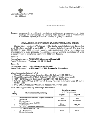 Łask, dnia 04 sierpnia 2014 r. Jednostka Wojskowa 1158 98 – 100 Łask ………………………… ………………………... Dotyczy: postępowania o udzielenie zamówienia publicznego prowadzonego w trybie przetargu nieograniczonego na wymianę kabli ziemnych wraz z rozdzielnicami w kompleksie wojskowym 6030 w m. Teodory, nr sprawy 51/PN/2014 ZAWIADOMIENIE O WYBORZE NAJKORZYSTNIEJSZEJ OFERTY Zamawiający – Jednostka Wojskowa 1158 w Łasku uprzejmie informuje, że zgodnie z art. 91 ustawy z dnia 29 stycznia 2004 r. - Prawo zamówień publicznych (Dz. U. z dnia 09.08.2013 poz. 907) dokonał wyboru najkorzystniejszej oferty w postępowaniu prowadzonym w trybie przetargu nieograniczonego na wymianę kabli ziemnych wraz z rozdzielnicami w kompleksie wojskowym 6030 w m. Teodory: Część I: Nazwa Wykonawcy: PHU EMMA Mieczysław Muszyński Adres Wykonawcy: Teodory 108, 98-100 Łask Część II: Nazwa Wykonawcy: Usługi Elektryczne ELGAN Adres Wykonawcy: ul. Zielona 97, 97-200 Tomaszów Mazowiecki W postępowaniu złożono 5 ofert: 1. Usługi Ogólnobudowlane Eugeniusz Statucki, Dalewo 94 63-100 Śrem, 2. Usługi Elektryczne ELGAN ul. Zielona 97 97-200 Tomaszów Mazowiecki, 3. OST - BUD Sławomir Oset , os. Okrzei 25/11 97-400 Bełchatów, 4. ERLICH Zakład Usług Elektrycznych Cezary Feterlich ul. Adwentowicza 21 m. 54, 92-534 Łódź, 5. PHU EMMA Mieczysław Muszyński, Teodory 108, 98-100 Łask, które uzyskały punktację wg poniższego zestawienia: Nr oferty 1 2 3 Nazwa i adres Wykonawcy Usługi Ogólnobudowlane Eugeniusz Statucki Dalewo 94 63-100, Śrem Usługi Elektryczne ELGAN ul. Zielona 97 97 – 200, Tomaszów Mazowiecki OST - BUD Sławomir OSET os. Okrzei 25/11 97-400, Bełchatów Uzyskane punkty w kryterium cena Część I Część II Oferta odrzucona Oferta odrzucona Oferta odrzucona 100,00 51,79 48,38 Nr oferty 4 5 Nazwa i adres Wykonawcy ERLICH Zakład Usług Elektrycznych Cezary Feterlich ul. Adwentowicza 21 m. 54 92-534, Łódź PHU EMMA Mieczysław Muszyński Teodory 108 98-100, Łask Uzyskane punkty w kryterium cena Część I Część II 82,39 78,59 100,00 Oferta odrzucona ZAWIADOMIENIE O ODRZUCENIU OFERTY Na podstawie art. 92 ust. 1 pkt 2 ustawy – Prawo zamówień publicznych Zamawiający informuje o odrzuceniu następujących ofert: - na podstawie art. 89 ust. 1 pkt. 2 ustawy Prawo zamówień publicznych Nr 1 - Usługi Ogólnobudowlane Eugeniusz Statucki, Dalewo 94, 63-100 Śrem w części I i II postępowania, ponieważ jej treść nie odpowiadała treści specyfikacji istotnych warunków zamówienia. - na podstawie art. 89 ust. 1 pkt. 2 i 6 ustawy Prawo zamówień publicznych Nr 2 - Usługi Elektryczne ELGAN, ul. Zielona 97, 97 – 200 Tomaszów Mazowiecki w części I postępowania, Nr 5 - PHU EMMA Mieczysław Muszyński, Teodory 108, 98-100 Łask w części II postępowania, ponieważ jej treść nie odpowiadała treści specyfikacji istotnych warunków zamówienia i zawierała błędy w obliczeniu ceny. Jednocześnie Zamawiający informuje, iż zgodnie z wyborem najkorzystniejszej oferty zawrze umowy z Wykonawcami, których oferty były najkorzystniejsze w postępowaniu. Zgodnie z art. 94 ust. 1 pkt 2) termin po upływie którego umowy w sprawie zamówienia publicznego mogą być zawarte to: 09.08.2014 r. DOWÓDCA (-) wz. ppłk mgr inż. Zbigniew ROSIAK