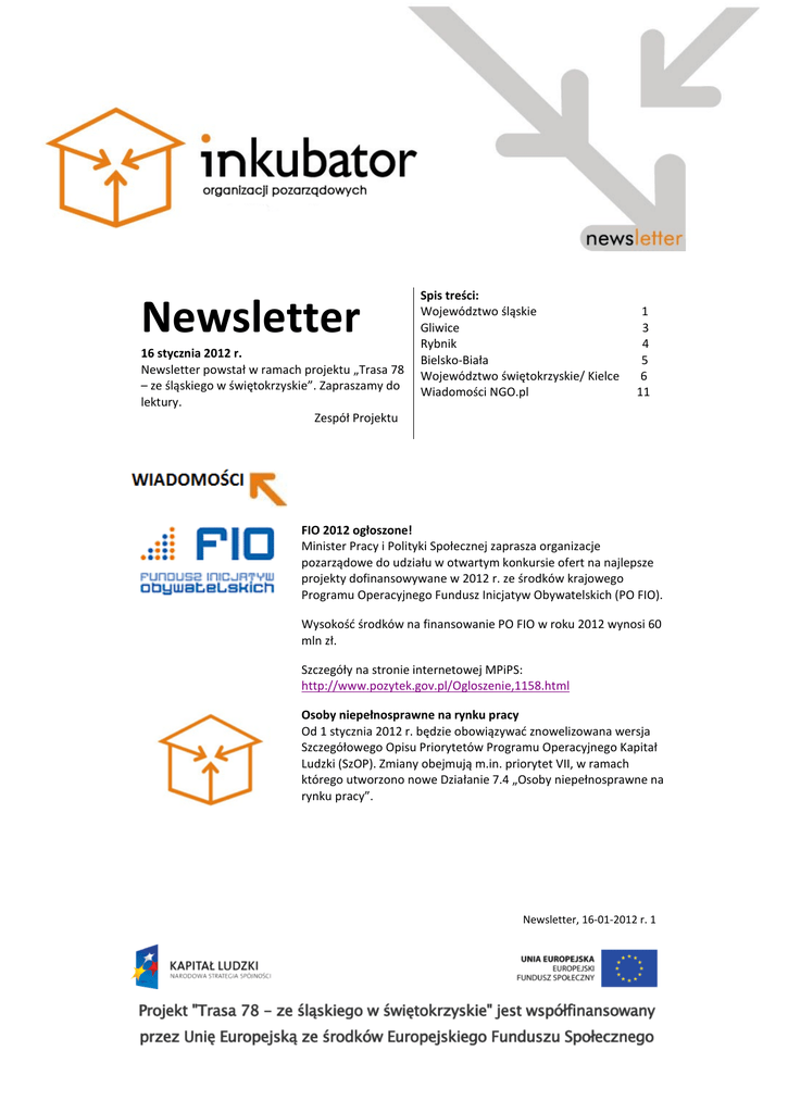 Newsletter 16 stycznia 2012 r. Newsletter powstał w ramach projektu „Trasa 78 – ze śląskiego w świętokrzyskie”. Zapraszamy do lektury. Zespół Projektu Spis treści: Województwo śląskie Gliwice Rybnik Bielsko-Biała Województwo świętokrzyskie/ Kielce Wiadomości NGO.pl 1 3 4 5 6 11 … FIO 2012 ogłoszone! Minister Pracy i Polityki Społecznej zaprasza organizacje pozarządowe do udziału w otwartym konkursie ofert na najlepsze projekty dofinansowywane w 2012 r. ze środków krajowego Programu Operacyjnego Fundusz Inicjatyw Obywatelskich (PO FIO). Wysokość środków na finansowanie PO FIO w roku 2012 wynosi 60 mln zł. Szczegóły na stronie internetowej MPiPS: http://www.pozytek.gov.pl/Ogloszenie,1158.html Osoby niepełnosprawne na rynku pracy Od 1 stycznia 2012 r. będzie obowiązywać znowelizowana wersja Szczegółowego Opisu Priorytetów Programu Operacyjnego Kapitał Ludzki (SzOP). Zmiany obejmują m.in. priorytet VII, w ramach którego utworzono nowe Działanie 7.4 „Osoby niepełnosprawne na rynku pracy”. Newsletter, 16-01-2012 r. 1 Działanie 7.4 obejmuje: 1. Programy aktywizacji społeczno-zawodowej osób niepełnosprawnych, obejmujące co najmniej dwie formy wsparcia spośród następujących: Poradnictwo psychologiczne i psychospołeczne, prowadzące do integracji społecznej i zawodowej; Kursy i szkolenia umożliwiające nabycie, podniesienie lub zmianę kwalifikacji i kompetencji zawodowych oraz rozwijanie umiejętności i kompetencji społecznych, niezbędnych na rynku pracy; Poradnictwo zawodowe; Pośrednictwo pracy; Zatrudnienie wspomagane obejmując wsparcie osoby niepełnosprawnej przez trenera pracy/asystenta zawodowego u pracodawcy; Staże i praktyki zawodowe; Subsydiowane zatrudnienie; Skierowanie do pracy w Zakładzie Aktywności Zawodowej i sfinansowanie kosztów zatrudnienia w ZAZ; Usługi społeczne przezwyciężające indywidualne bariery w integracji społecznej i powrocie na rynek pracy, w tym usługi asystenta osobistego. 2. Działania o charakterze środowiskowym, w tym w szczególności działania edukacyjne i integracyjne, mające na celu adaptację pracownika w środowisku pracy (jedynie łącznie z główną grupą docelową, czyli osobami niepełnosprawnymi). Działania na rzecz integracji europejskiej Urząd Marszałkowski ogłosił otwarty konkurs ofert na zadania publiczne Województwa Śląskiego w dziedzinie działań na rzecz integracji europejskiej oraz rozwijania kontaktów i współpracy między społeczeństwami w 2012 r. Termin składania ofert: od 10-1-2012 do 3-2-2012 Więcej: http://ngo.slaskie.pl/index.php?jezyk=pl&grupa=18&id=449&typ=1 &dzi=1 Newsletter, 16-01-2012 r. 2 Upowszechniania turystyki Urząd Marszałkowski ogłosił otwarty konkurs ofert na zadania publiczne w dziedzinie krajoznawstwa, w tym upowszechniania turystyki. Termin składania ofert: od 10-1-2012 do 3-2-2012 Więcej: http://ngo.slaskie.pl/index.php?jezyk=pl&grupa=18&id=448&typ=1 &dzi=1 … Gliwice. Mosty Kultury Ruszył projekt wizyty przygotowawczej osób pracujących z młodzieżą oraz samej młodzieży z Gliwic i Bottrop. Celem wizyty jest wymiana doświadczeń, pomysłów na międzynarodową współpracę oraz przygotowanie projektu młodzieżowych warsztatów artystycznych. Projekt jest realizowany przy wsparciu finansowym Komisji Europejskiej w ramach Programu Młodzież w Działaniu. Data: 02.01-02.04.2012 Miejsce: Centrum Organizacji Kulturalnych Gliwickiego Centrum Organizacji Pozarządowych, ul. Studzienna 6, 44-100 Gliwice Więcej: www.perelka.gcop.gliwice.pl Gliwice. Konkurs w dziedzinie profilaktyki i rozwiązywania problemów alkoholowych Prezydent Miasta Gliwice ogłosił otwarty konkurs ofert na realizację zadań publicznych Miasta Gliwice w dziedzinie profilaktyki i rozwiązywania problemów alkoholowych. Dotowane z budżetu miasta będą tylko zadania realizowane na rzecz mieszkańców miasta Gliwice. Oferty na realizację zadania należy składać w formie pisemnej do dnia 02.02.2012 r. w siedzibie Urzędu Miejskiego w Gliwicach (ul. Zwycięstwa 21 w biurze podawczym) lub przesłać pocztą na adres Urzędu Miejskiego w Gliwicach (44-100 Gliwice, ul. Zwycięstwa 21). Więcej: http://www.gcop.gliwice.pl/php/index.php?option=com_content&t ask=view&id=746&Itemid=116 .… Newsletter, 16-01-2012 r. 3 Czernica. Szkolenie z nowoczesnych form aktywizacji 17 stycznia 2012 r. dla mieszkańców i przedstawicieli instytucji działających na terenie gmin Lyski, Gaszowice i Jejkowice odbędzie się bezpłatne szkolenie pt. „Nowoczesne formy aktywizacji w społeczności lokalnej – jak zorganizować wydarzenie na rzecz i z udziałem lokalnych społeczności”. Data: 17 stycznia 2012 r. Godzina: 15.00 Miejsce: Ośrodek Kultury „Zameczek” w Czernicy (ul. Wolności 39). Więcej: http://www.cris.org.pl/informacje/wszystkie/zobacz/Czernica-Szkolenie-z-nowoczesnych-form-aktywizacji Kuźnia Raciborska. Szkolenie z nowoczesnych form aktywizacji 24 stycznia 2012 r. o godzinie 15.00 w urzędzie miasta Kuźnia Raciborska odbędzie się szkolenie pt. „Nowoczesne formy aktywizacji w społeczności lokalnej – jak zorganizować wydarzenie na rzecz i z udziałem lokalnych społeczności”. Data: 24 stycznia 2012 r. Godzina: 15.00 Miejsce: Urząd Miasta Kuźnia Raciborska (ul. Słowackiego 4, sala nr 3, I piętro) Więcej: http://www.cris.org.pl/informacje/wszystkie/zobacz/KuzniaRaciborska-Szkolenie-z-nowoczesnych-form-aktywizacji Rybnik. Ogłoszenie o konkursach dla NGO Prezydent Miasta Rybnika ogłosił otwarte konkursy ofert dla organizacji pozarządowych i innych podmiotów na wsparcie realizacji zadań publicznych w 2012 roku w obszarze: działalność na rzecz integracji europejskiej oraz rozwijania kontaktów i współpracy między społeczeństwami oraz pomoc Polonii i Polakom za granicą. Oferty należy składać do 10 lutego br. w Kancelarii Urzędu Miasta Rybnika. Więcej: http://www.rybnik.pl/index.php?id=223&p=news,11,show,6277 